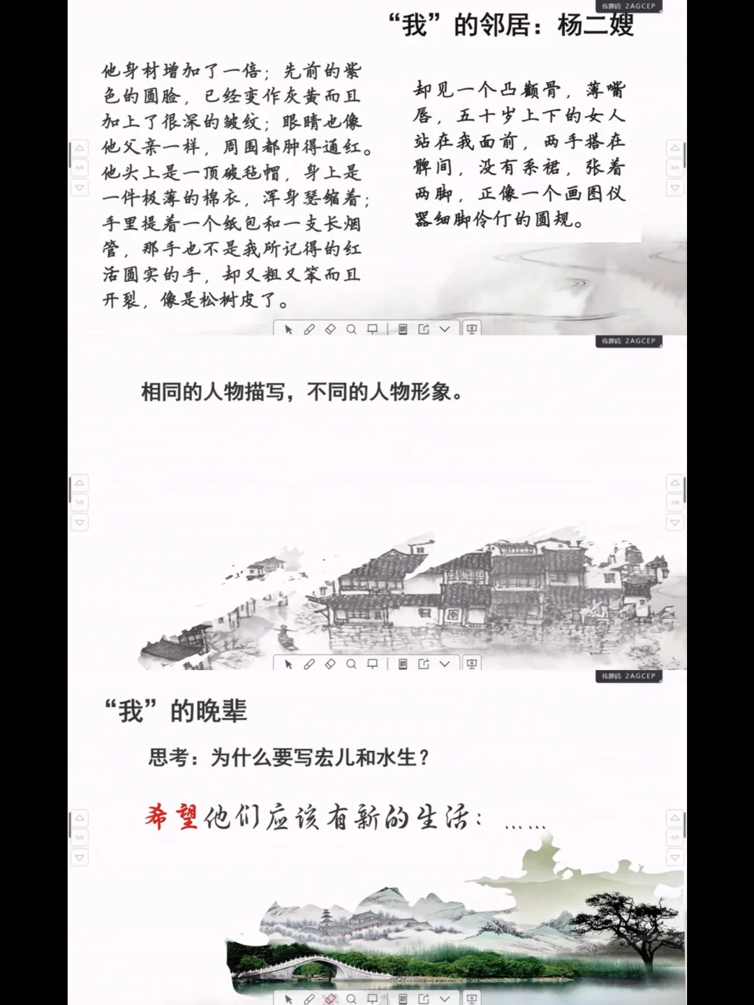 2️⃣之前教学选择性忽略了除杨二嫂之外的邻居,徐老师先引导学生从人物描写角度把握了闰土和杨二嫂的人物形象,迁移分析人物形象的方法再来把握其他邻居的形象,从灰堆里的碗碟是谁埋的这一桩公案里挖出可能是其他邻居,引导学生找到证据:“来客也不少,有送行的,有拿东西的,有送行兼拿东西的”“这些人说买不起,顺手也就拿了”“这老屋里的所有破旧大小粗细的东西已经一扫而空了”。表明故乡的很多人都像杨二嫂一样已经不再淳朴善良了,民众都是如此的势力,辛苦,原因是社会黑暗,穷困潦倒