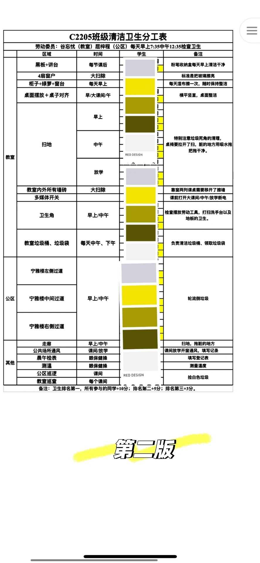 🥹每周一到周五固定学生打扫卫生式:表格看着清晰明确,安排人员到位,但是结果就是每天早自习都要去催!总是不记得自己是周几打扫卫生。