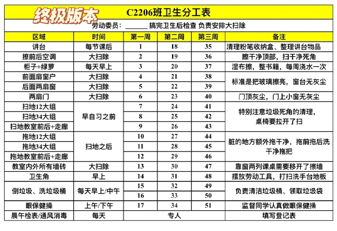 😎终于摸索到适合50人左右的班级卫生表了(适合班级人数多),全班分为三组人,每组15-17人,一周一组人,循环轮流打扫班级卫生。