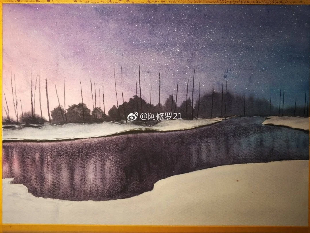 水彩。静谧的夜。