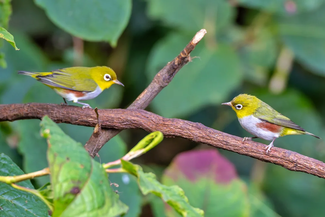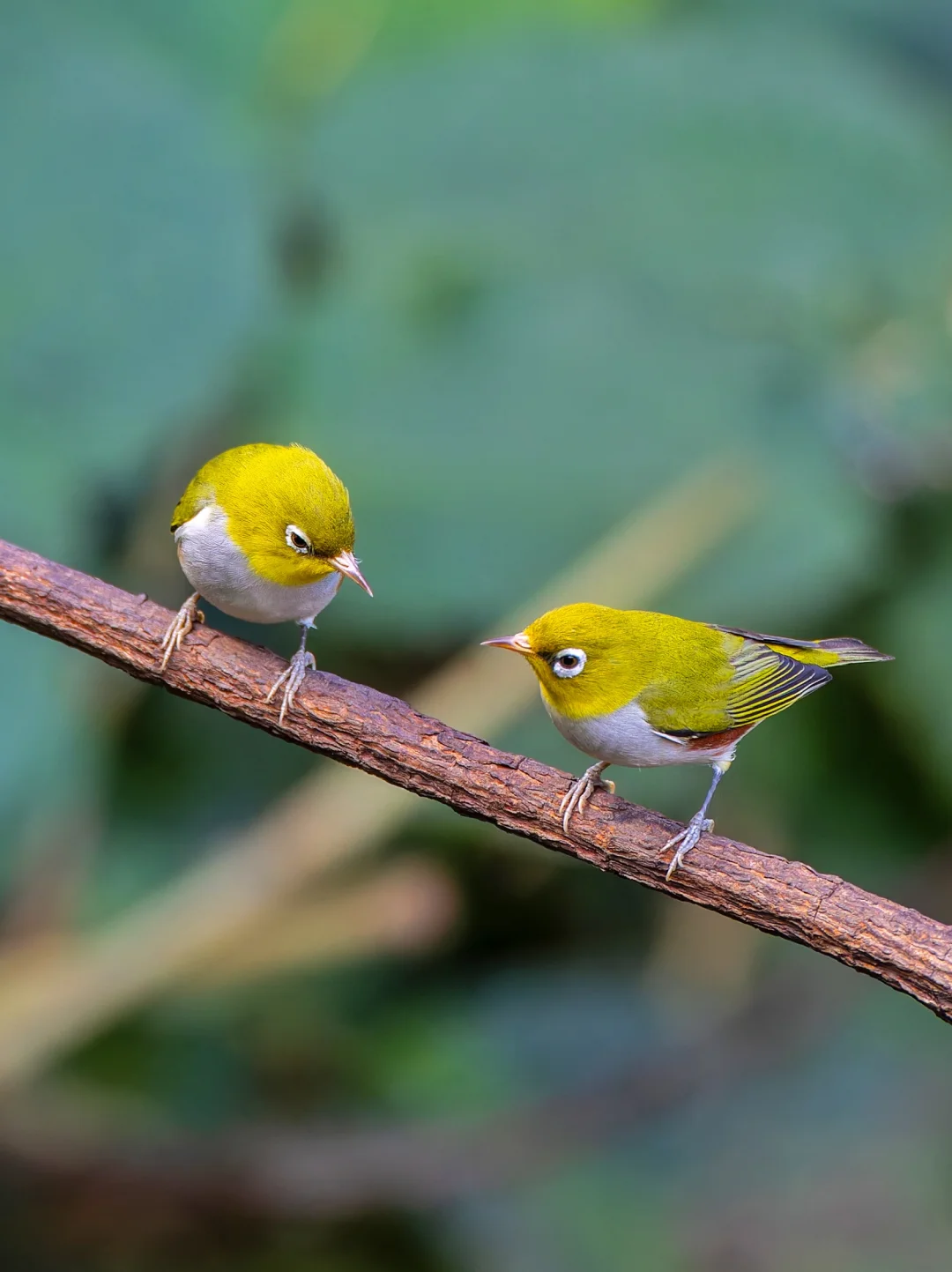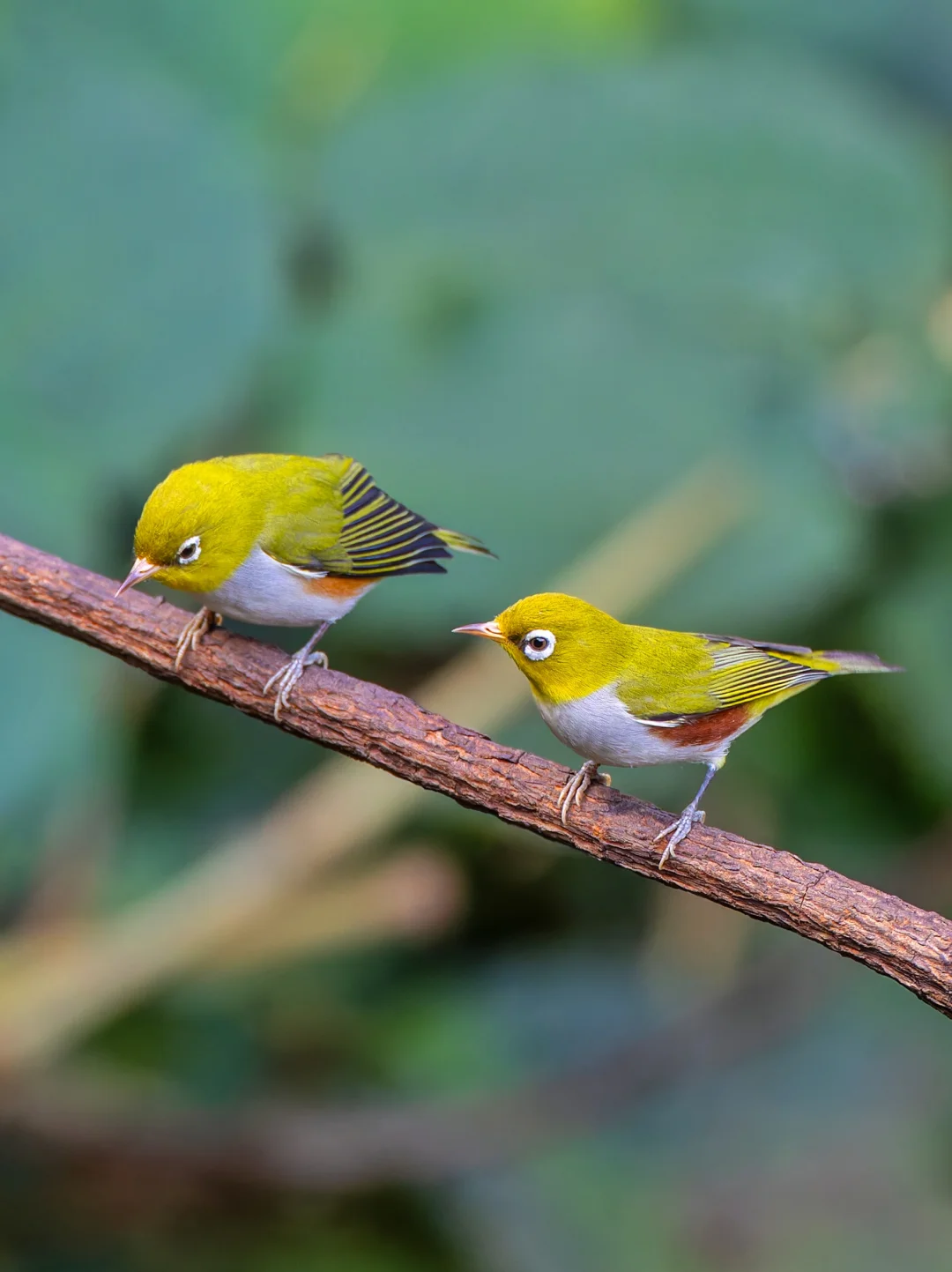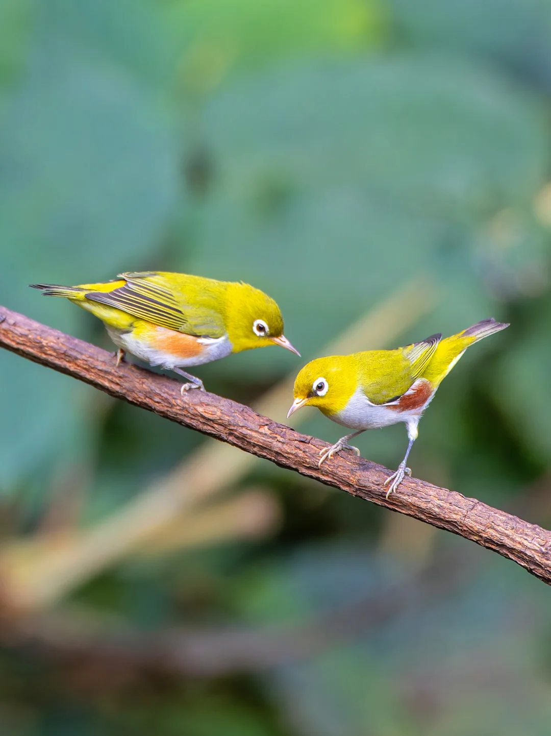 原创拍摄鸟人集合 红胁绣眼鸟,Chestnut-flanked White-eye,雀形目绣眼鸟科绣眼鸟属。 红胁绣眼鸟这对小情侣太甜了!黄绿相间的羽毛像穿了件小礼服,站在枝头叽叽喳喳,仿佛在说悄悄话。它们的小脑袋一凑近,画面瞬间萌化人心。