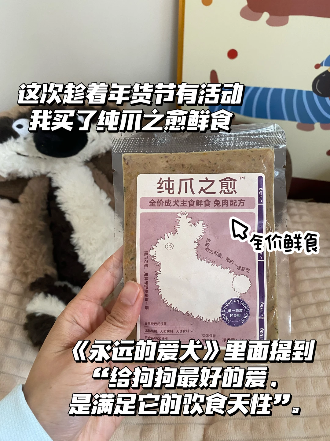 我选的是纯爪之愈的鲜食餐包,之前就了解到鲜食对狗狗健康长寿有很多好处✅看《永远的爱犬》里面就提到“给狗狗最好的爱,是满足它的饮食天性”。这次趁着年货节有活动,算下来价格很合适,也是赶在快递停运前买回来了!