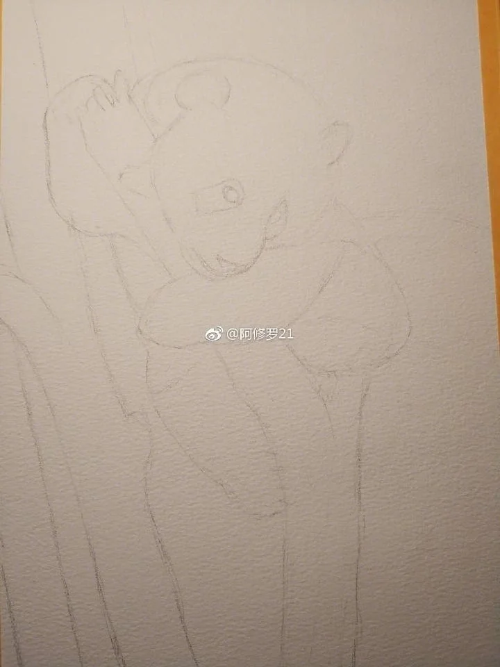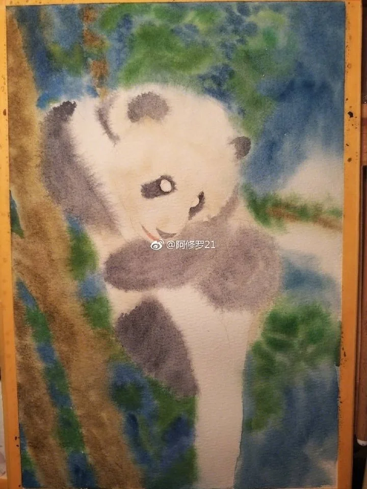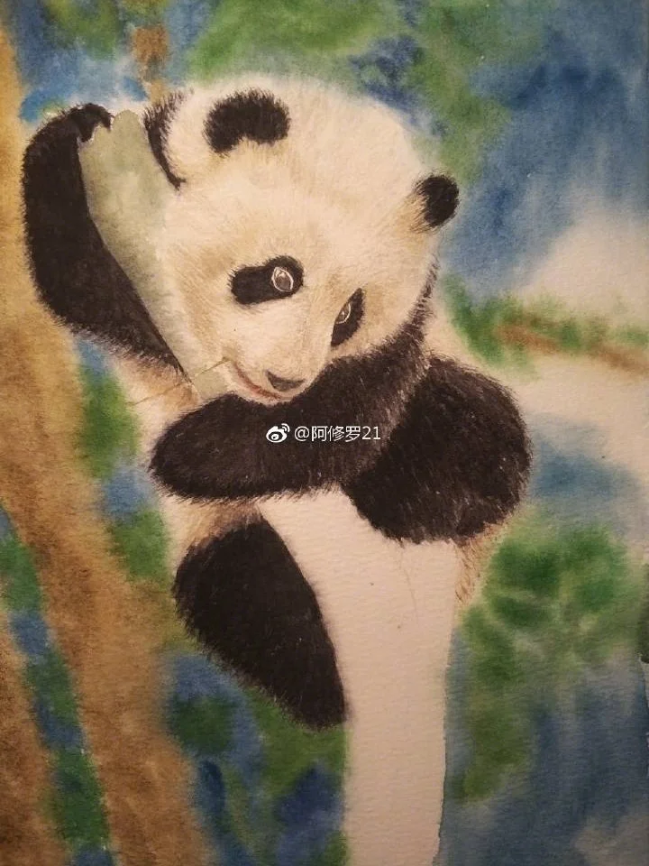 水彩大熊猫。树梢上的滚滚。