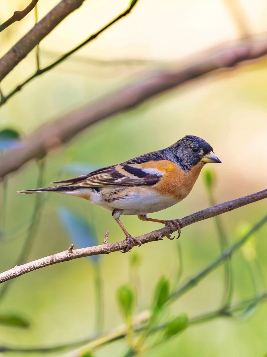 燕雀,Brambling,雀形目燕雀科燕雀属。燕雀有更明显的头部和胸部色彩,以及独特的白色臀部。在繁殖季雄鸟羽色非常醒目,但是由于在我国见到的大部分是冬候鸟,所以颜色略暗淡。