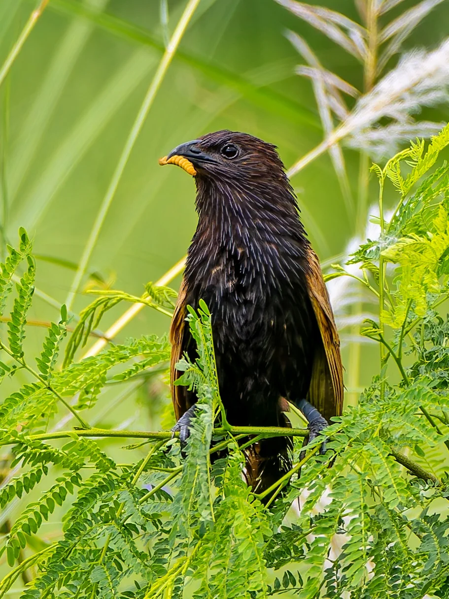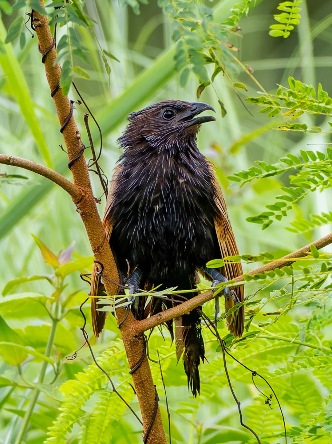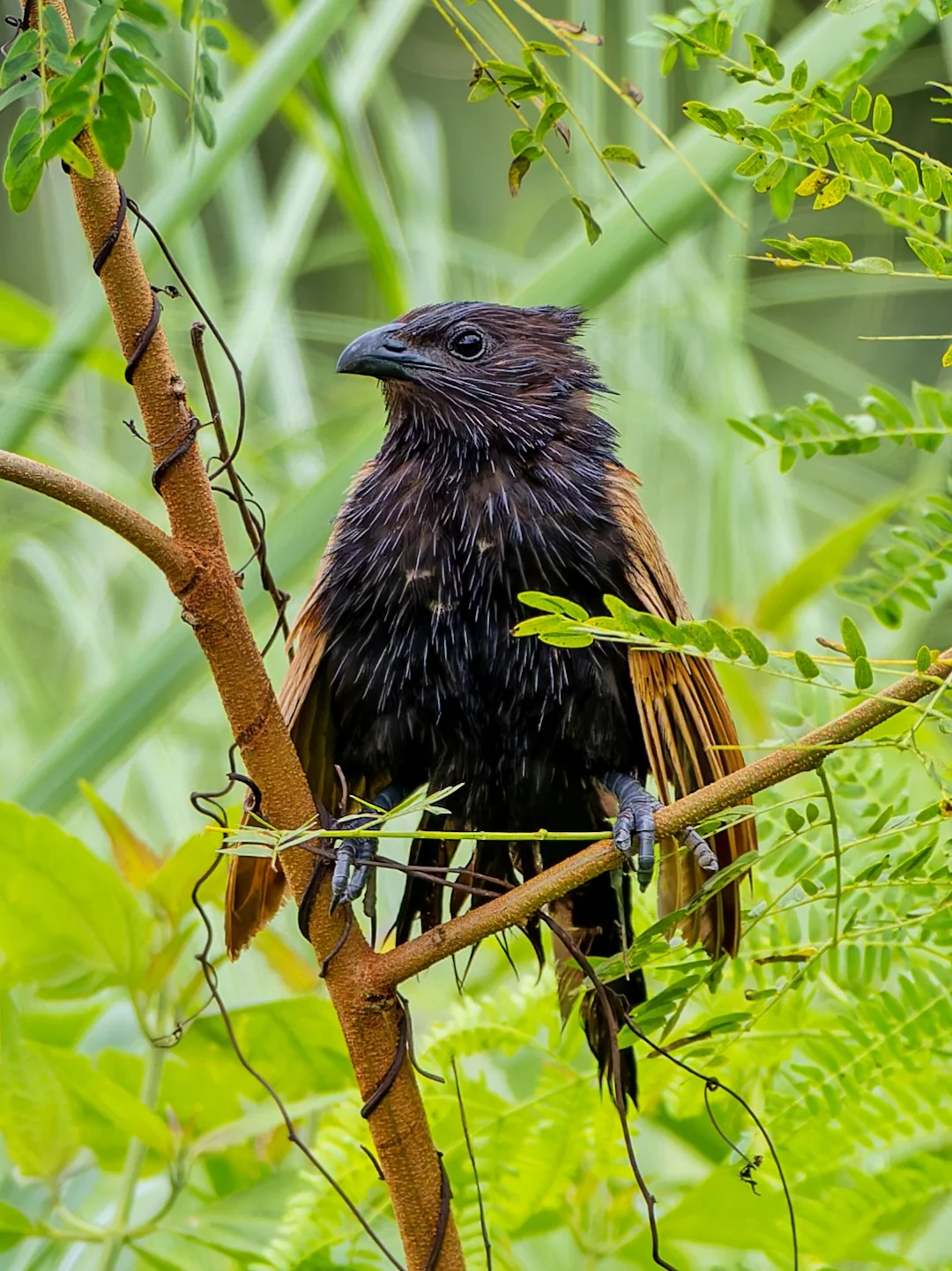 原创拍摄 鸟人集合 小鸦鹃,Lesser Coucal,鹃形目杜鹃科鸦鹃属。国家二级保护动物。分布在我国南方地区。 小鸦鹃成鸟总体深色,翅膀栗色,虹膜是深色的区别于褐翅鸦鹃的血红色眼睛。 这只在稻田里看到的小鸦鹃,体羽羽轴带银色,从清晨湿漉漉的草丛钻出来,更是像身上带着一根根银针。这身“银针战袍”太吸睛了。