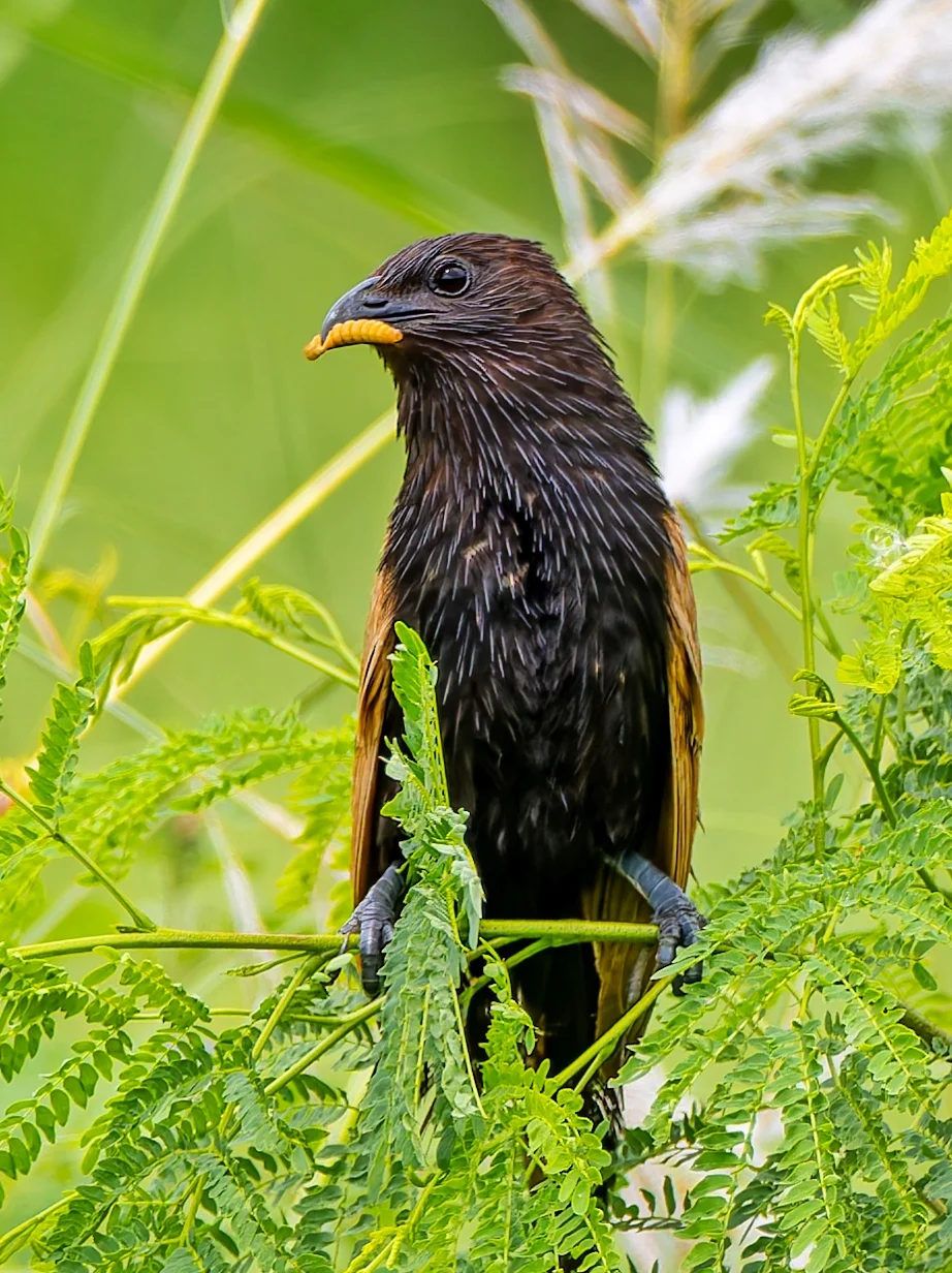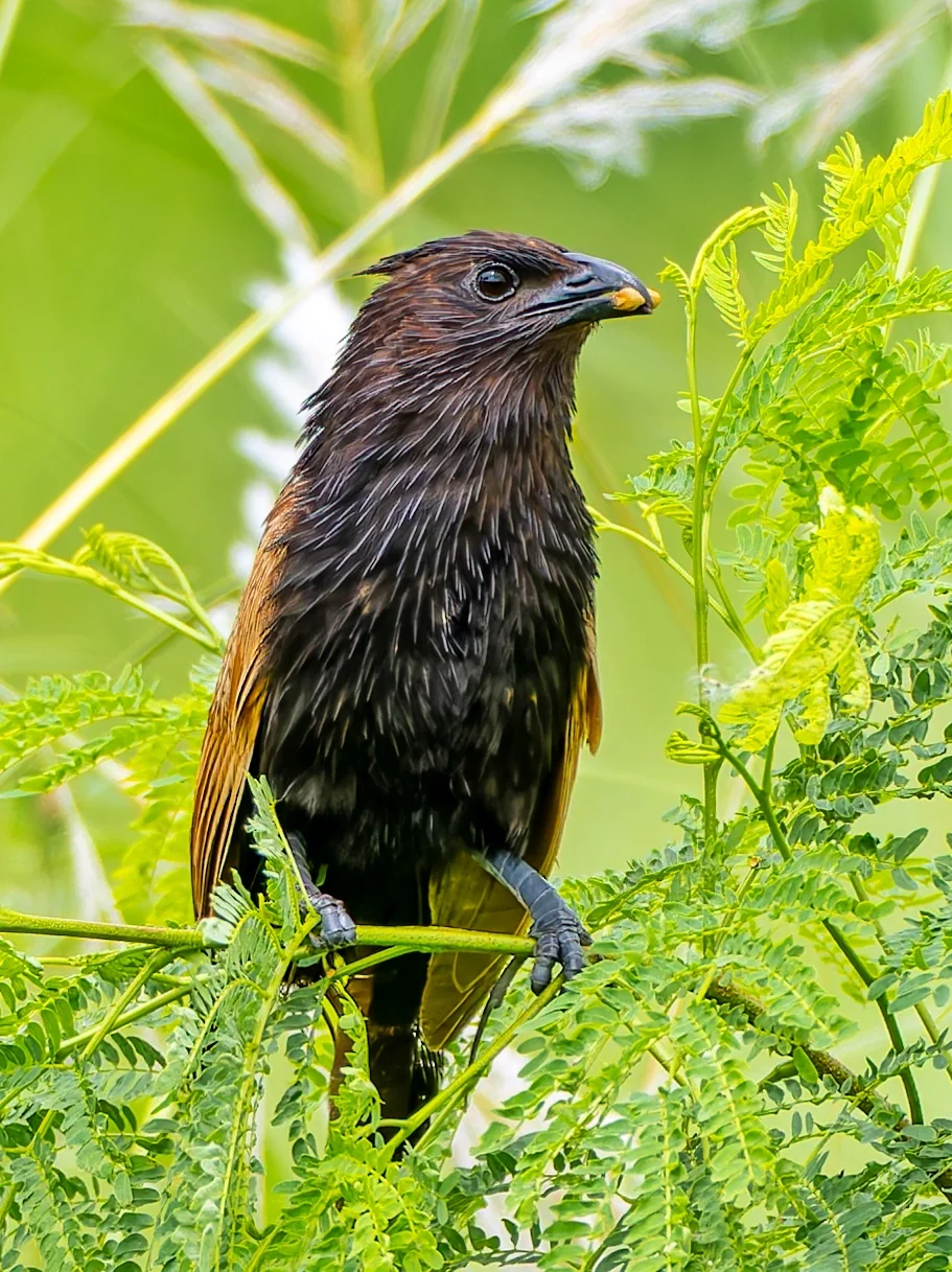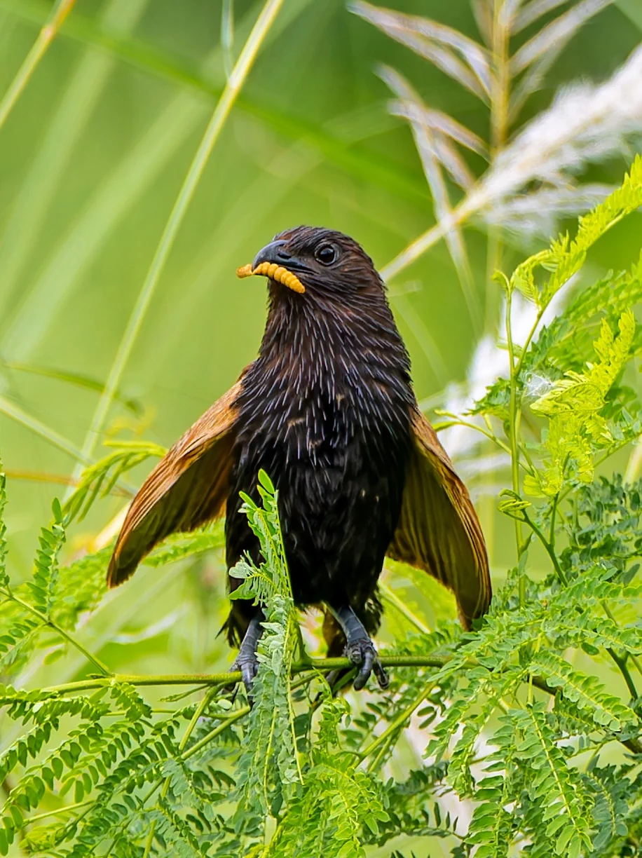 原创拍摄 鸟人集合 小鸦鹃,Lesser Coucal,鹃形目杜鹃科鸦鹃属。国家二级保护动物。分布在我国南方地区。 小鸦鹃成鸟总体深色,翅膀栗色,虹膜是深色的区别于褐翅鸦鹃的血红色眼睛。 这只在稻田里看到的小鸦鹃,体羽羽轴带银色,从清晨湿漉漉的草丛钻出来,更是像身上带着一根根银针。这身“银针战袍”太吸睛了。