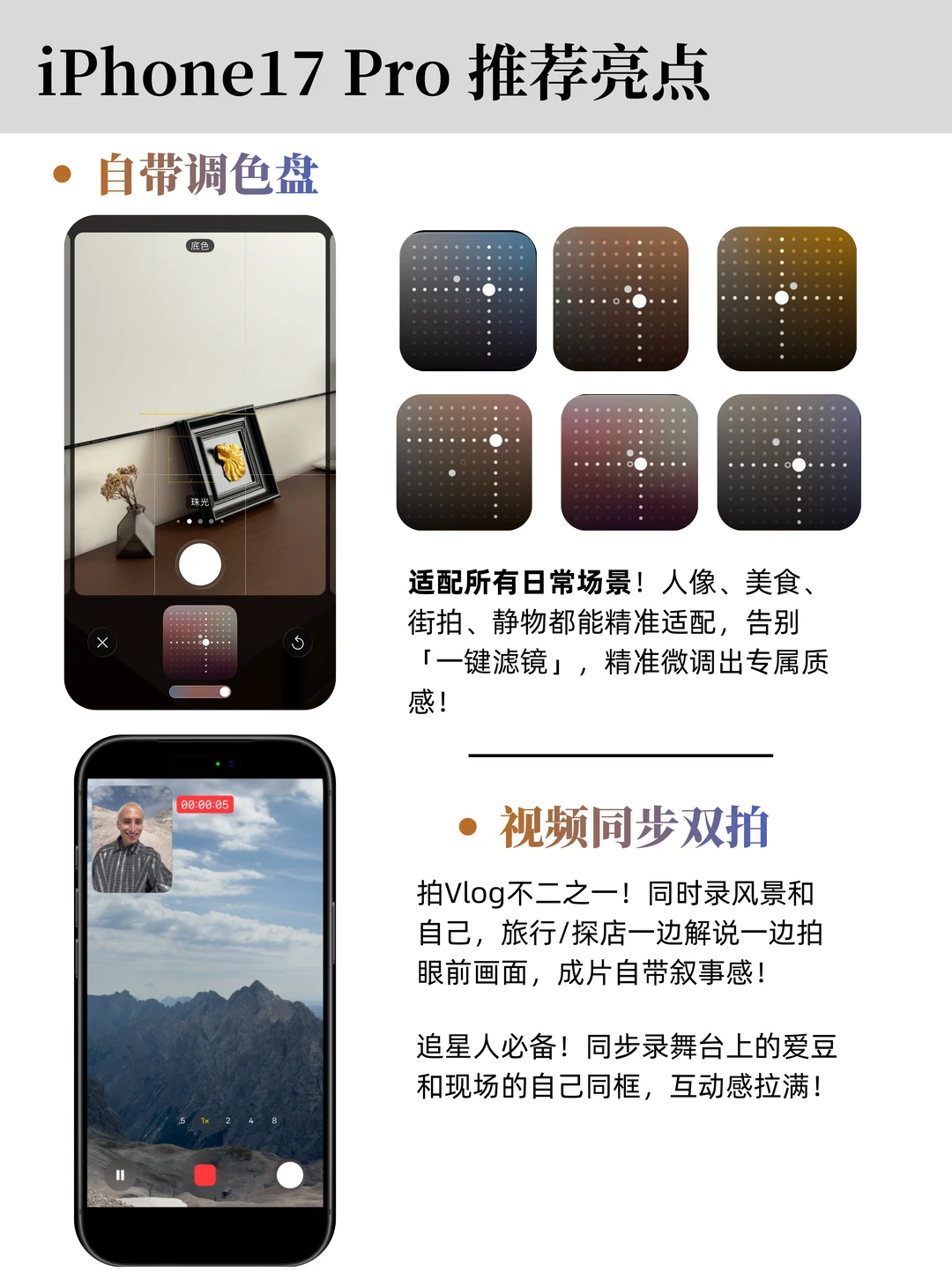 17Pro芯片流畅度拉满,全天候显示和灵动岛日常用着超顺手,独立按键一键抓拍,年夜饭、烟花随手按就拍到;