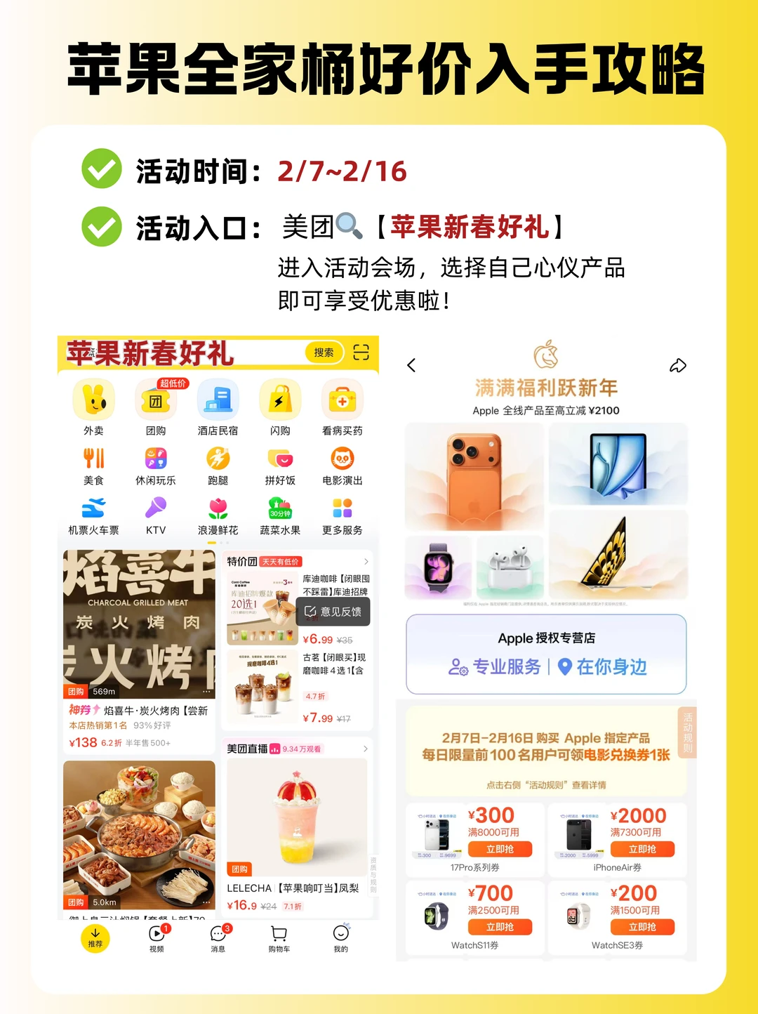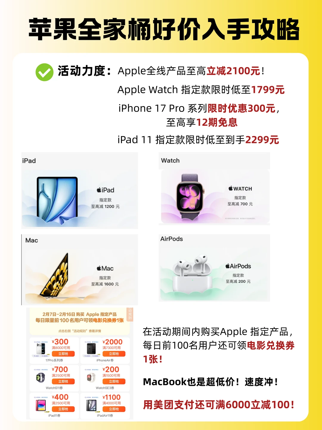 2月7日~2月16日,丑团🔍【苹果新春好礼】,所有产品官方正品保证,30分钟送达,当天想买当天到手。而且价格比日常香太多啦!全线产品至高优惠¥2100,用美团支付满6000还可以立减100!下单即可享优惠,速冲不亏!