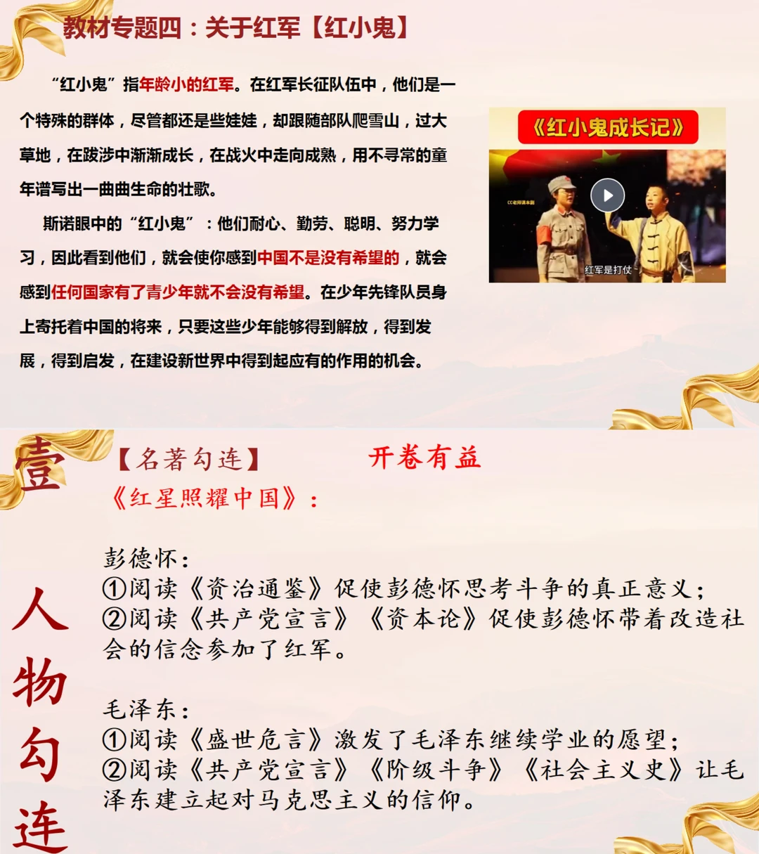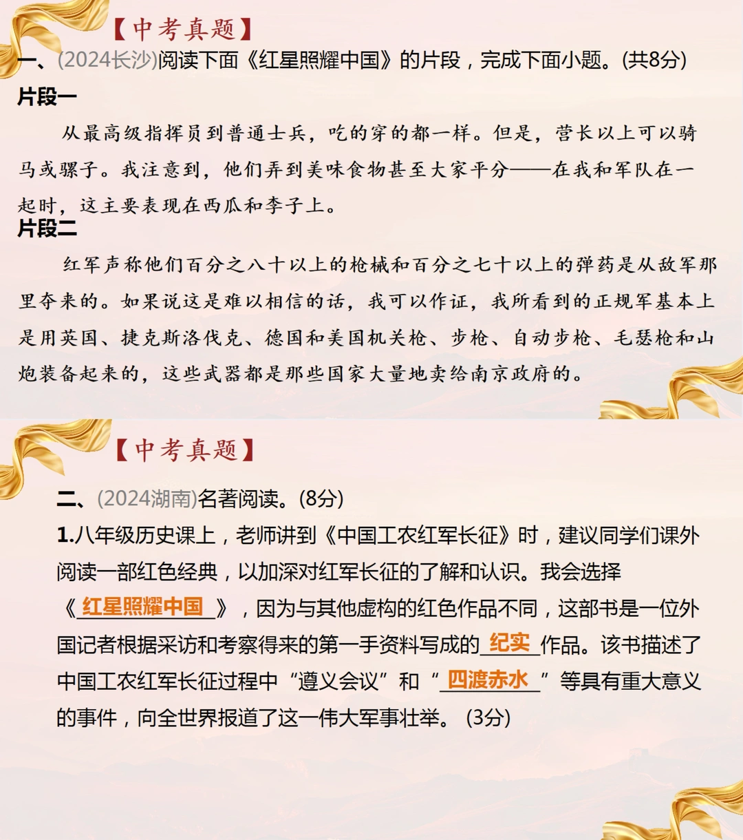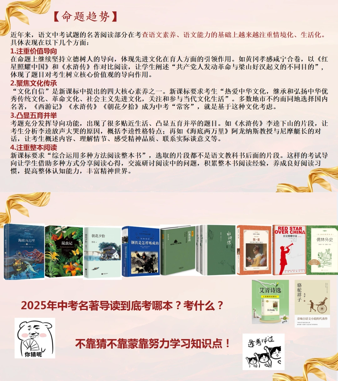开始更新中考名著导读,一般的地区是6—8分,考查选择题和简答题,比起字音字形的两分选择题,这6到8分分值很大了,所以都要好好复习去,时间不够的情况下,先复习重点篇目,去年只是做了简单的考题梳理,回顾的时候竟然发现压中了《红星照耀中国》🇨🇳 今年的名著导读重点关注名著的主旨、人物、情节,在复习的时候插入视频引起学生关注,学写结合找了一些题目//真题让学生完成,还有十几天的课了,一起加油吧~