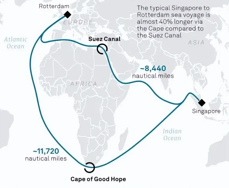 不过改道势必会带来时间和费用上的增加,绕过非洲最南端的好望角将增加大约3400海里航程,或大约14天。
