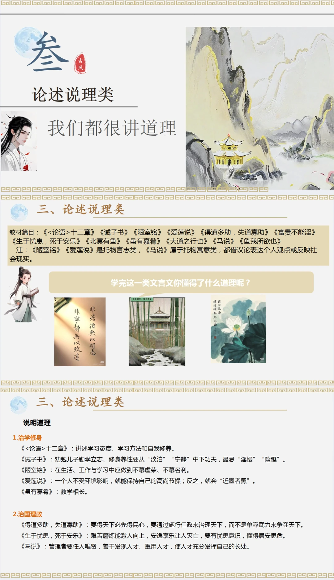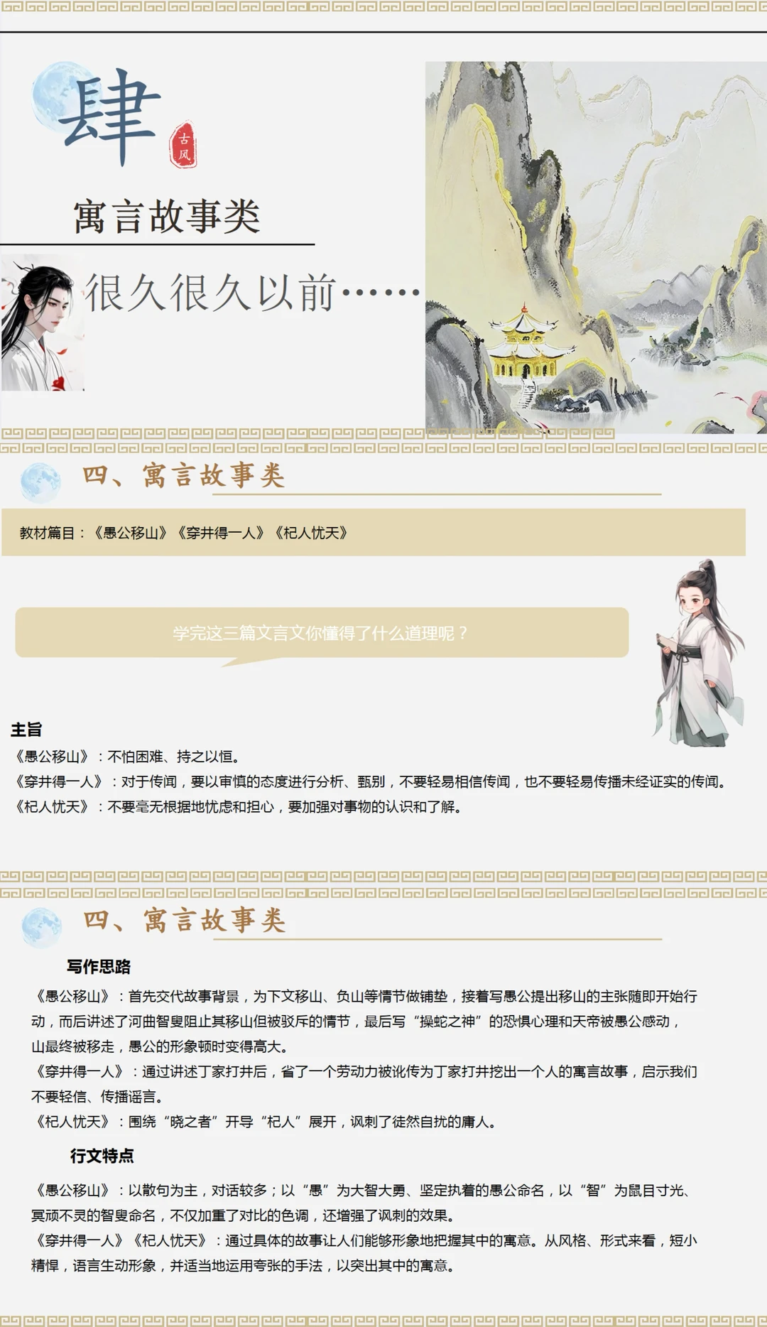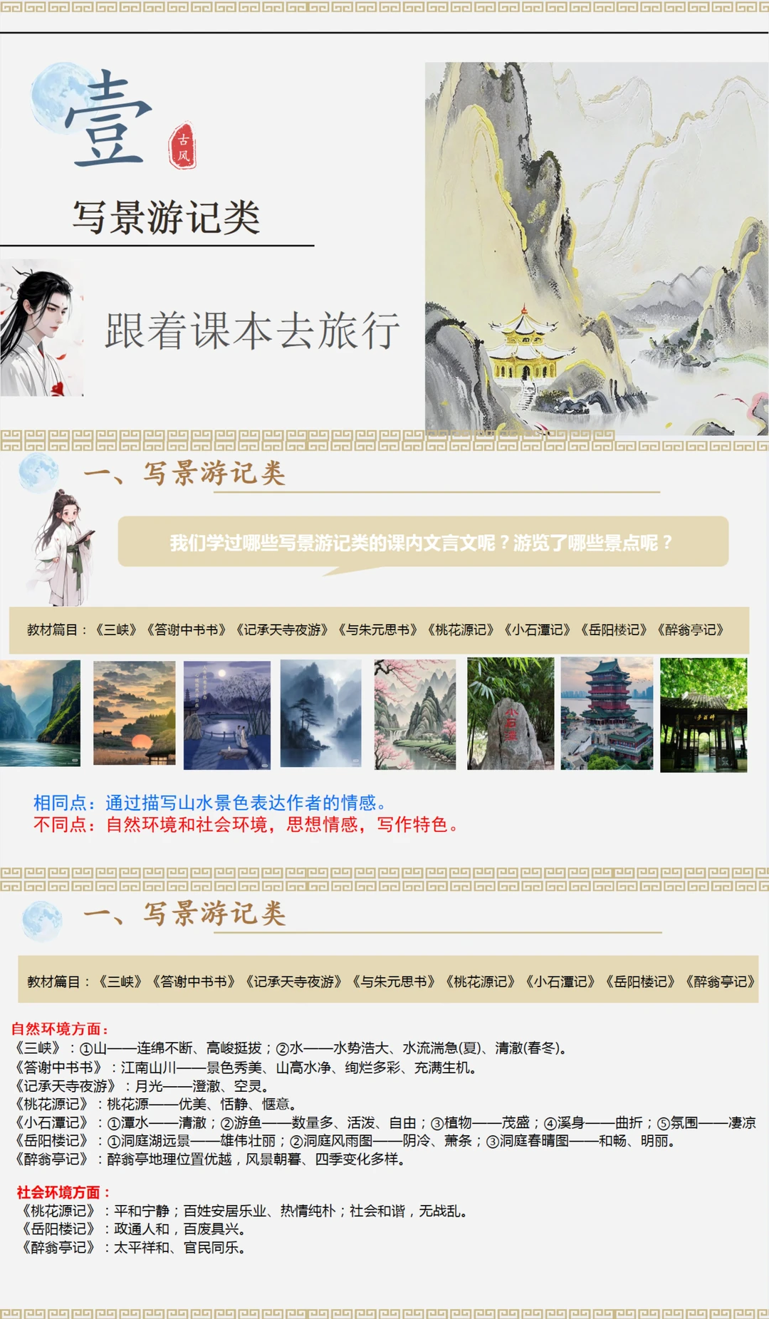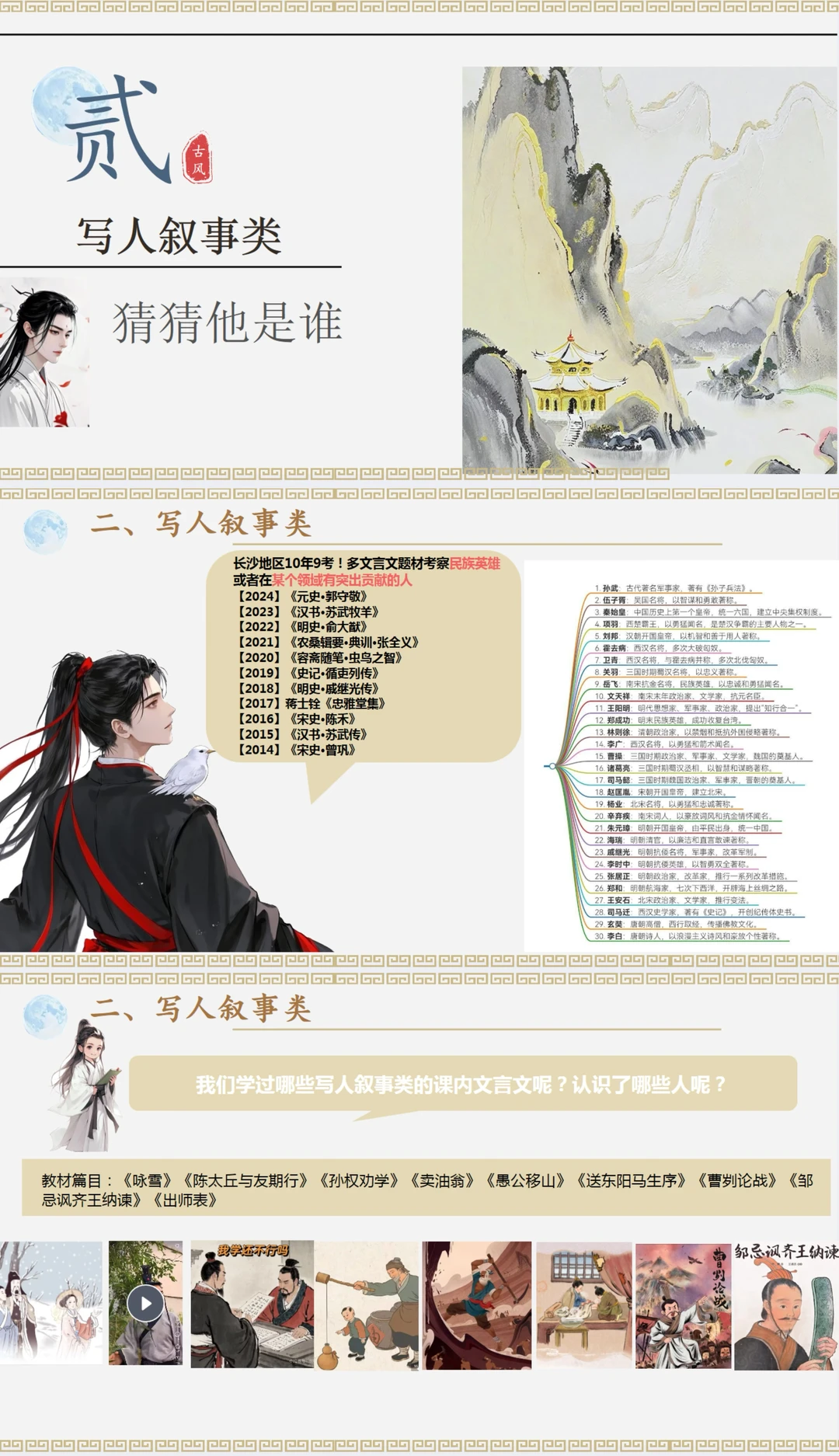 创设情景:穿越了 选择角色:游士、史官、谋士、神仙 角色对应四大文言文类别:写景游记、写人叙事、论述说理、寓言故事 增加了各种互动性问题和视频图片,内容更有趣~