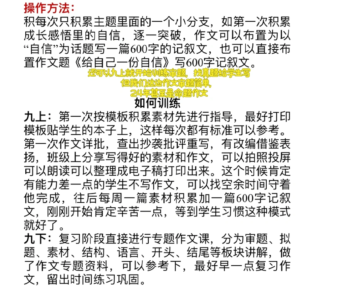大思路就是九上按要求积累素材➕九下系统教审题、拟题、结构、一个素材多用、语言、打磨开头结尾