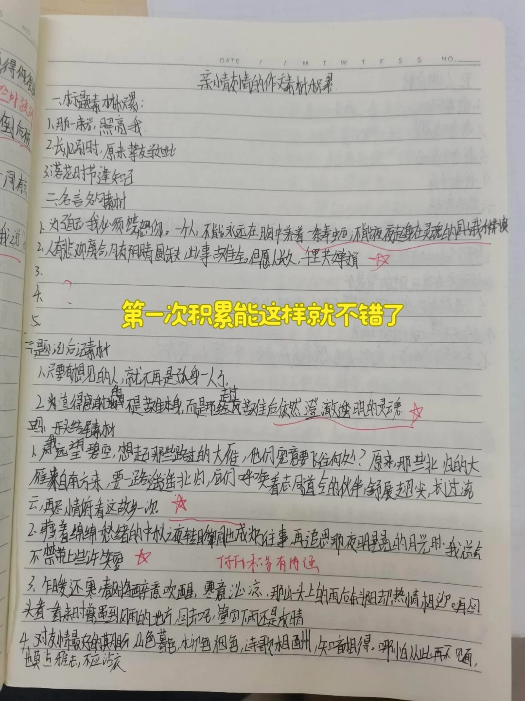 1️⃣九上:每周积累一次素材,一次作文练习,第一次按模板积累素材先进行指导,最好打印模板贴学生的本子上,这样每次都有标准可以参考。第一次作文详批,查出抄袭批评重写,有改编借鉴表扬,班级上分享写得好的素材和作文,可以拍照投屏可以朗读可以整理成电子稿打印出来。刚刚开始肯定辛苦一点,等到学生习惯这种模式就好了。