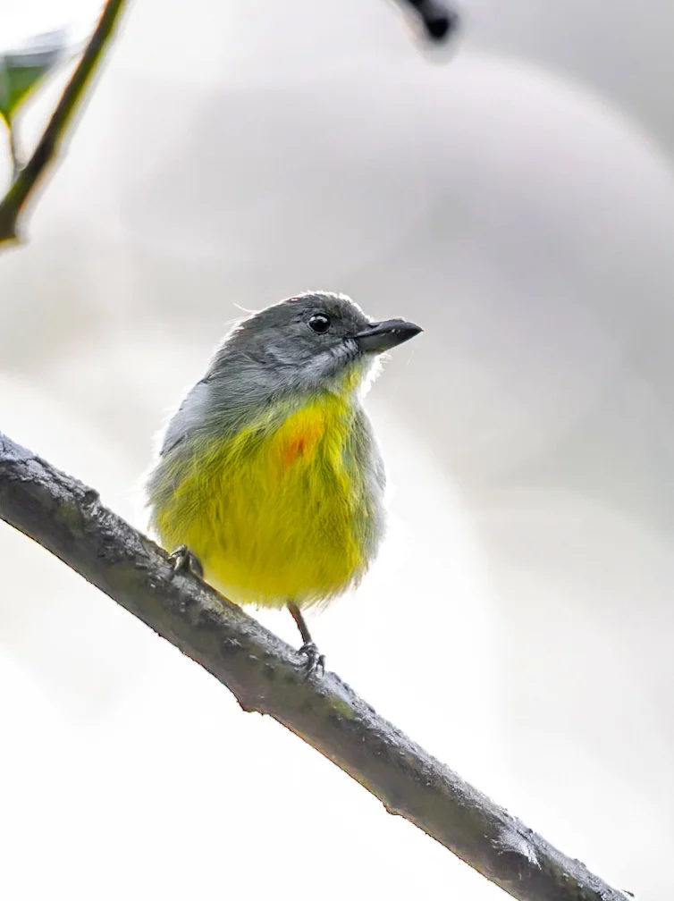 原创拍摄 鸟人集合 巴拉望啄花鸟,Palawan Flowerpecker,雀形目啄花鸟科锯齿啄花鸟属。菲律宾巴拉望岛及其邻近岛屿特有种。 这种可爱小鸟雄鸟黄色喉部和胸部带红斑,很是漂亮。雌鸟颜色较为暗淡。 这抹亮黄简直像把阳光穿在了身上,胸前的橙色绒毛软得仿佛能捏出汁水,小脑袋一歪萌翻全场!它站在枝头的样子,比任何滤镜都更治愈人心。 不过小鸟太小,活动又太快,还在树冠层,拍摄时机太少了。