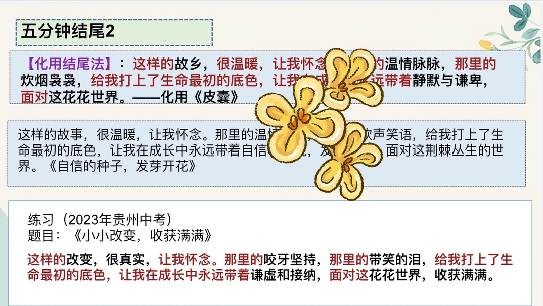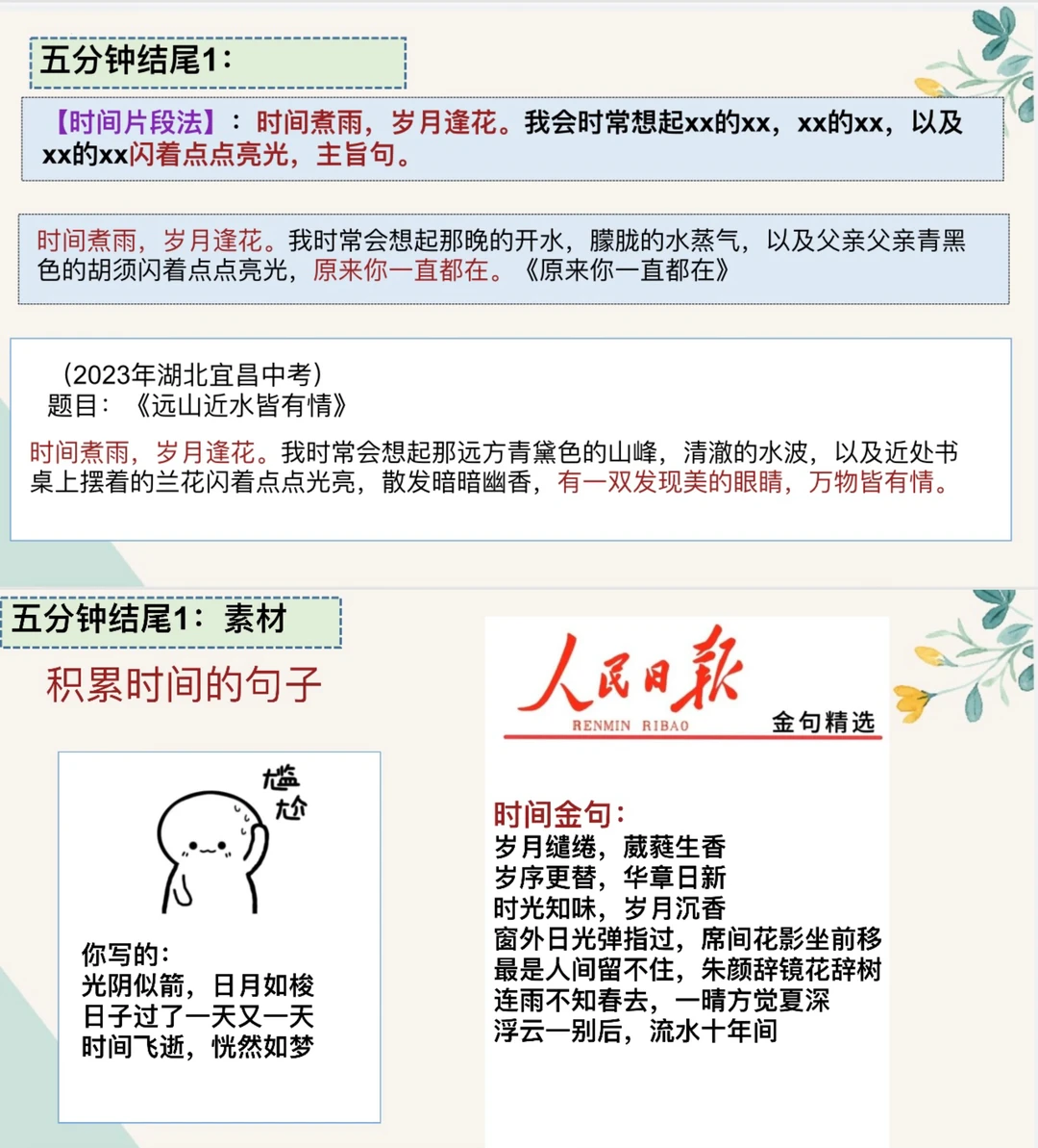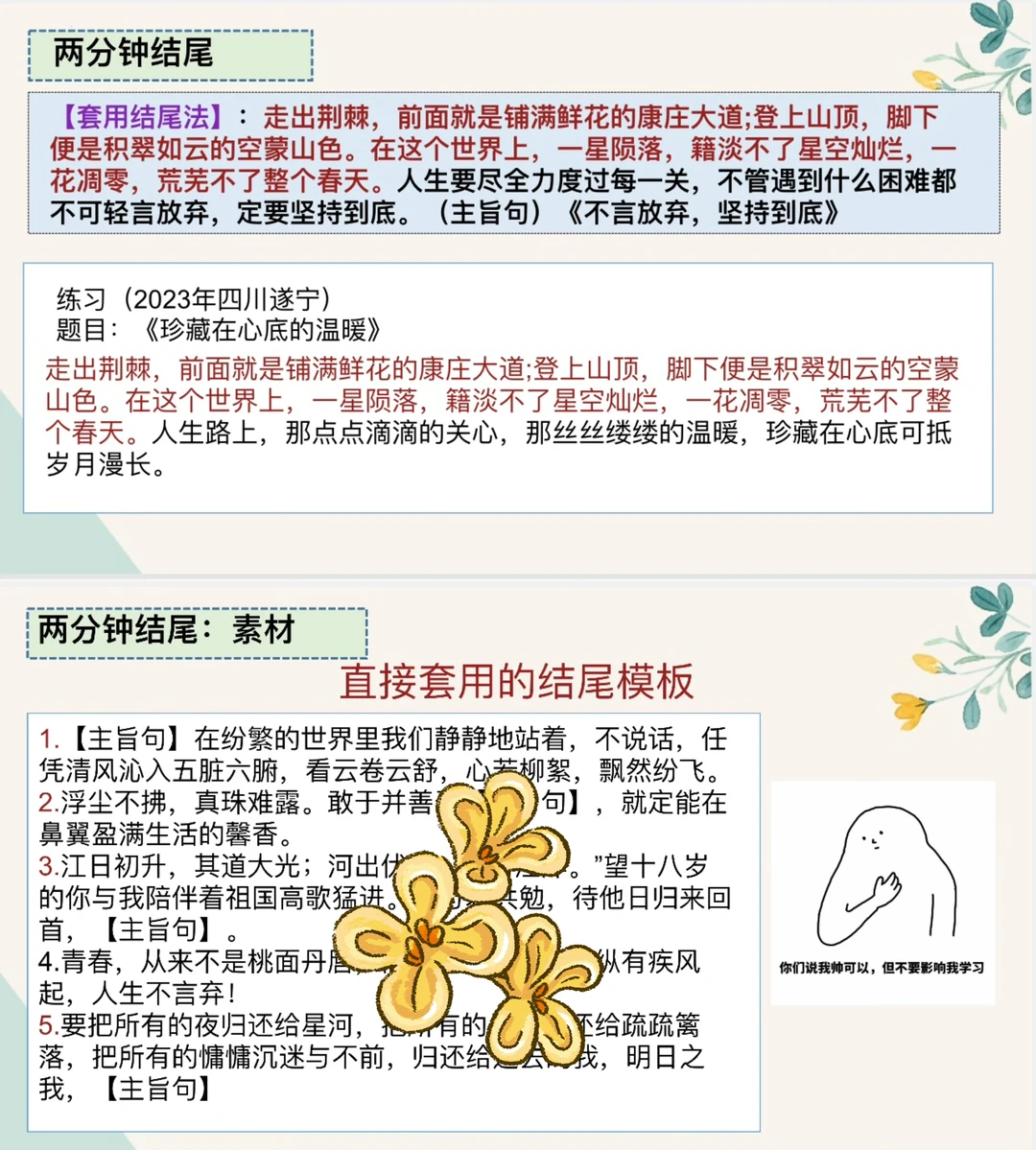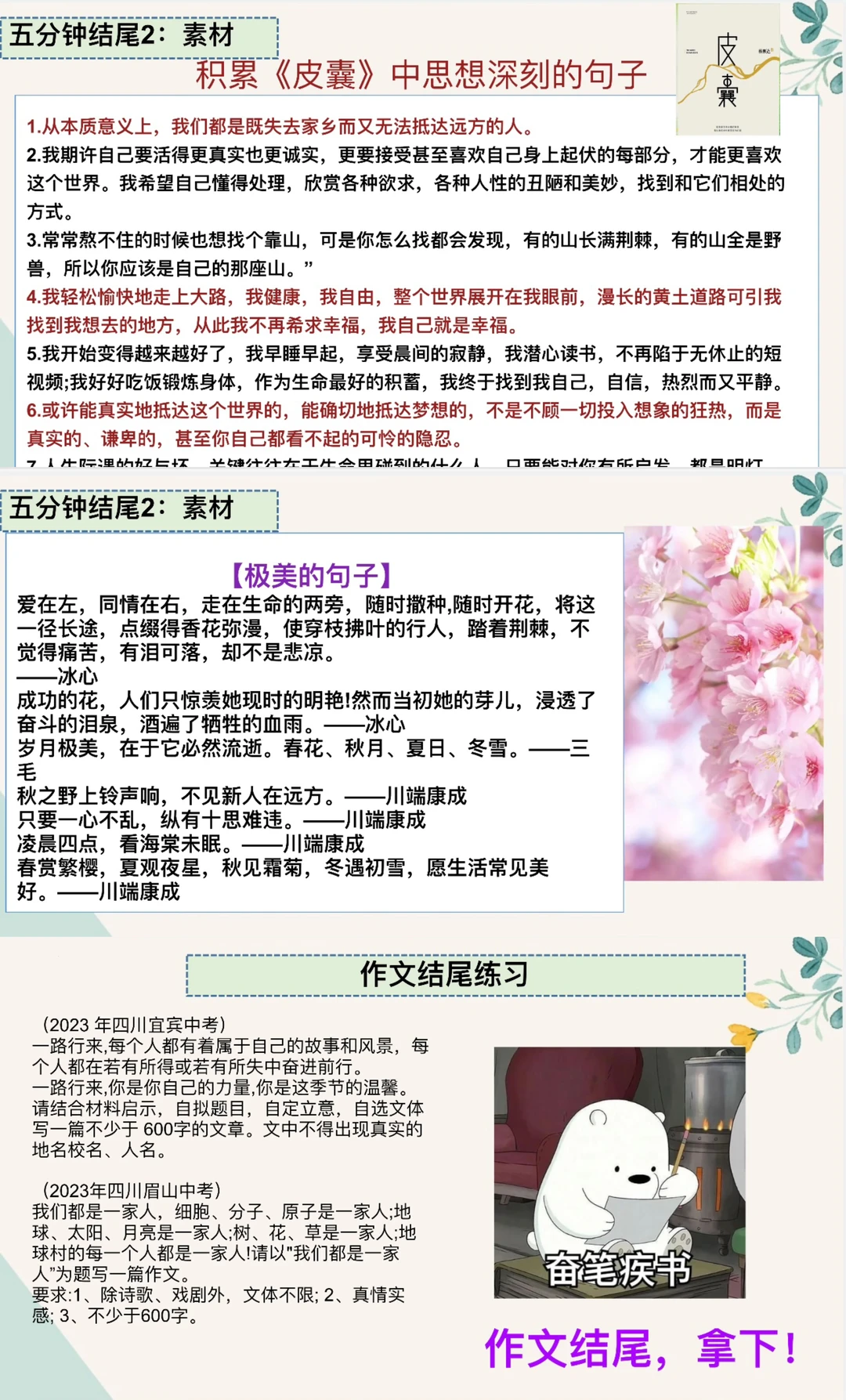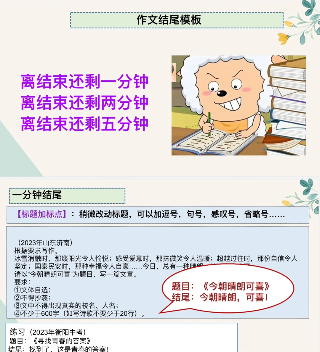 近期一直在模考,发现学生120分钟写120分的中考语文模拟题根本写不完,每次作文最多半个小时搞定[失望R]作文结尾尤其“潦草”,这个潦草是自己潦草,也是结尾敷衍,打算讲一下作文结尾,基本上就是三个方法: 🩵标题加标点法 🩵套用结尾法(套话➕主旨句) 🩵化用结尾法