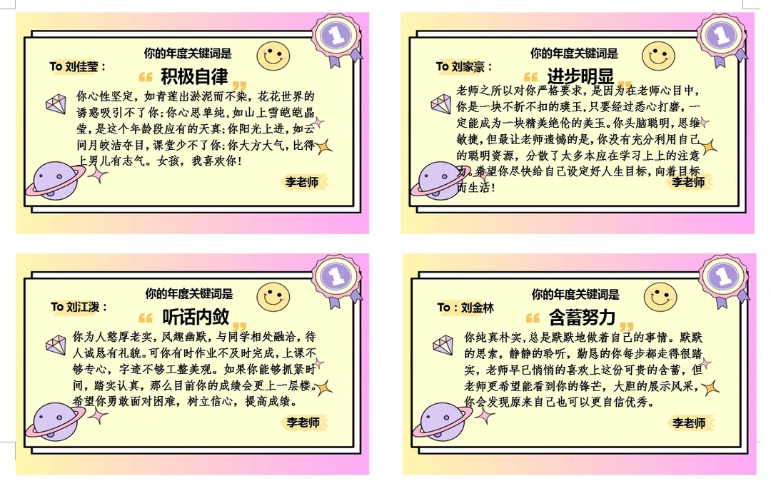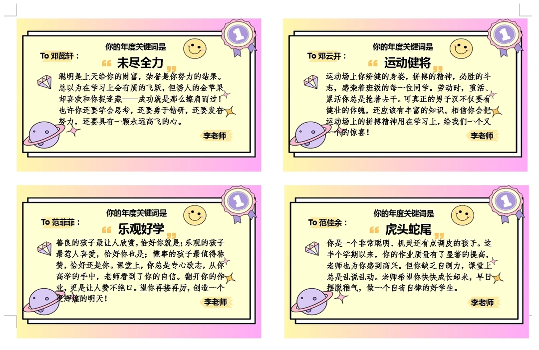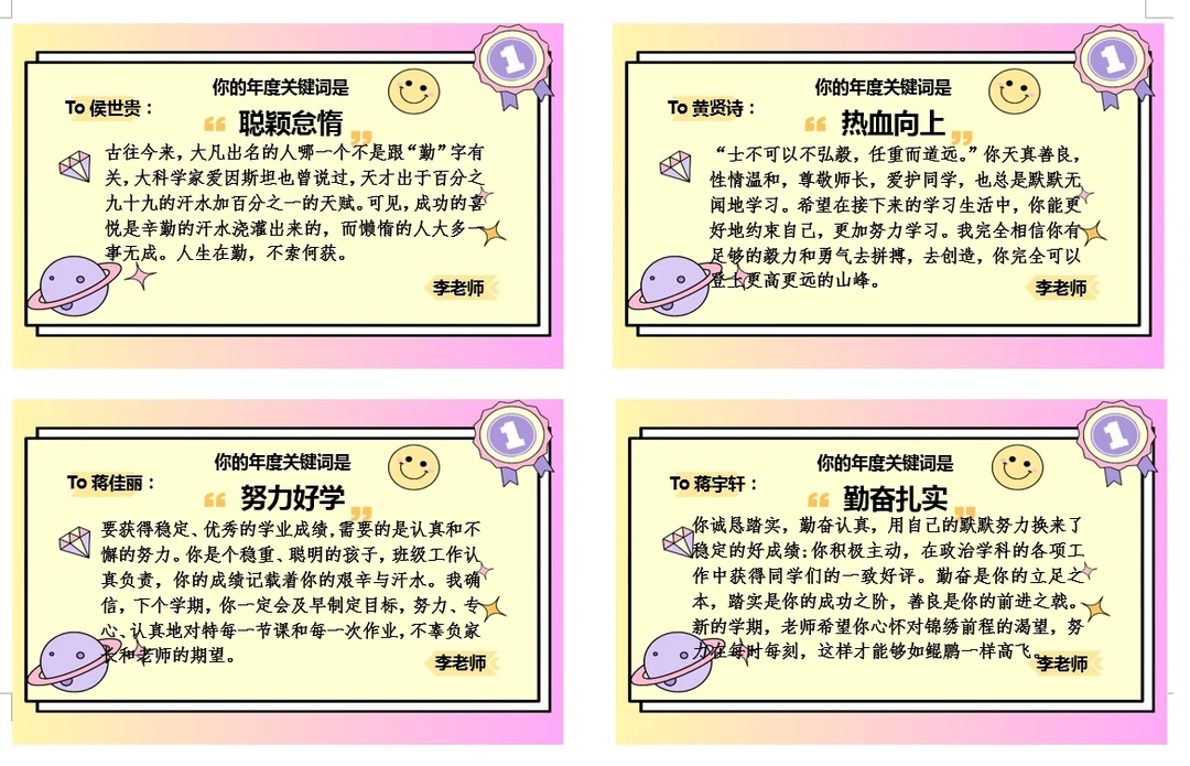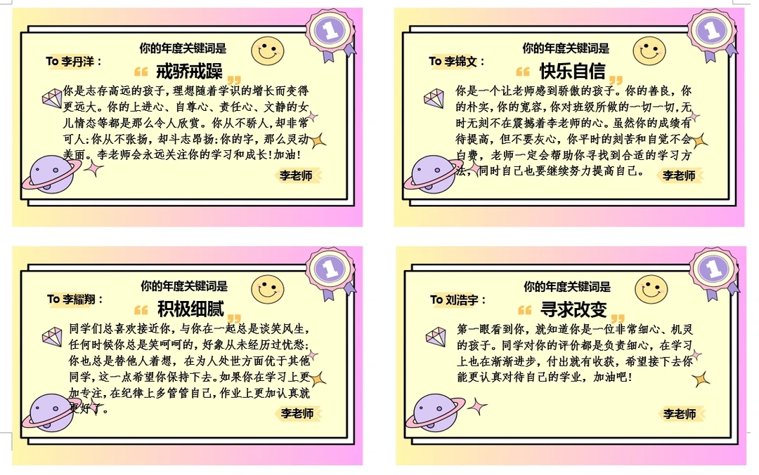 不一样的评语之年度关键词 马上就要到年底了,你的年度关键词是什么呢?●这次给同学们准备的是年度关键词评语。 先找到学生的关键词,如 💛品质 💛进步 💛技能 💛闪光点 💛书写 💛课堂状态 💛他人口中的评价 然后围绕这个关键词进行评语书写,仪式感满满就是。