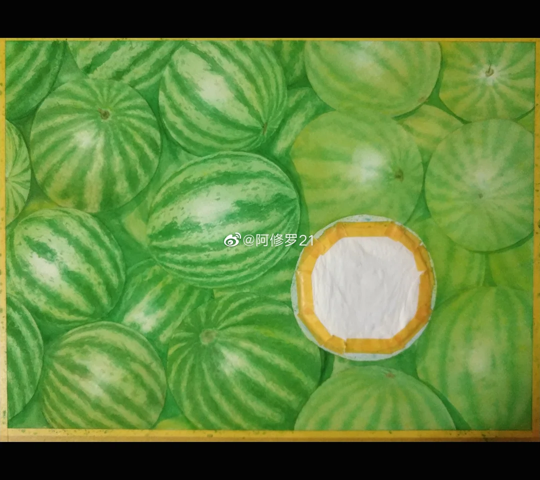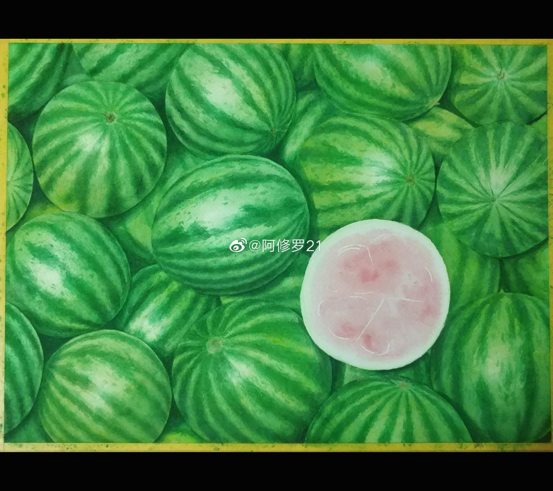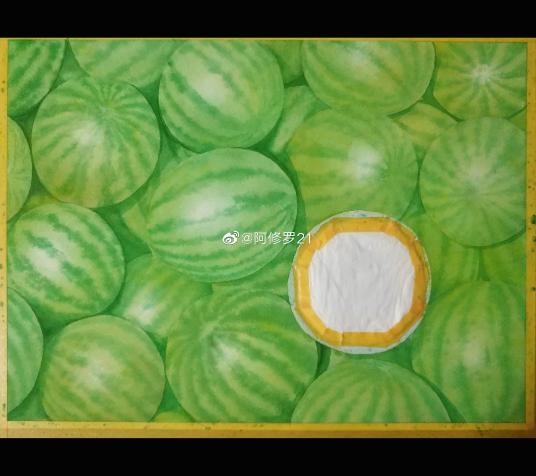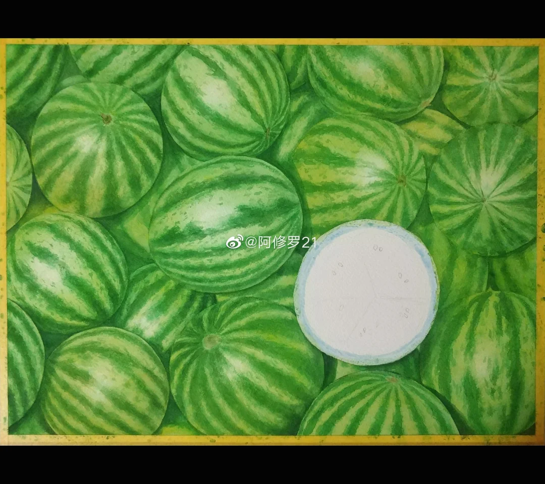 夏天就要吃西瓜~ 这几张图传了好久……都想放弃了,四比三的图片以前可以的,现在都要给强制裁掉一部分,什么鬼啊!只好填一点背景色改改比例。 纸:阿诗。颜料:MG。笔就拿到什么是什么,不记得了。 部分西瓜可能是日晒较多,泛一点暖黄色,有的绿色就偏冷一点。有人说这个西瓜还不熟?
