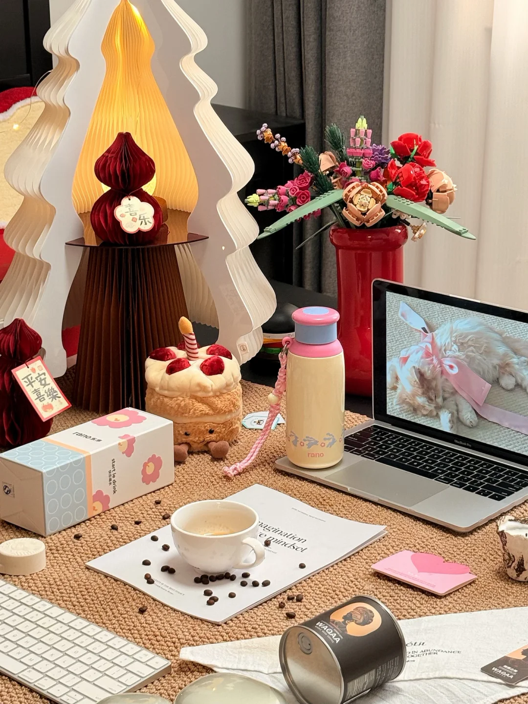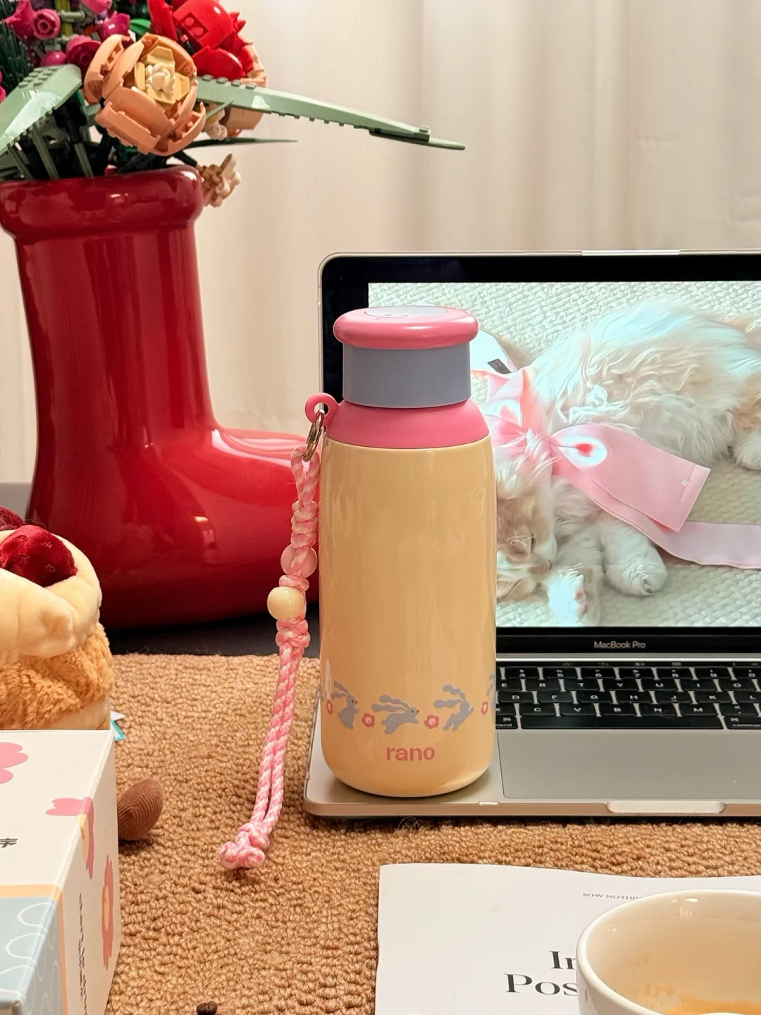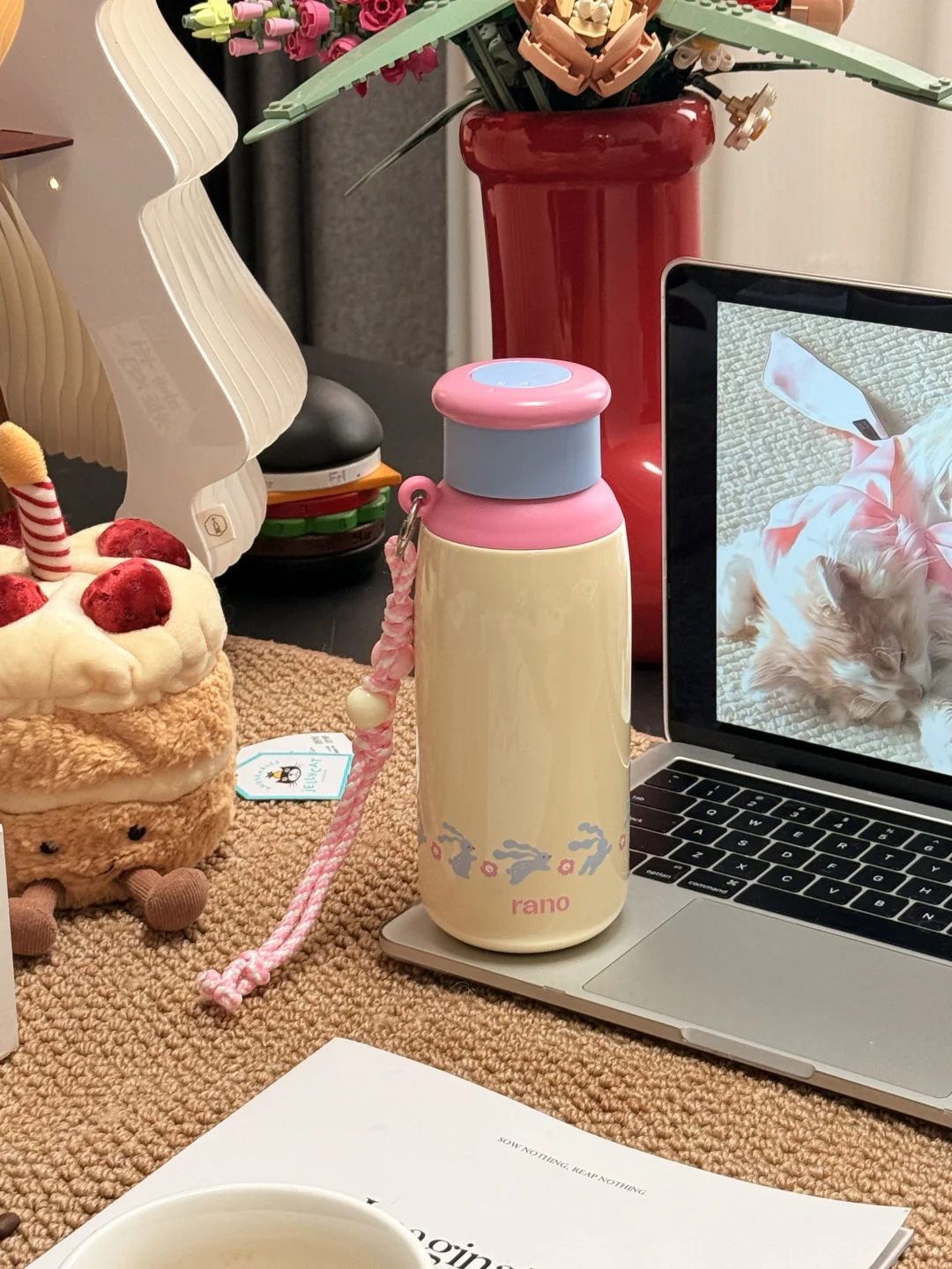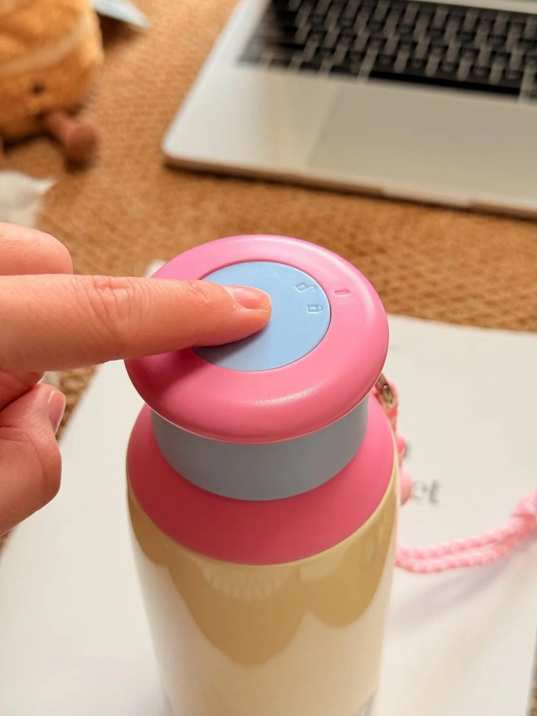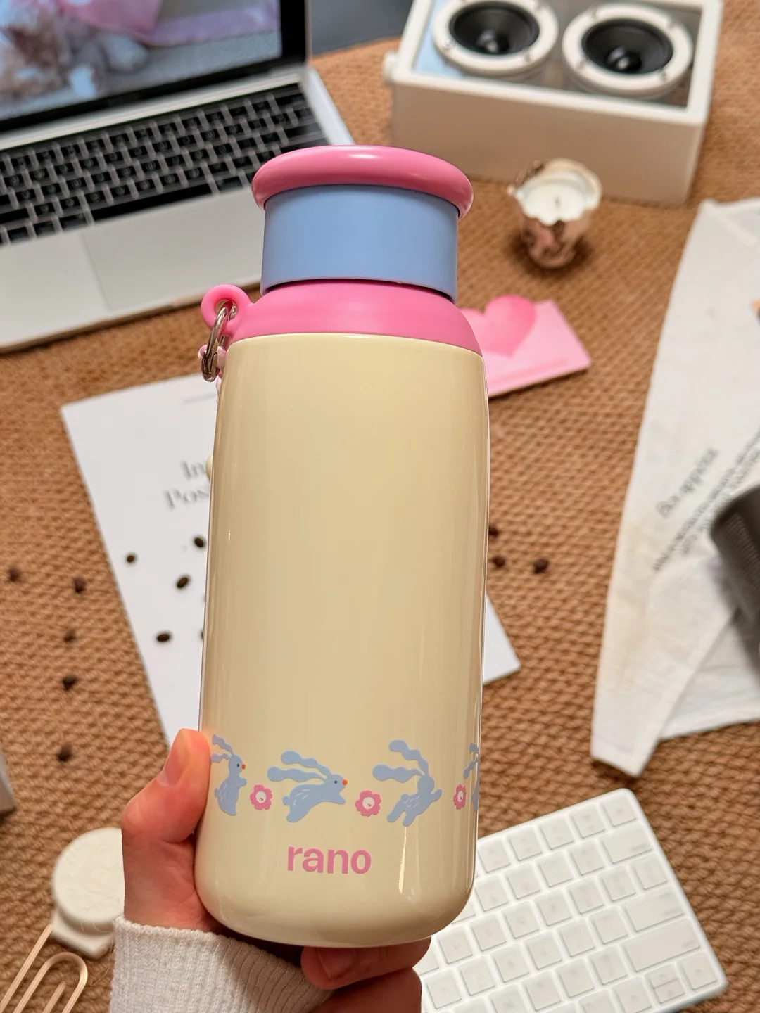 自带挂绳,杯身是乐乐兔追乐乐花可可爱爱的。