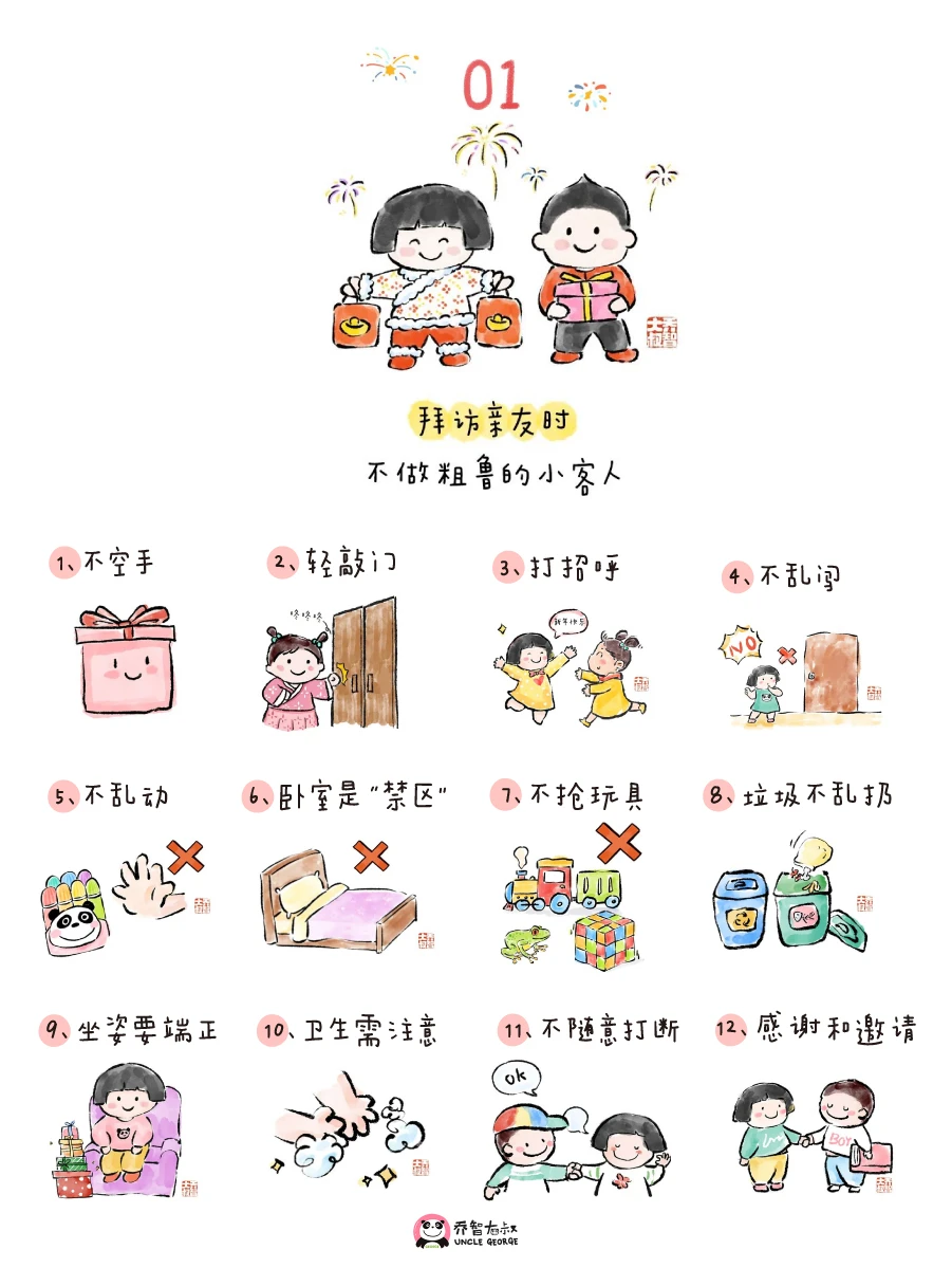 春节越来越近了[烟花R] 作为盛大的传统节日 春节期间少不了走亲访友 聚餐聚会等各种社交场合[气球R] 大叔总结了30个礼仪小细节 春节期间走亲访友[福R] 是展示家风和修养的小舞台 父母自身良好的礼仪和修养 是对孩子最有效的教育[飞吻R]