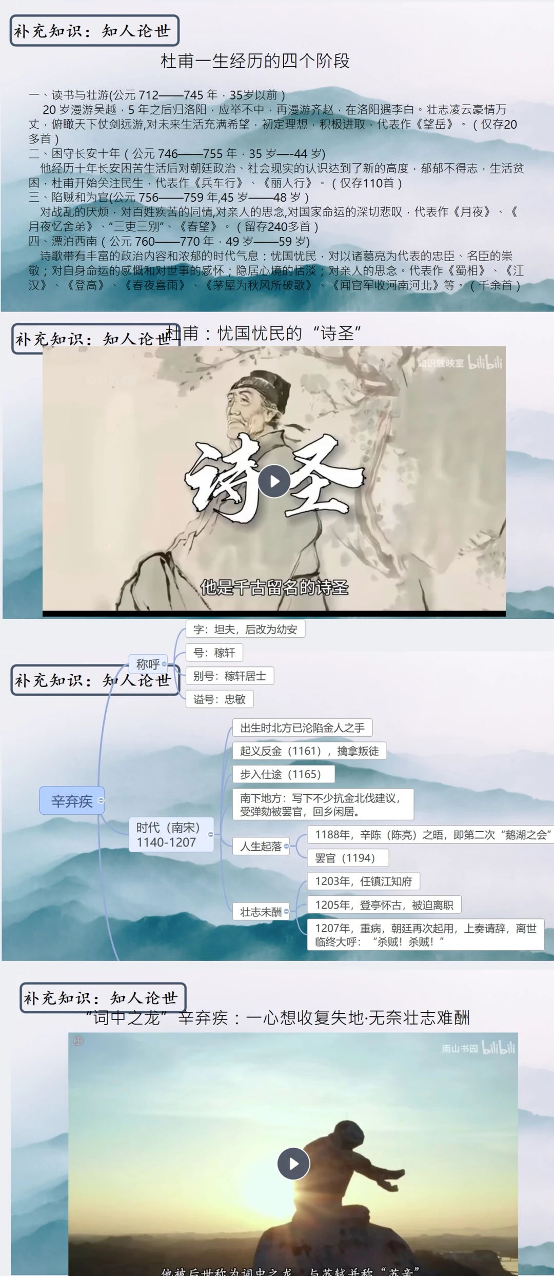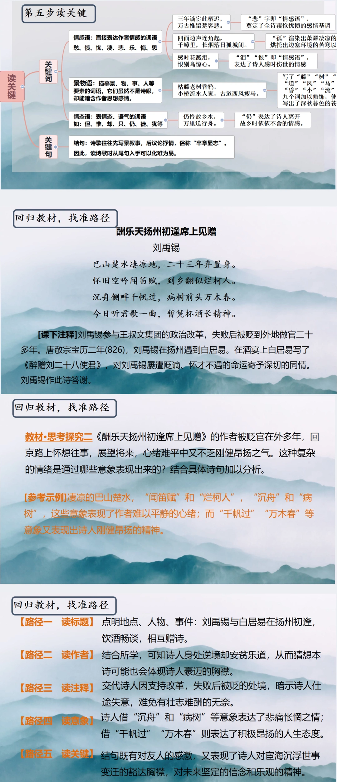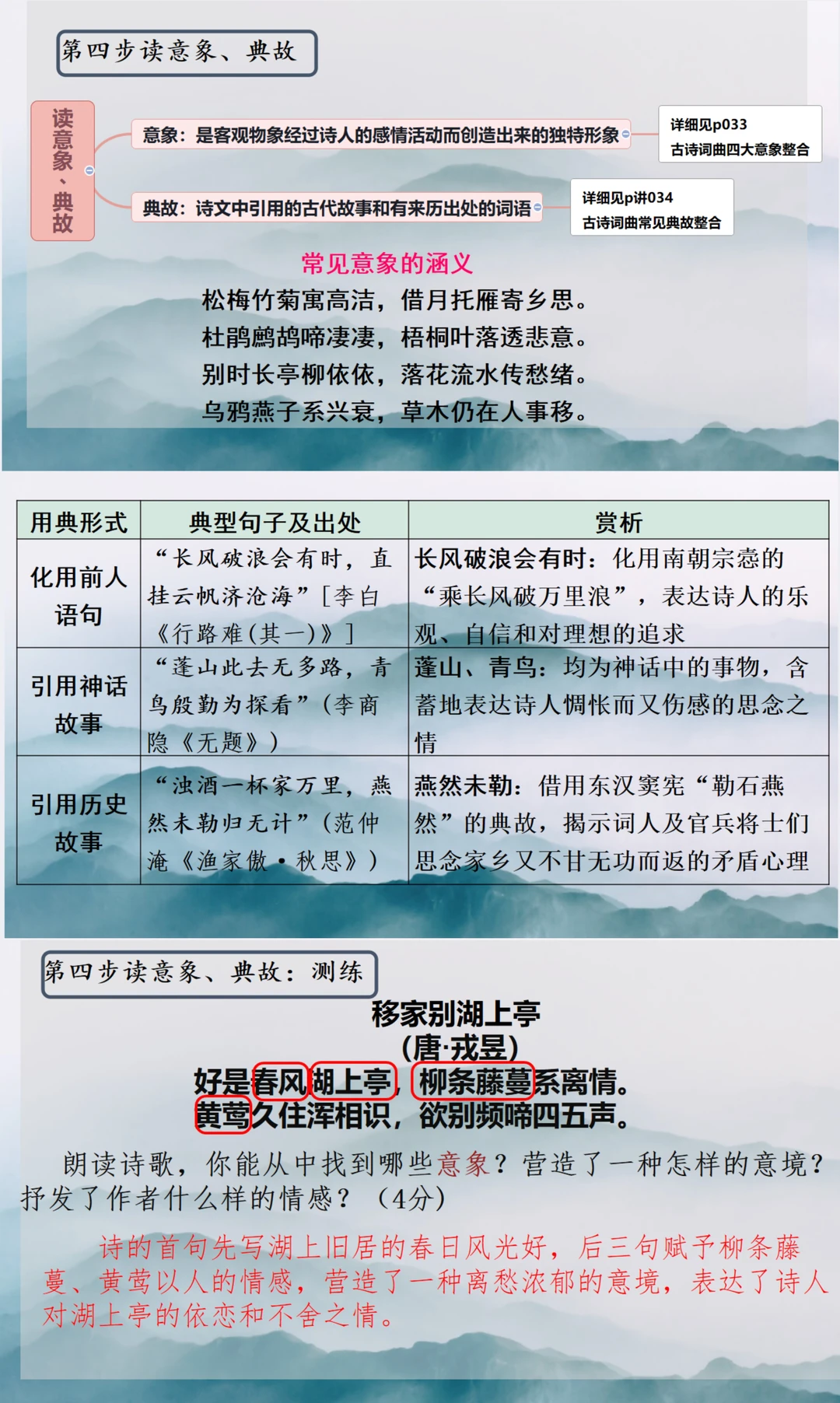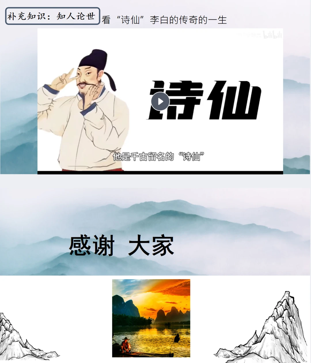 主要讲解如何快速读懂古诗的技法[害羞R] 导入:李白打来视频电话,他会分享什么呢? 读懂诗歌五步走: 第一步读标题 第二步读作者 第三步读注释 第四步读意象典故 第五步读关键 练习题巩固,补充著名诗人生平经历视频,补充意象整合、典故整合、艺术手法和风格整合。