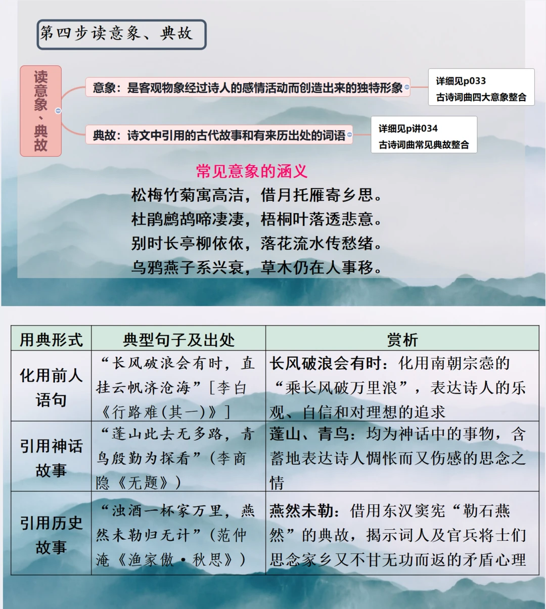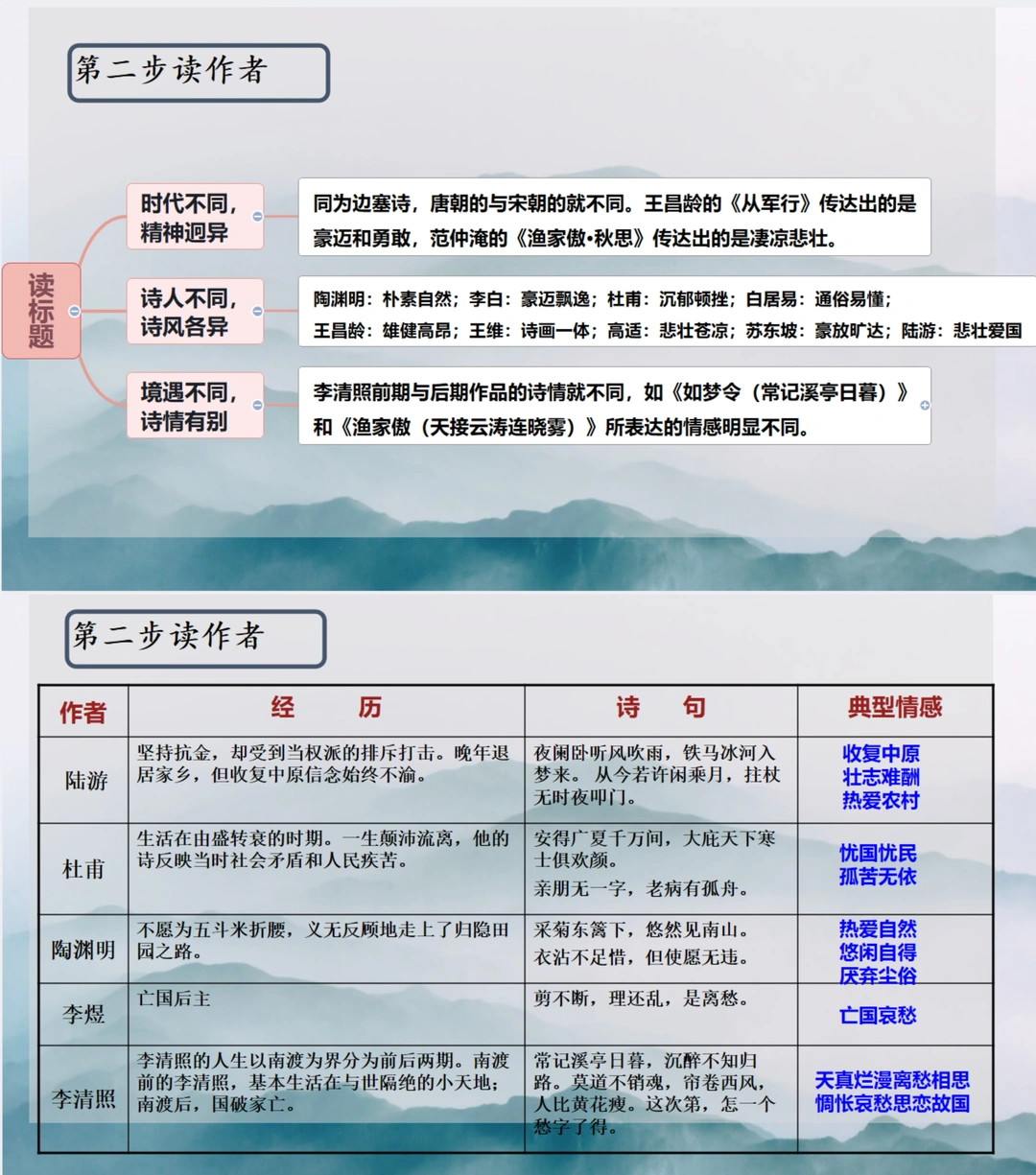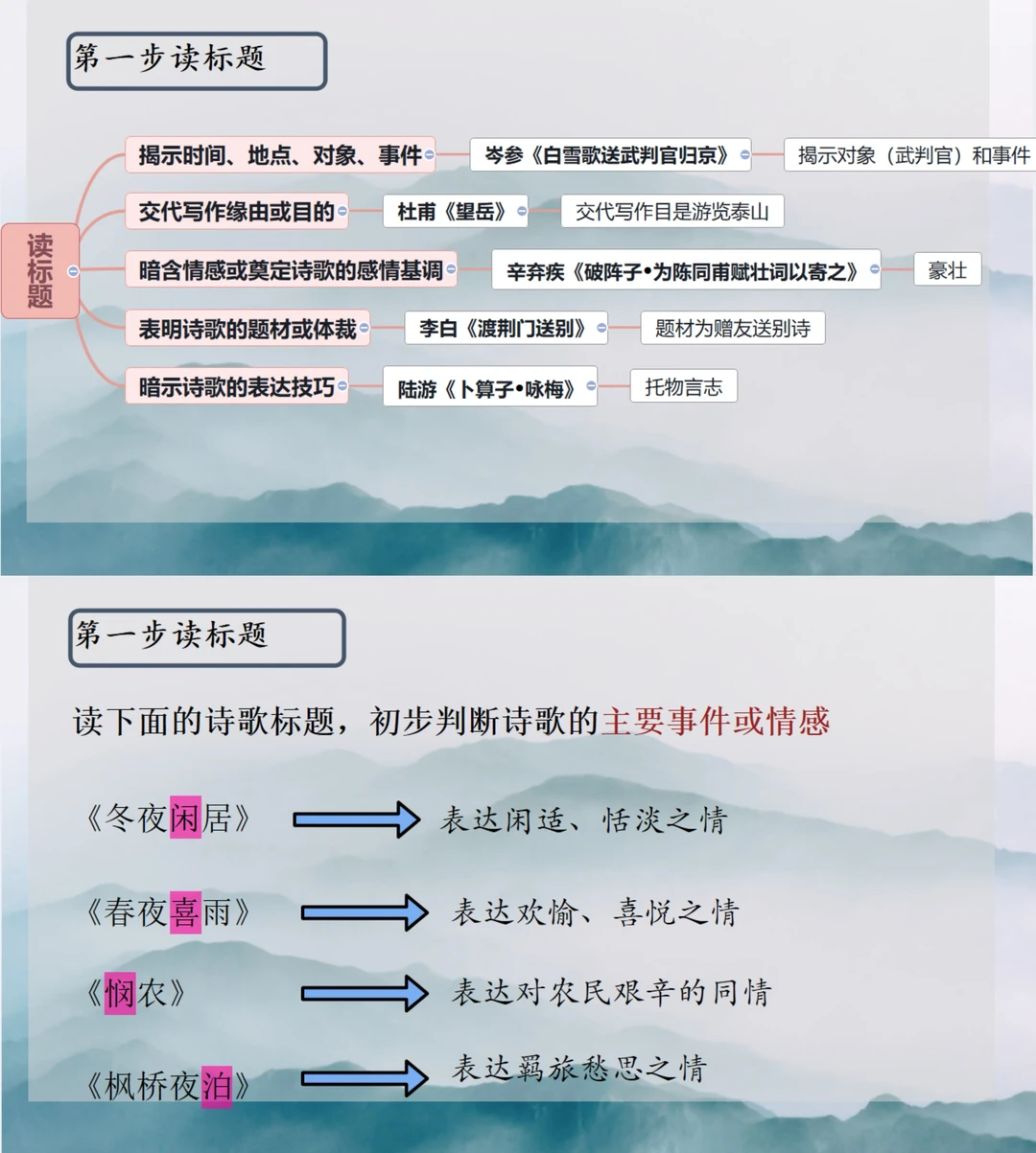 主要讲解如何快速读懂古诗的技法[害羞R] 导入:李白打来视频电话,他会分享什么呢? 读懂诗歌五步走: 第一步读标题 第二步读作者 第三步读注释 第四步读意象典故 第五步读关键 练习题巩固,补充著名诗人生平经历视频,补充意象整合、典故整合、艺术手法和风格整合。