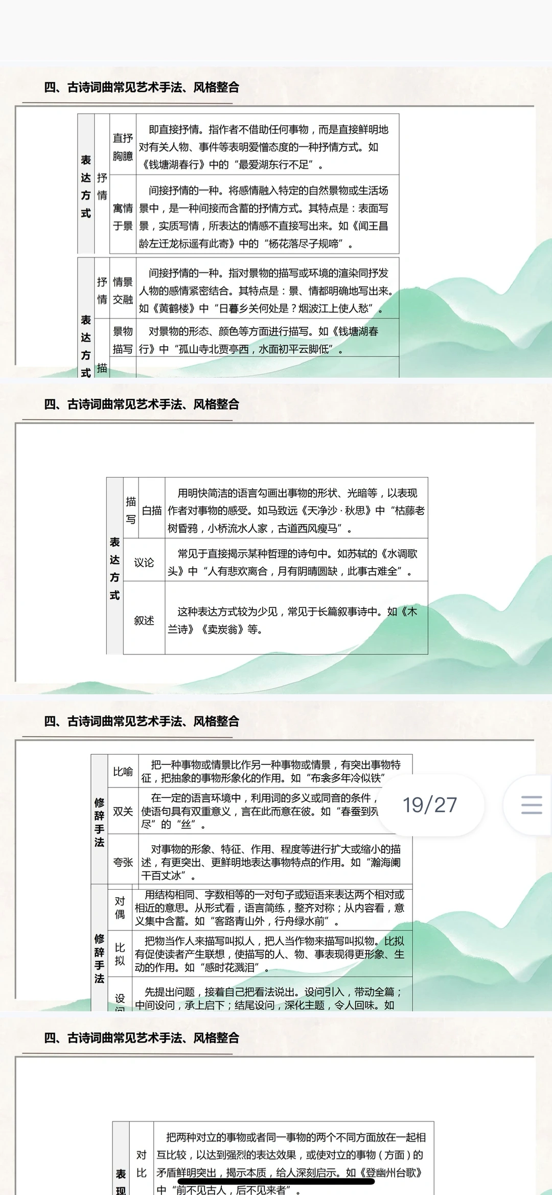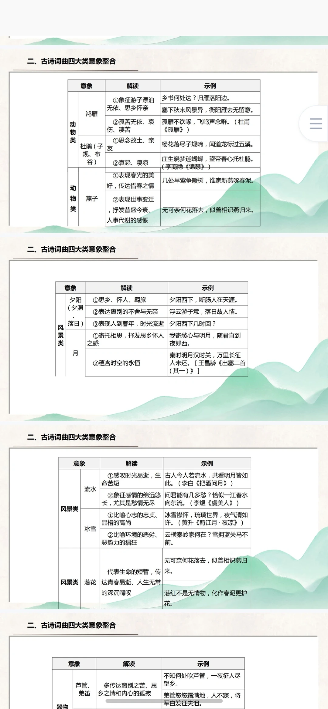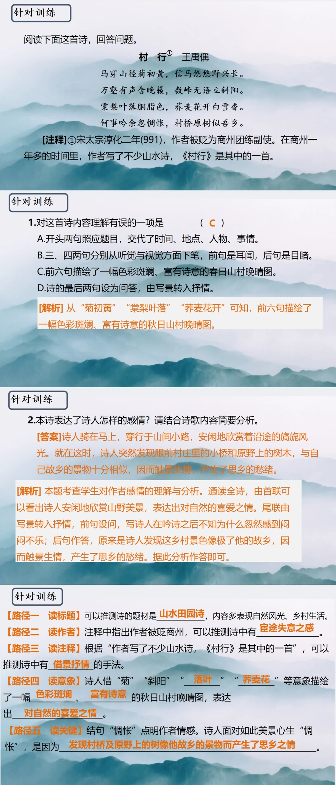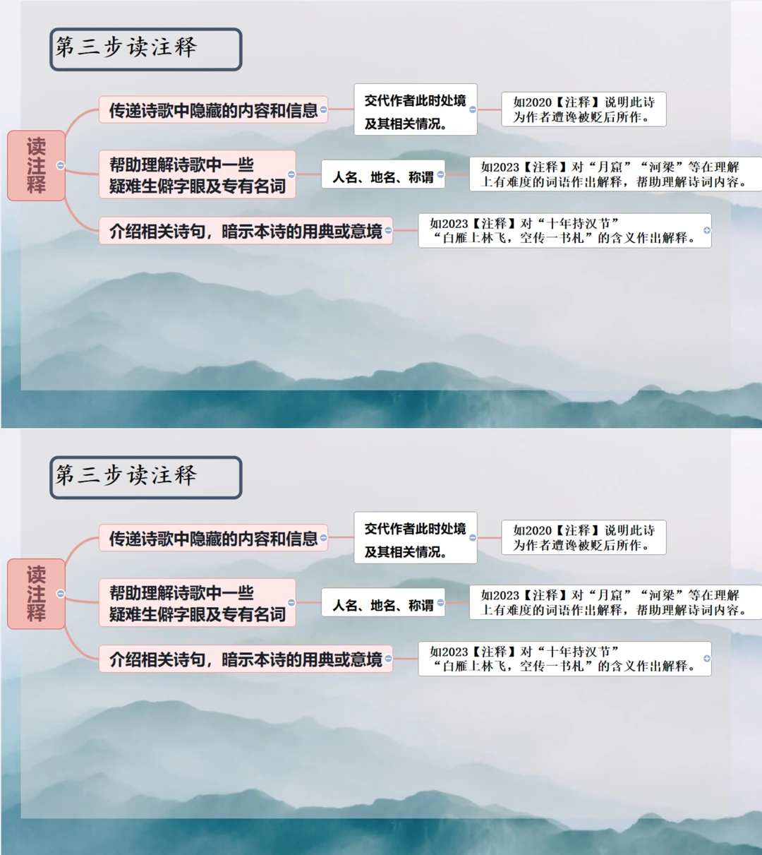 主要讲解如何快速读懂古诗的技法[害羞R] 导入:李白打来视频电话,他会分享什么呢? 读懂诗歌五步走: 第一步读标题 第二步读作者 第三步读注释 第四步读意象典故 第五步读关键 练习题巩固,补充著名诗人生平经历视频,补充意象整合、典故整合、艺术手法和风格整合。