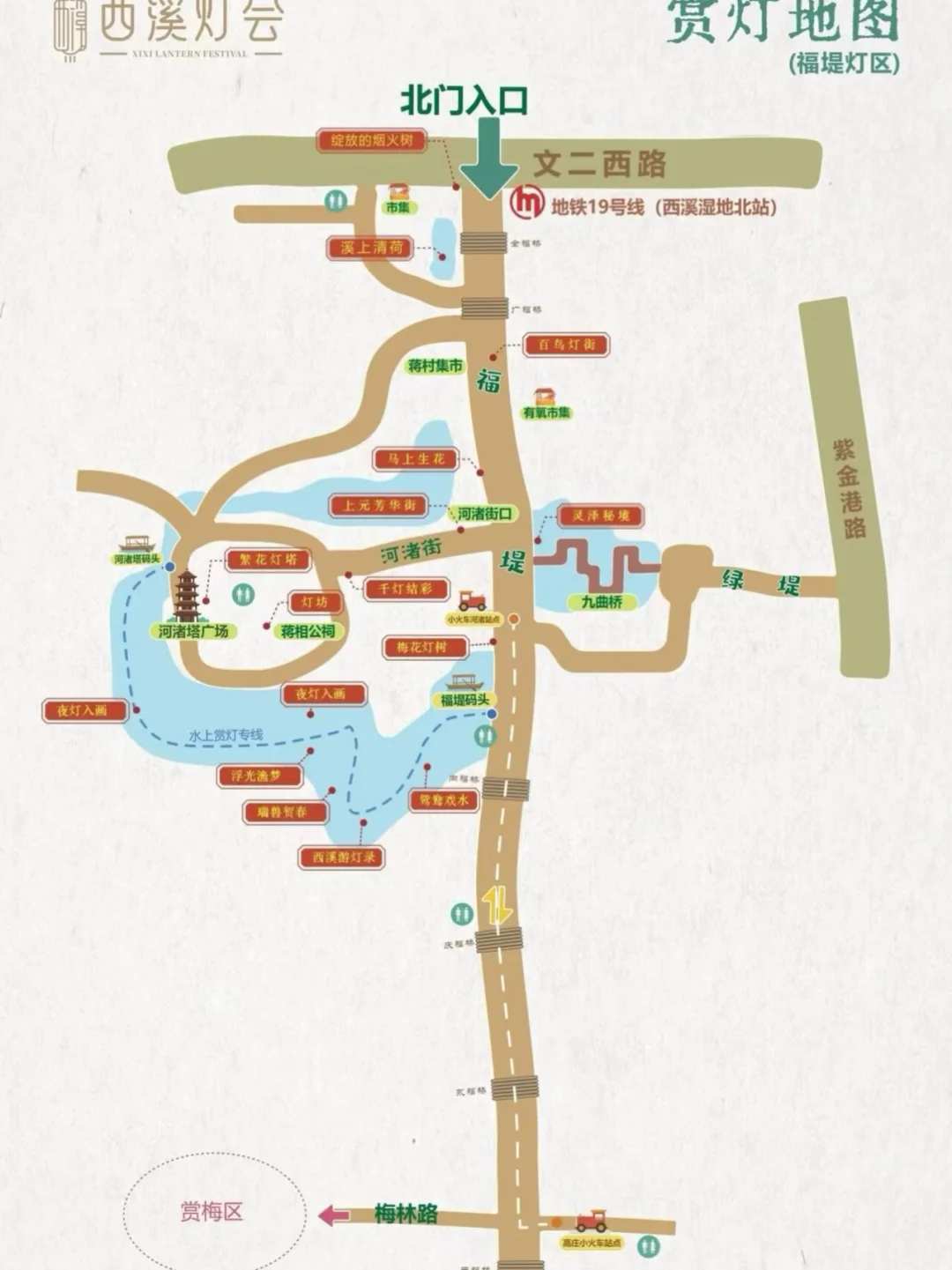 蒋村慢生活街区(看百鸟灯街) 到达河渚街(主街区,有市集小吃)>看河渚塔亮灯-从蒋村市集附近出口离开