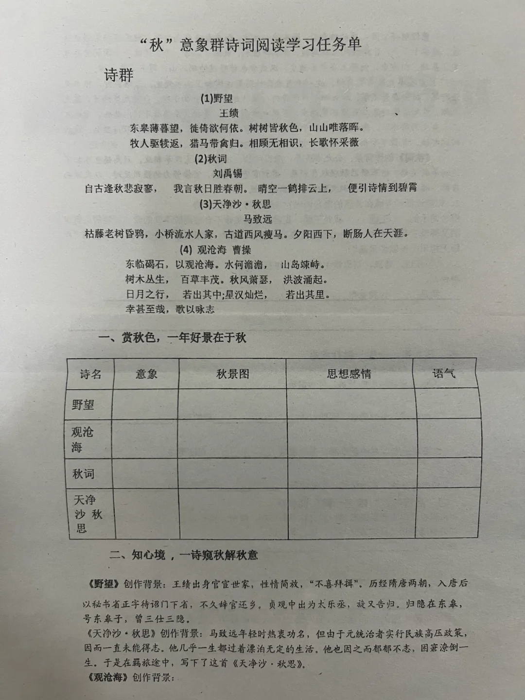 1.诗人眼中的是什么颜色呢?出示群诗:《野望》王绩、《秋词》刘禹锡、《天净沙秋思》马致远、《观沧海》曹操