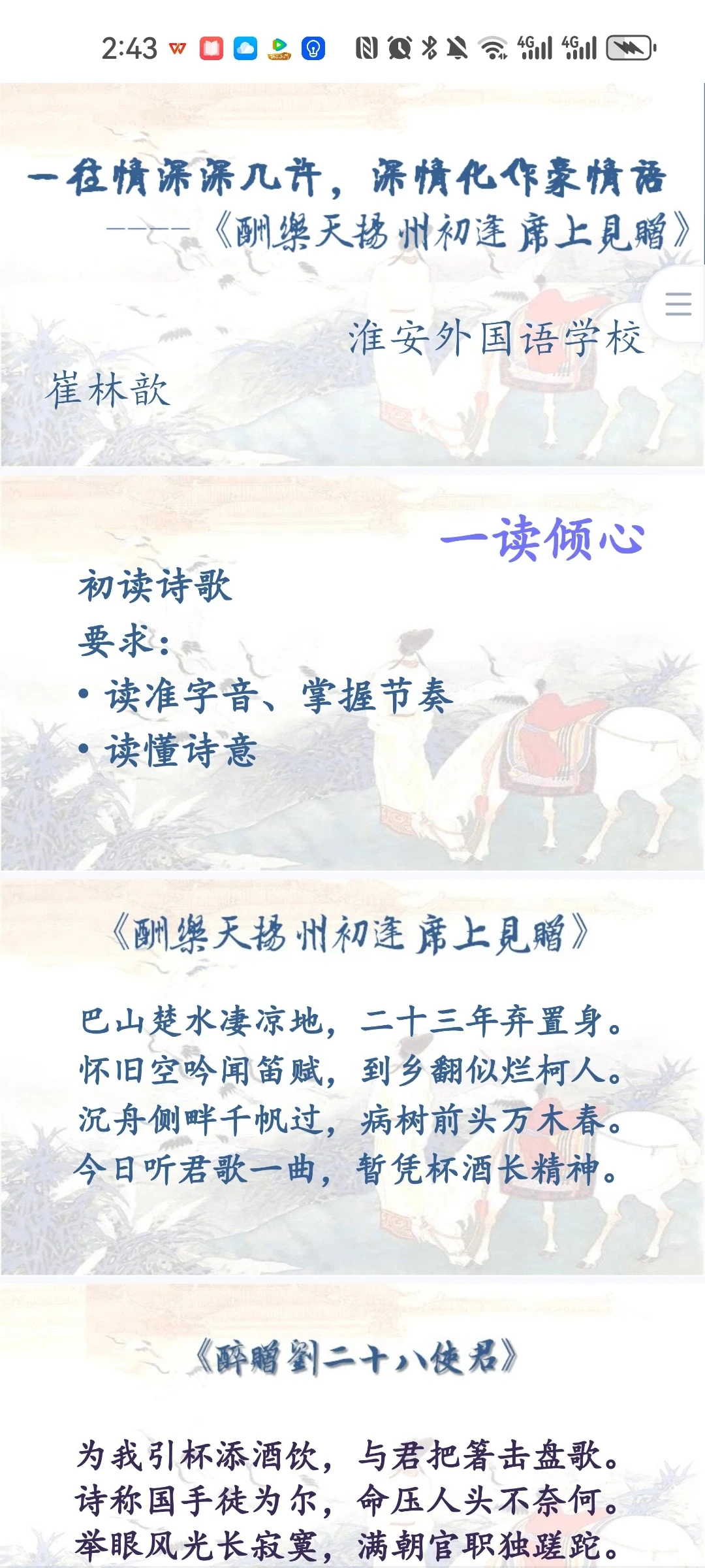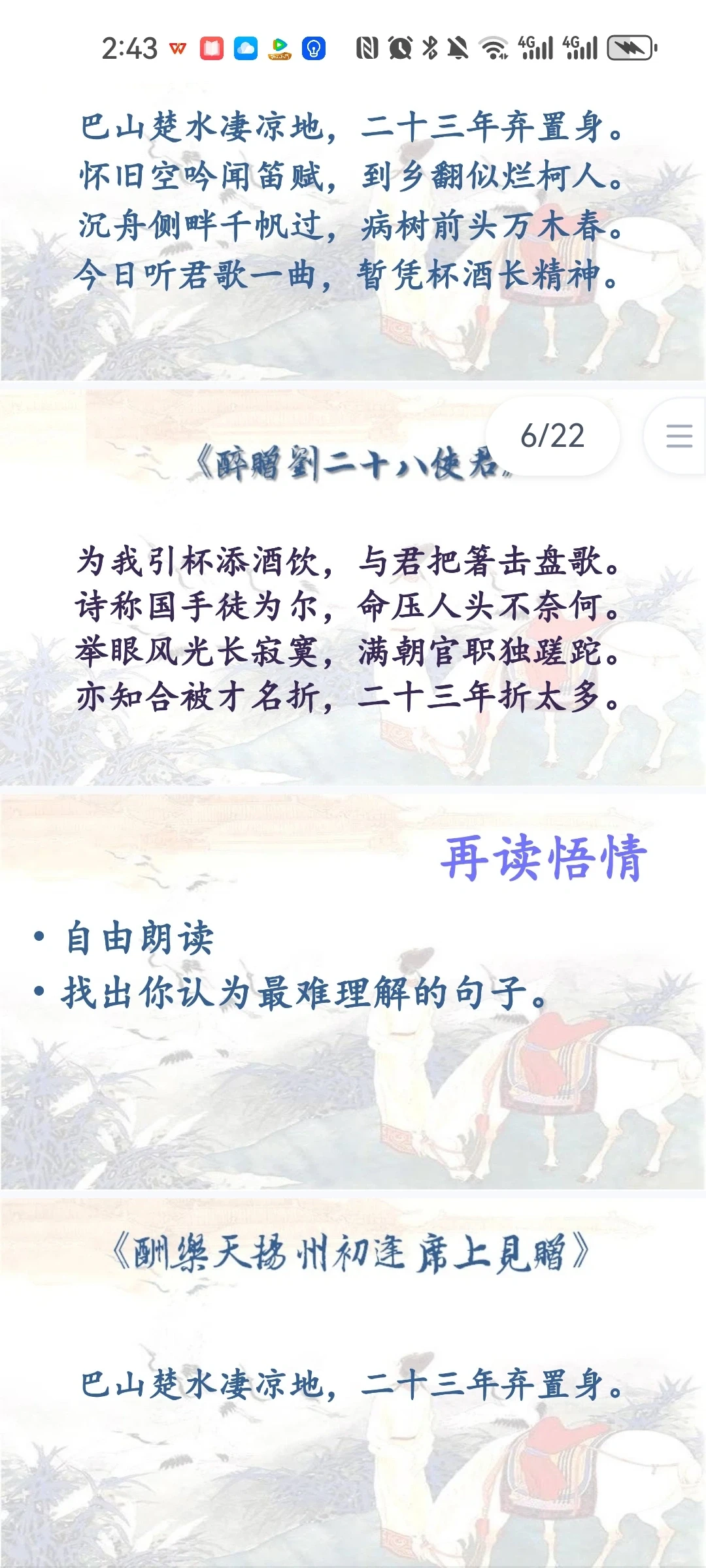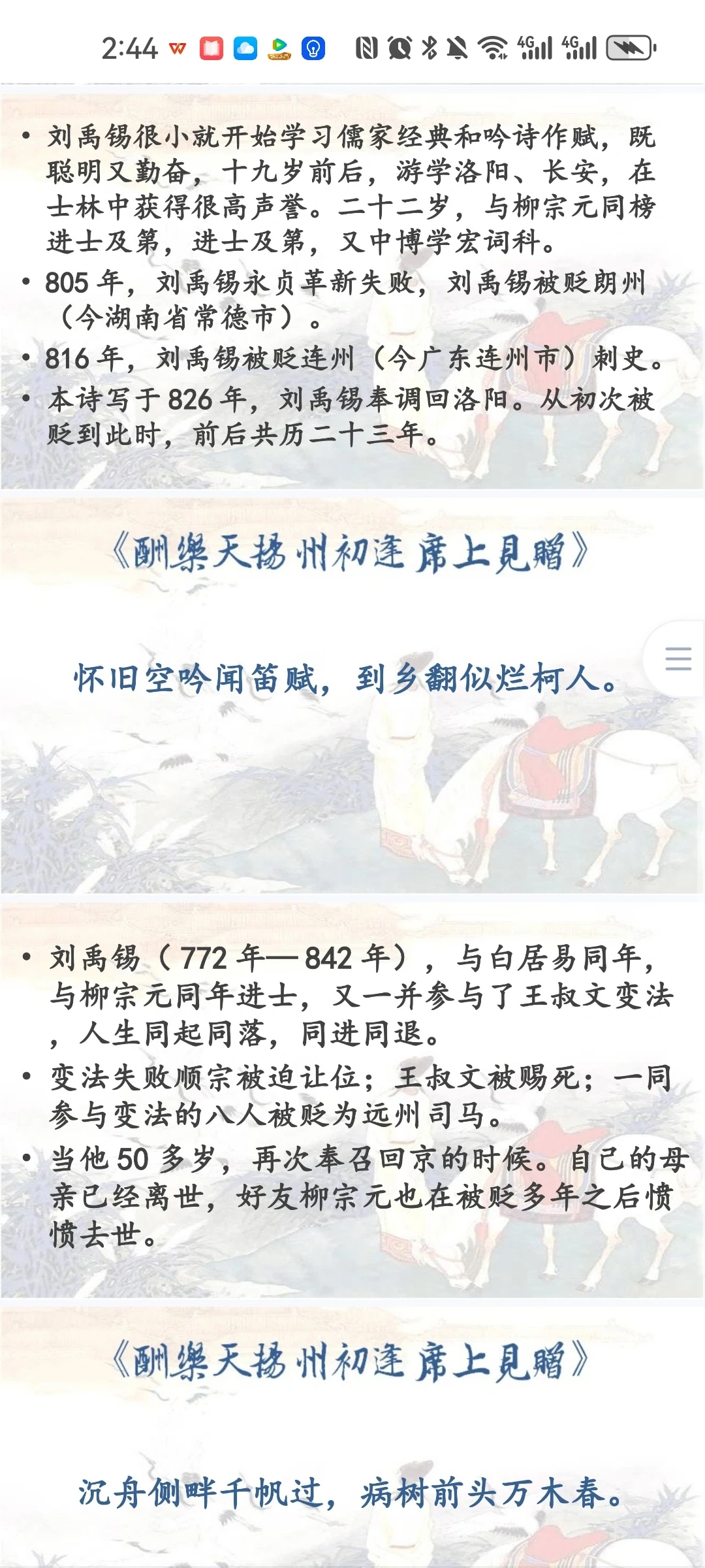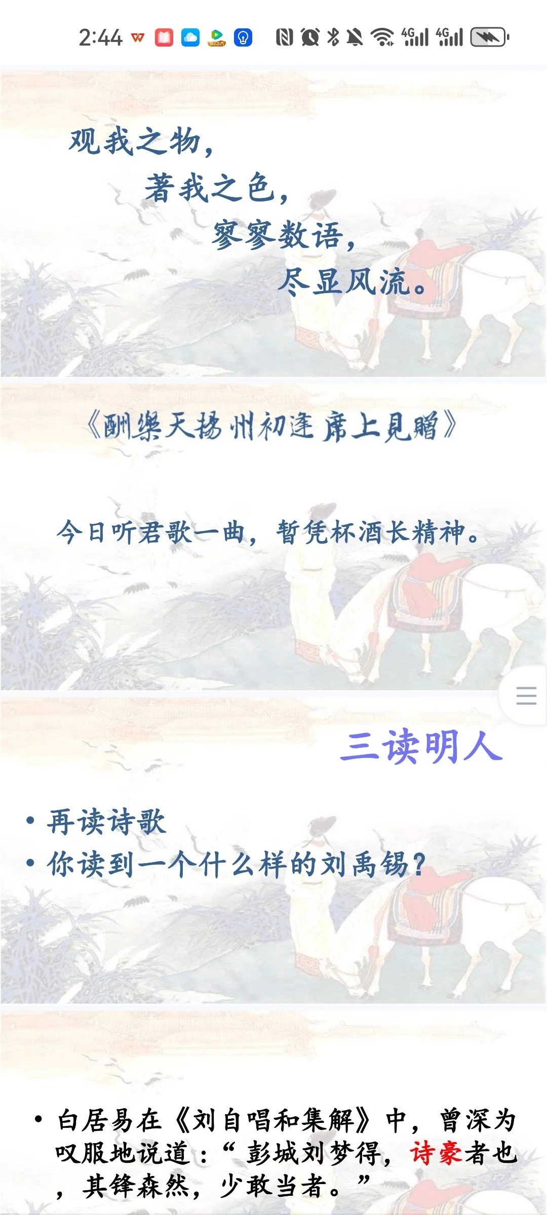 《酬乐天扬州初逢席上见赠》 刘禹锡比苏轼更多一份执着,比辛弃疾又多一份通脱,所以他亢奋而不狂躁,悲债而不沉沦,洒脱而不放浪,执着而不拘泥,他的人生态度最少偏执,既不高蹈出尘,又不哀伤消沉;既保持积极进取的锐气,又保持着相对开朗豁达的心态。学习刘禹锡的诗歌,应该从中感受作者豪放、乐观的做人态度,学习作者积极、昂扬的人生哲学。