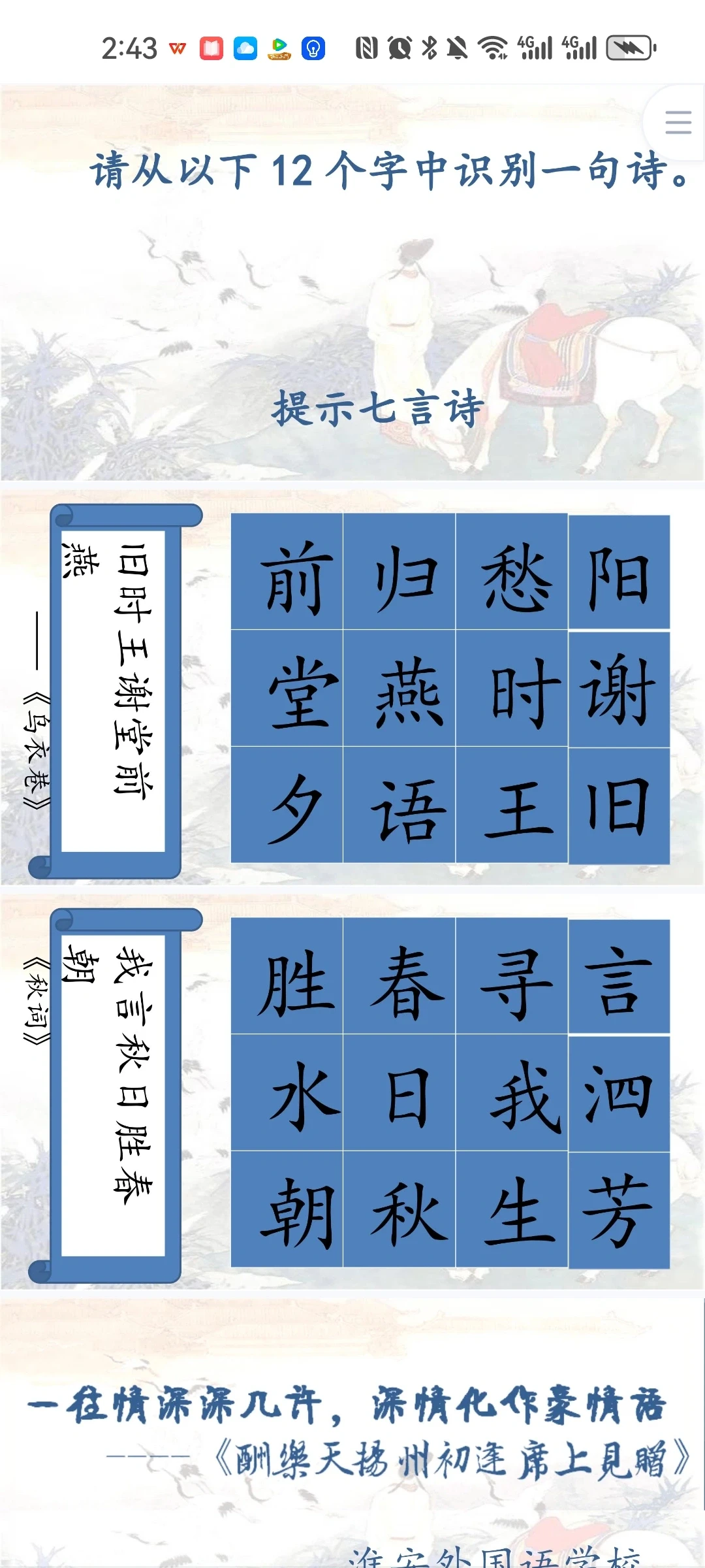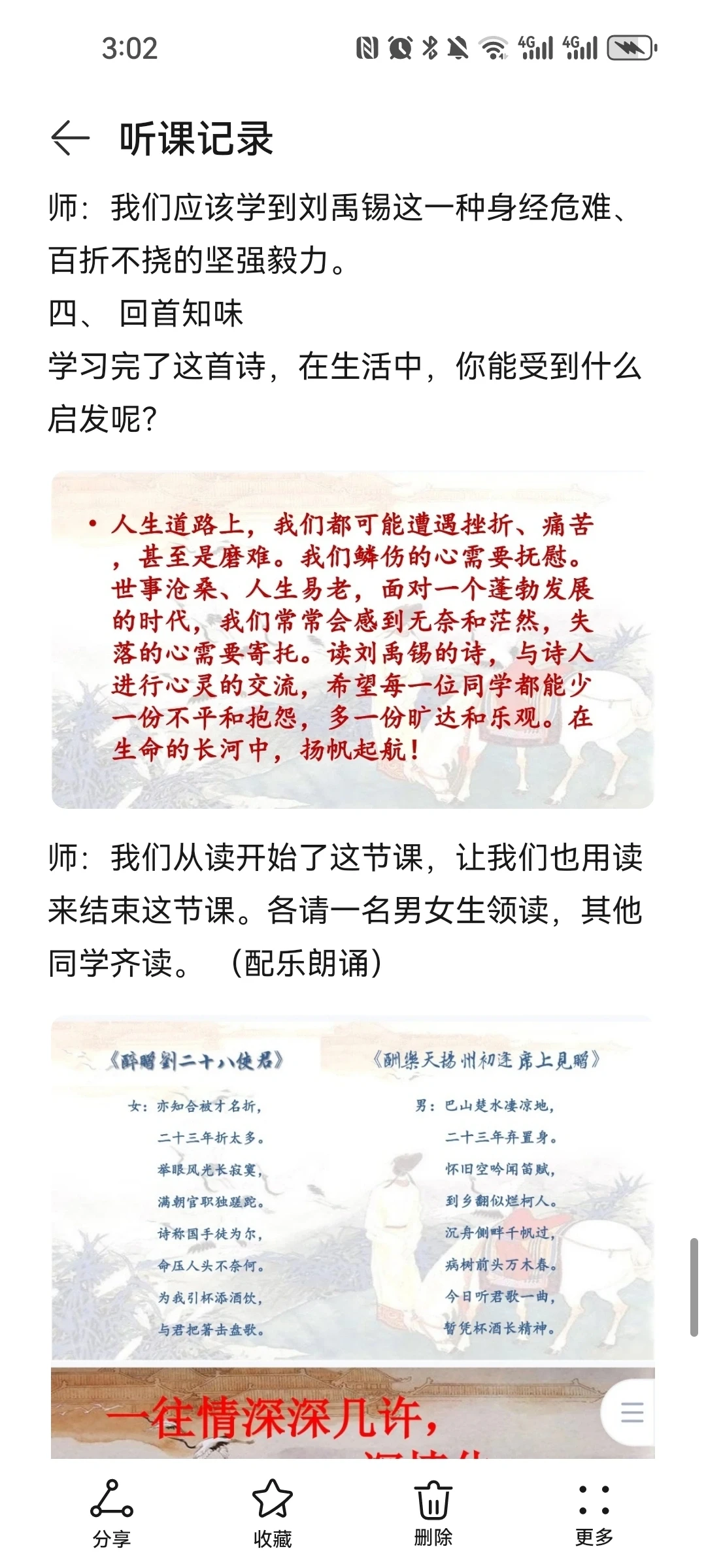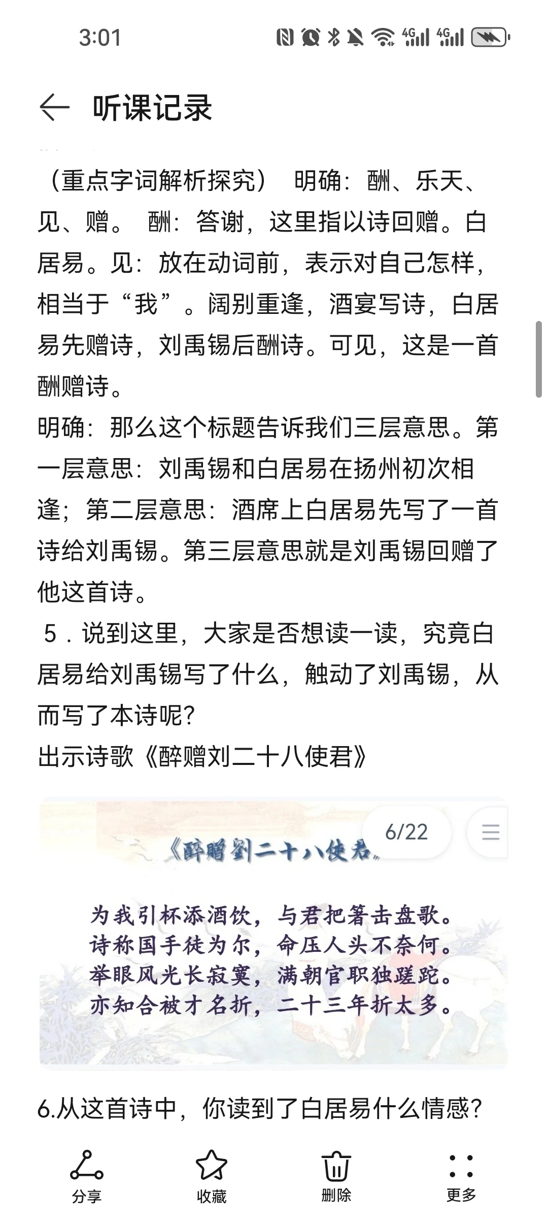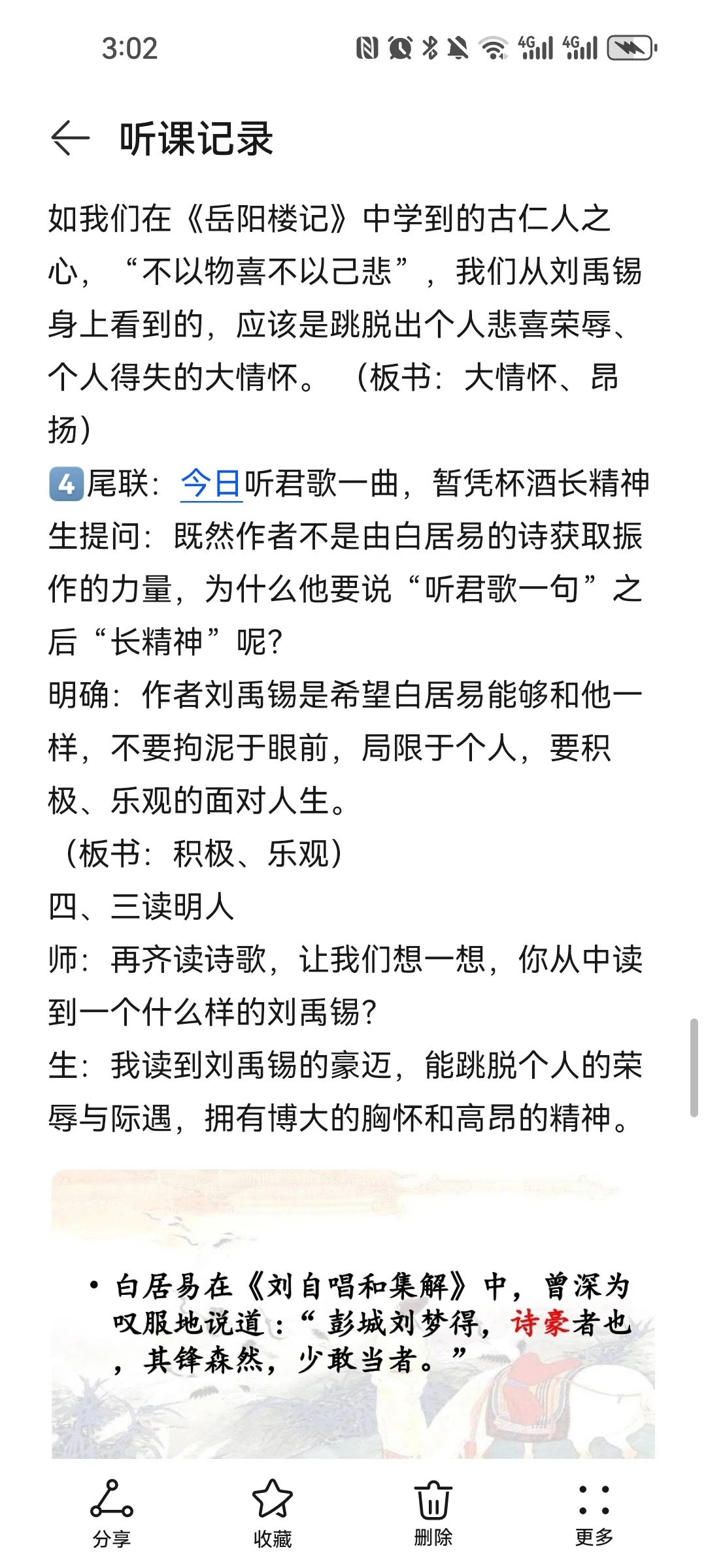 《酬乐天扬州初逢席上见赠》 刘禹锡比苏轼更多一份执着,比辛弃疾又多一份通脱,所以他亢奋而不狂躁,悲债而不沉沦,洒脱而不放浪,执着而不拘泥,他的人生态度最少偏执,既不高蹈出尘,又不哀伤消沉;既保持积极进取的锐气,又保持着相对开朗豁达的心态。学习刘禹锡的诗歌,应该从中感受作者豪放、乐观的做人态度,学习作者积极、昂扬的人生哲学。