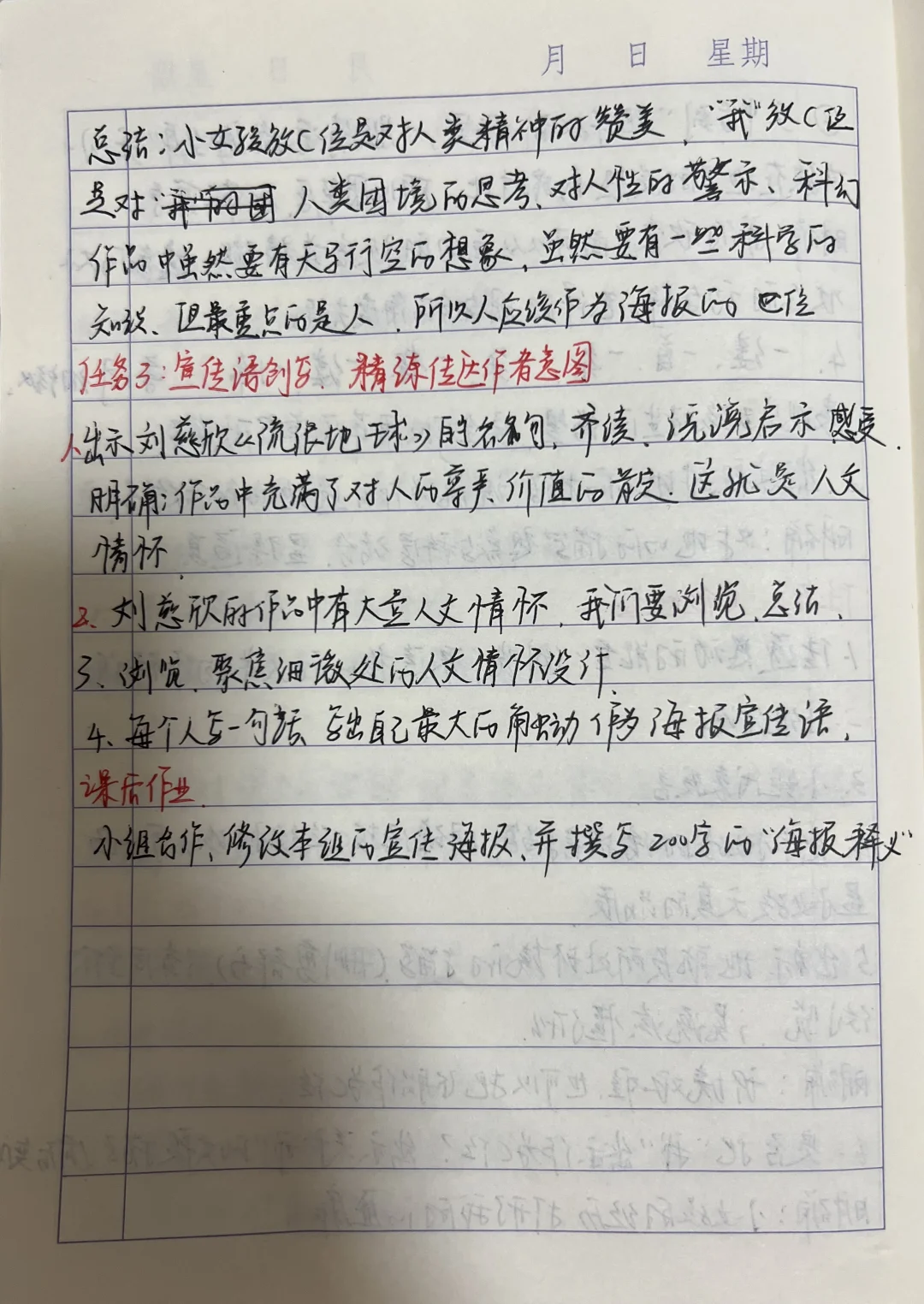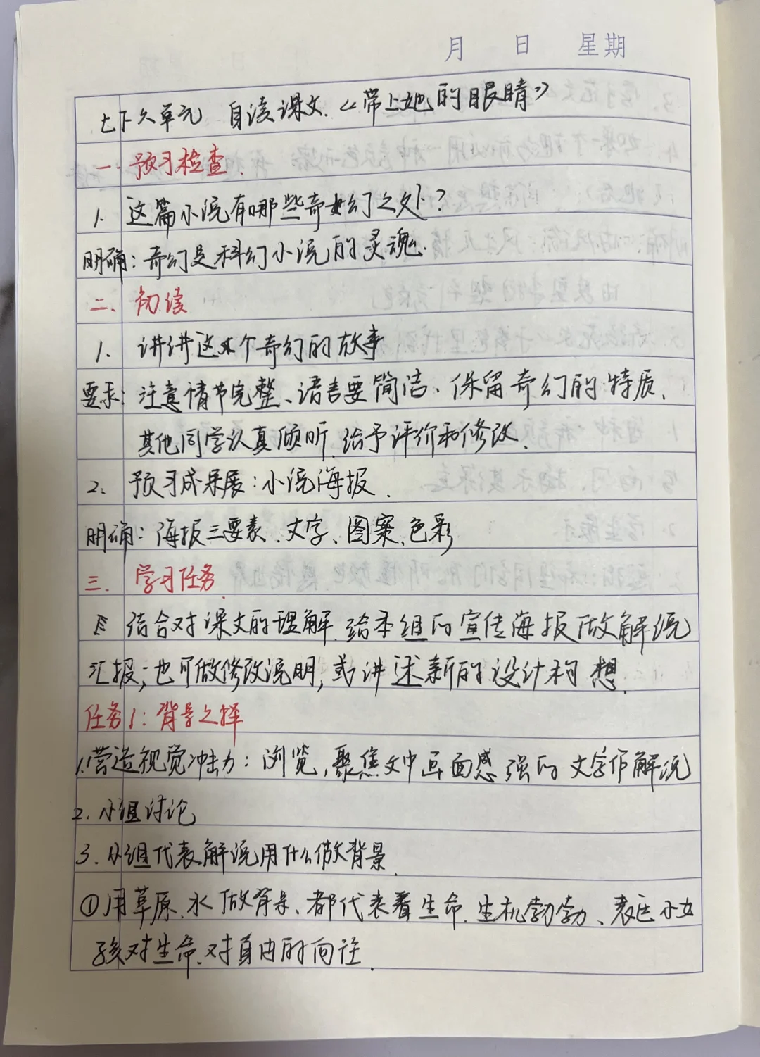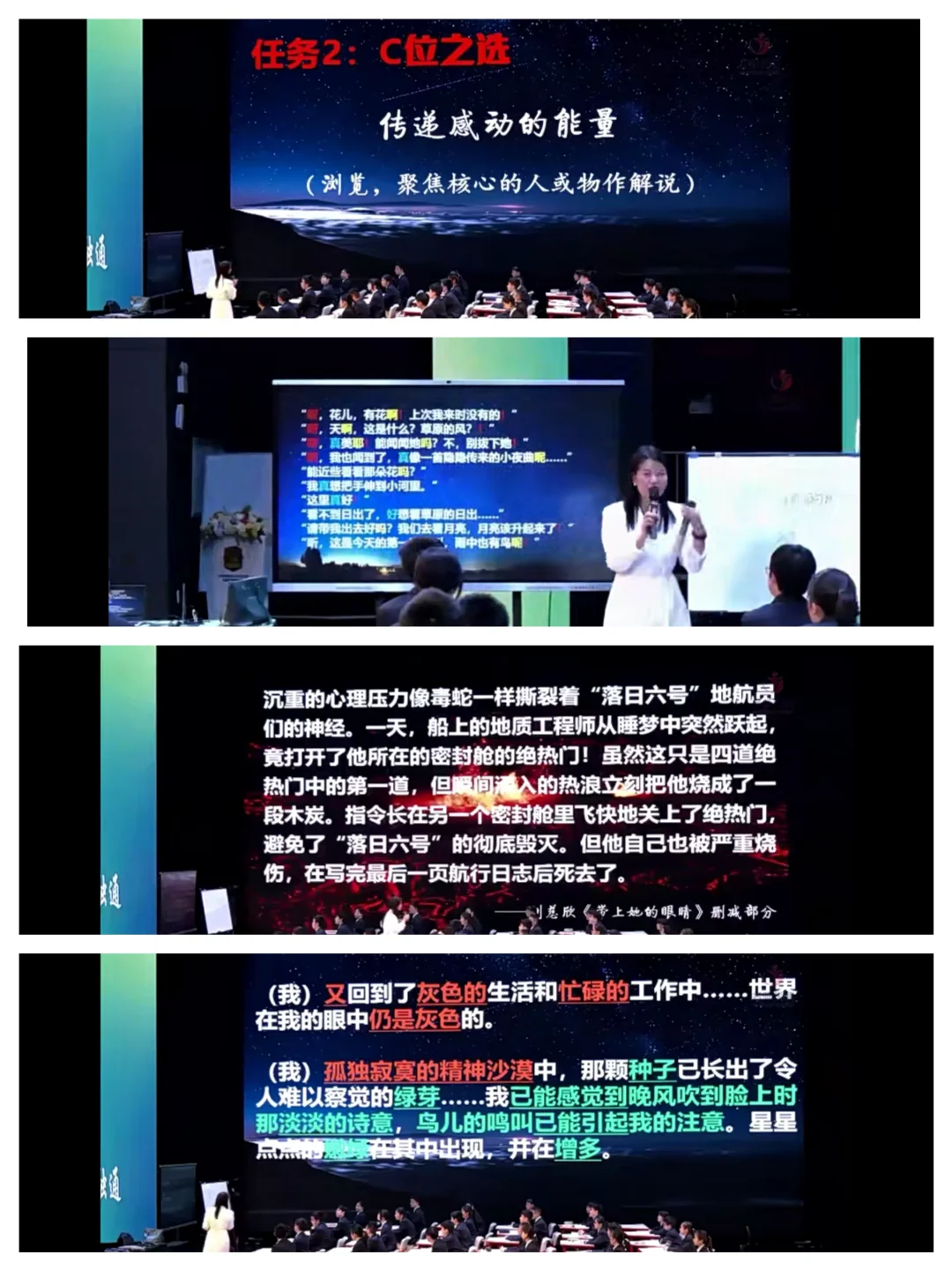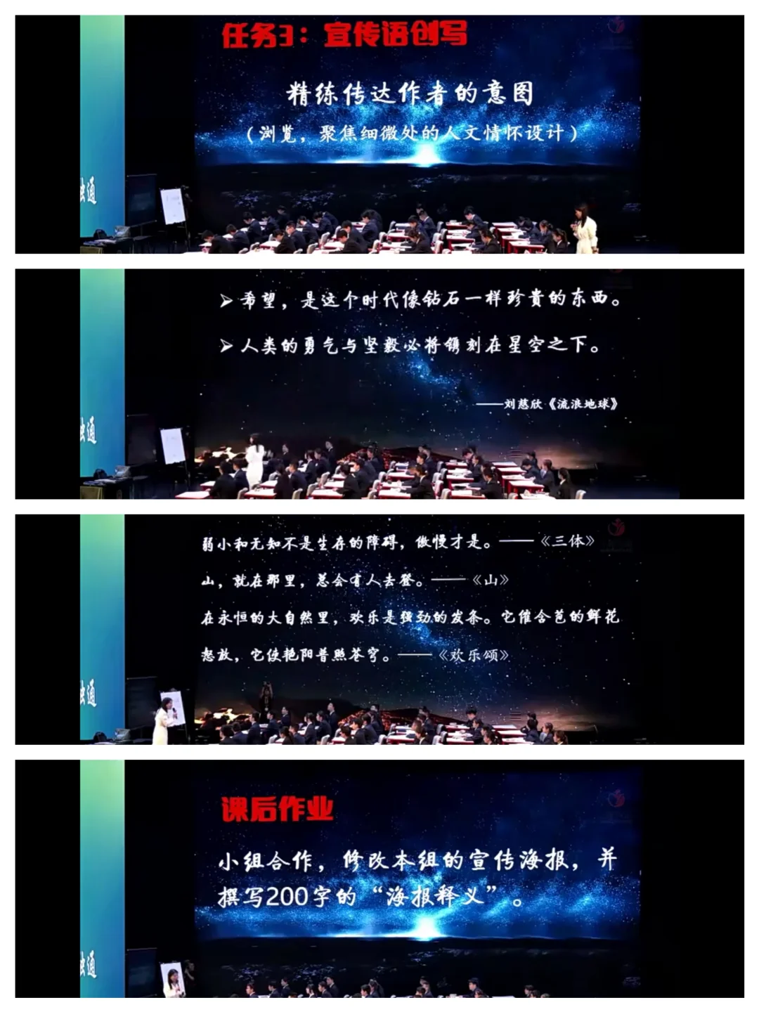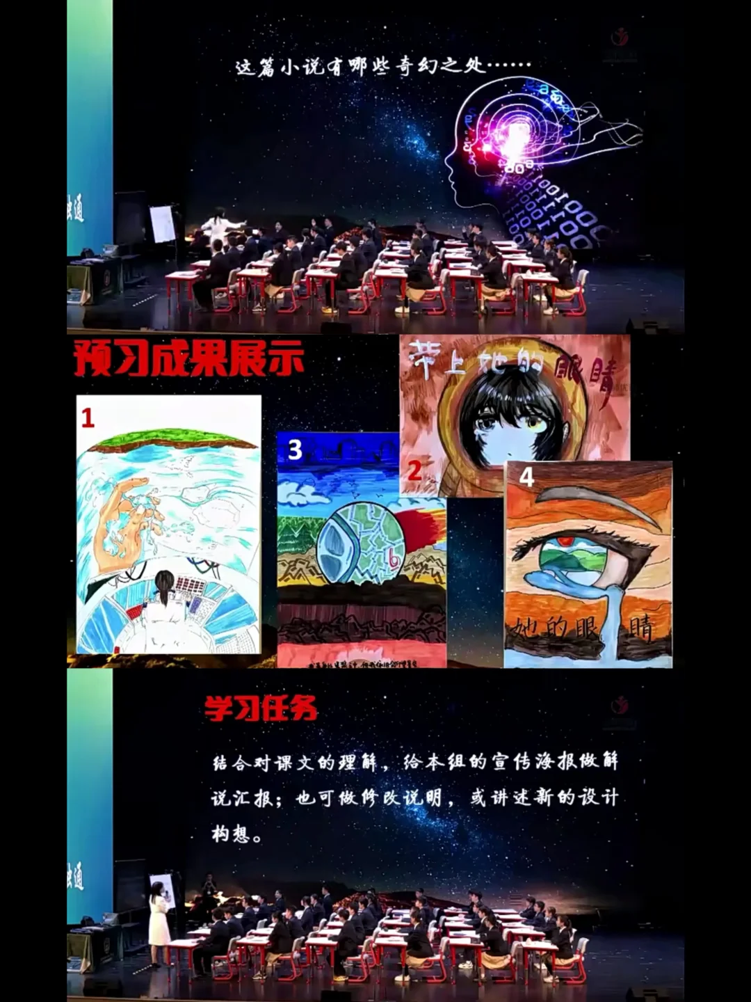 时长:50分钟 来源:名师课堂 年级:七年级第六单元自读课文 教学流程: 检查预习 任务一:背景之择(明确科幻小说特点) 任务二:C位之选(明确小说主题) 任务三:宣传语创写(理解人文情怀) 课后作业