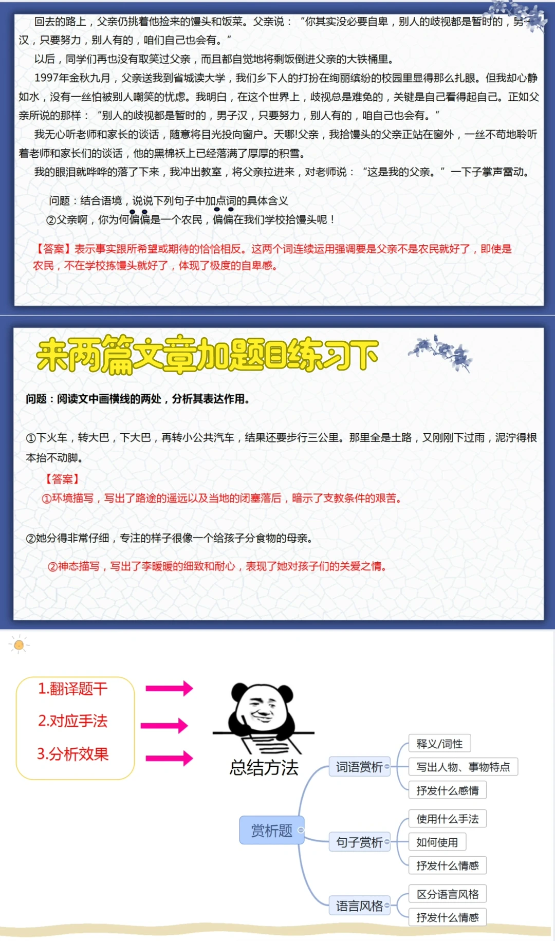 这次的记叙文讲赏析题,已经讲完选择题概括题,流程如下