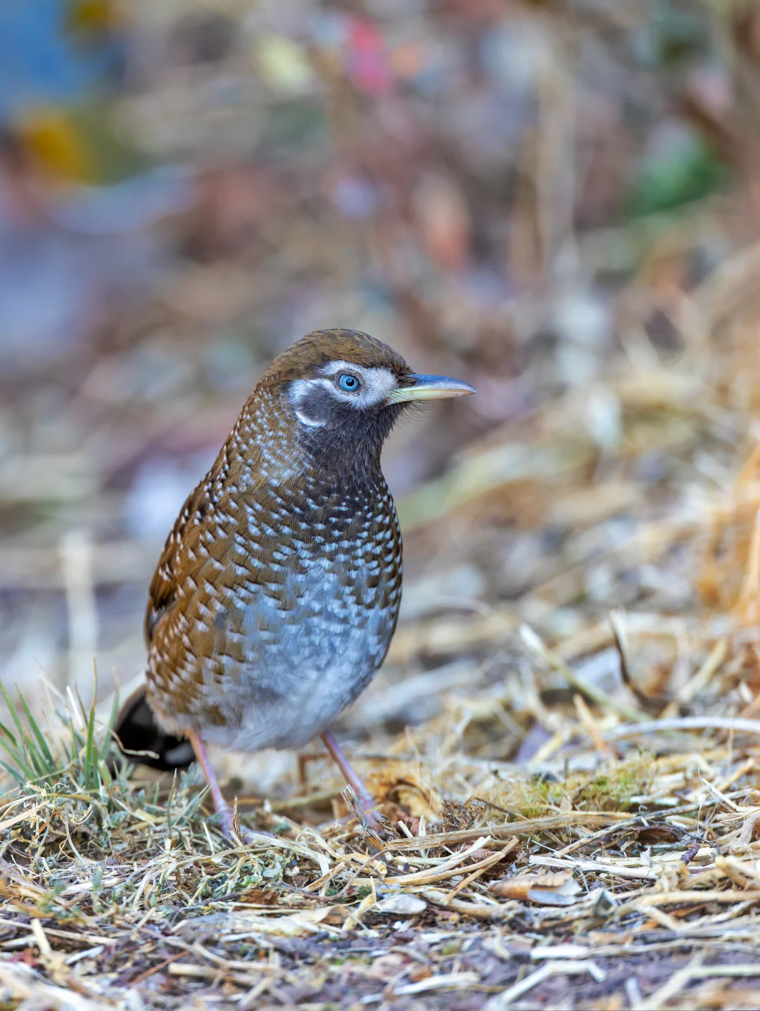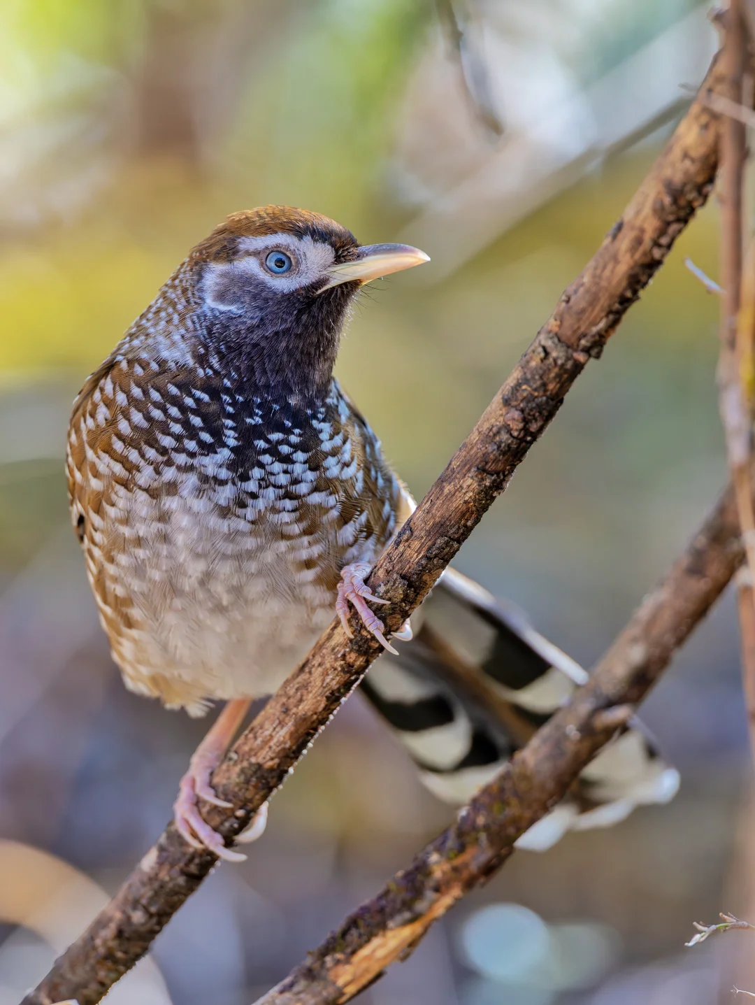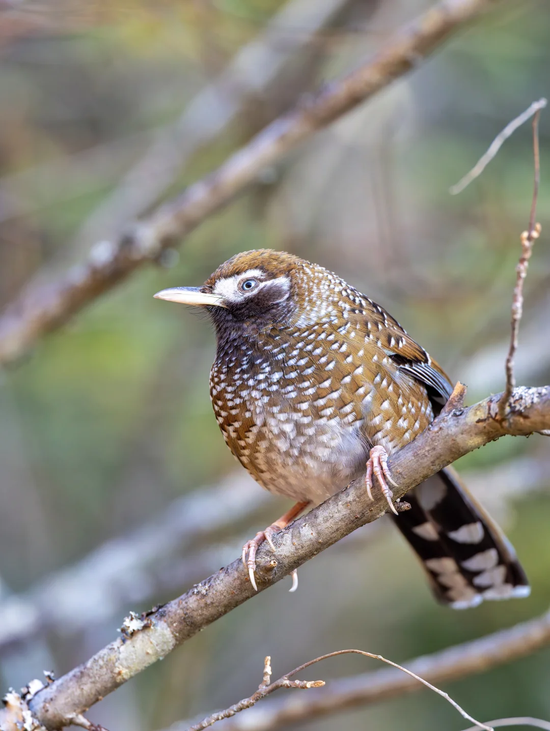特征明显,有黑色喉部,黑白色斑点遍布全身,名副其实(当然其他有些噪鹛,比如眼纹噪鹛也有白点)。