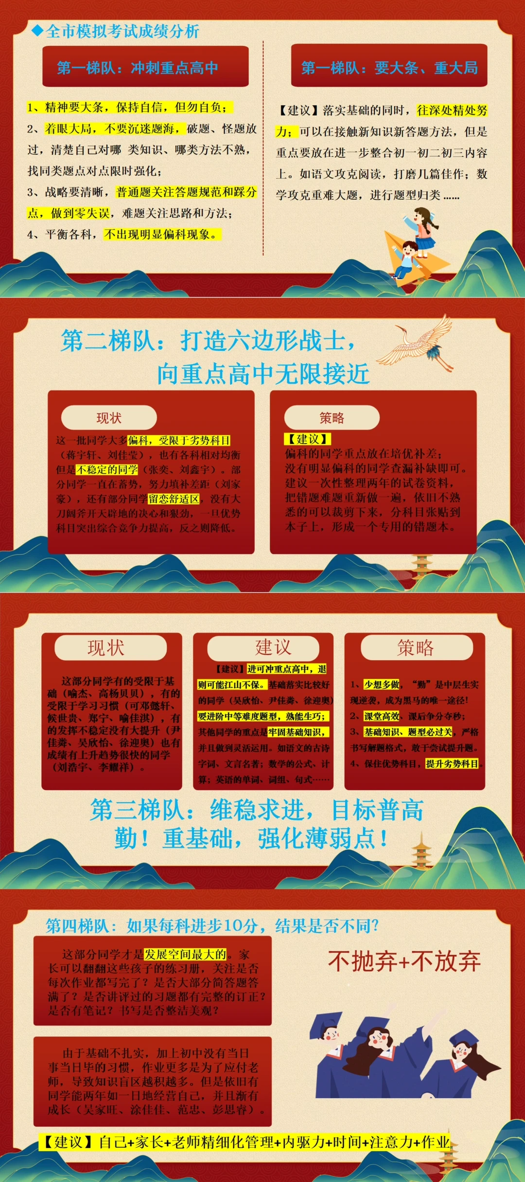 实际:成绩分析抓班级主体平均分,优秀率等,让学生自己写的成绩反思表格(现阶段分数vs目标院校分数),分析差距,对照模考排名,再给出建议冲刺院校。