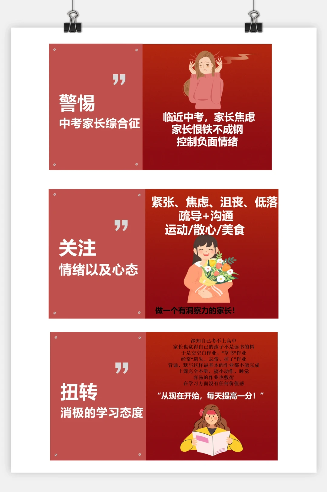 爱的魔法:无条件相信孩子,温柔又坚定的接纳孩子目前的现状,多陪伴和平等的沟通,多带孩子去看看院校,参加高中开放日活动,提前规划孩子读普高还是民办,做美食治愈孩子的辛苦,坚定的管理手机……