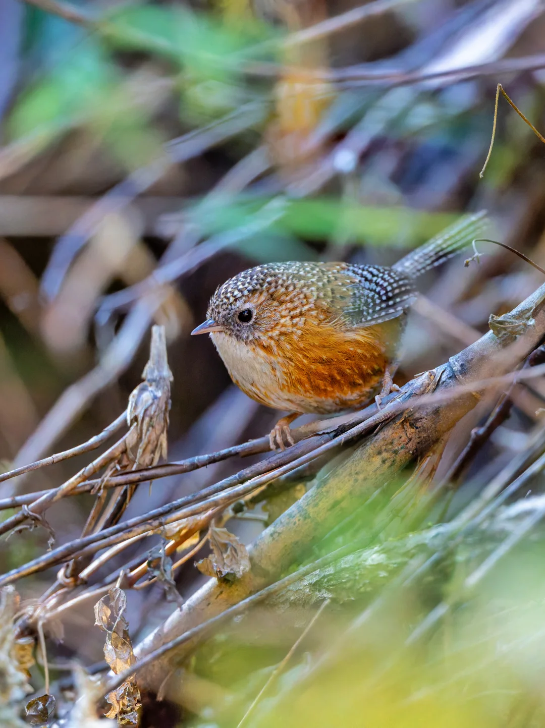 从名字上就知道又是一个小卤蛋,不过它颜色比较花,尾巴也比较长,就姑且叫它小花蛋吧。斑翅鹩鹛上体红褐色带有黑白色斑点,尾部和双翼上都有黑色细横斑,喉部白色。