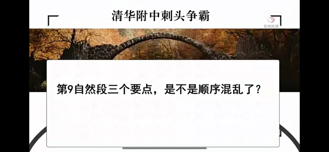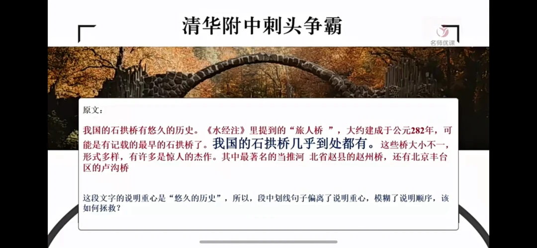 3.清华附中刺头争霸:这段文字的说明重心是“悠久的历史”,所以段中划线句子偏离了说明重心模糊了说明顺序,该如何拯救?(抢答)