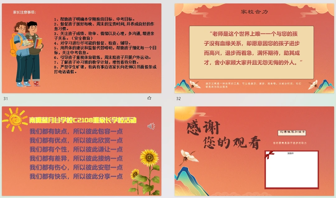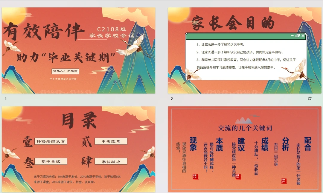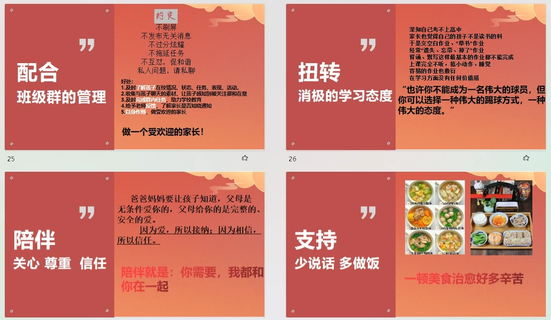此诚危急存亡之秋,让我看看还有哪些老师在开毕业班的家长会[拔草R] 本次家长会主题《有效陪伴,助力毕业关键期》 这套家长会课件我最满意的设计在于家长助力,以关键词的方式引导家长处理好初三关键期的亲子关系!这个时候美食能够慰藉学生的学习压力,陪伴就是最真挚的关心和爱!另外我把班级学生分为五层,提出期望和努力方向,给学生的建议,很有指导性!快来抄作业吧,有发言稿哦