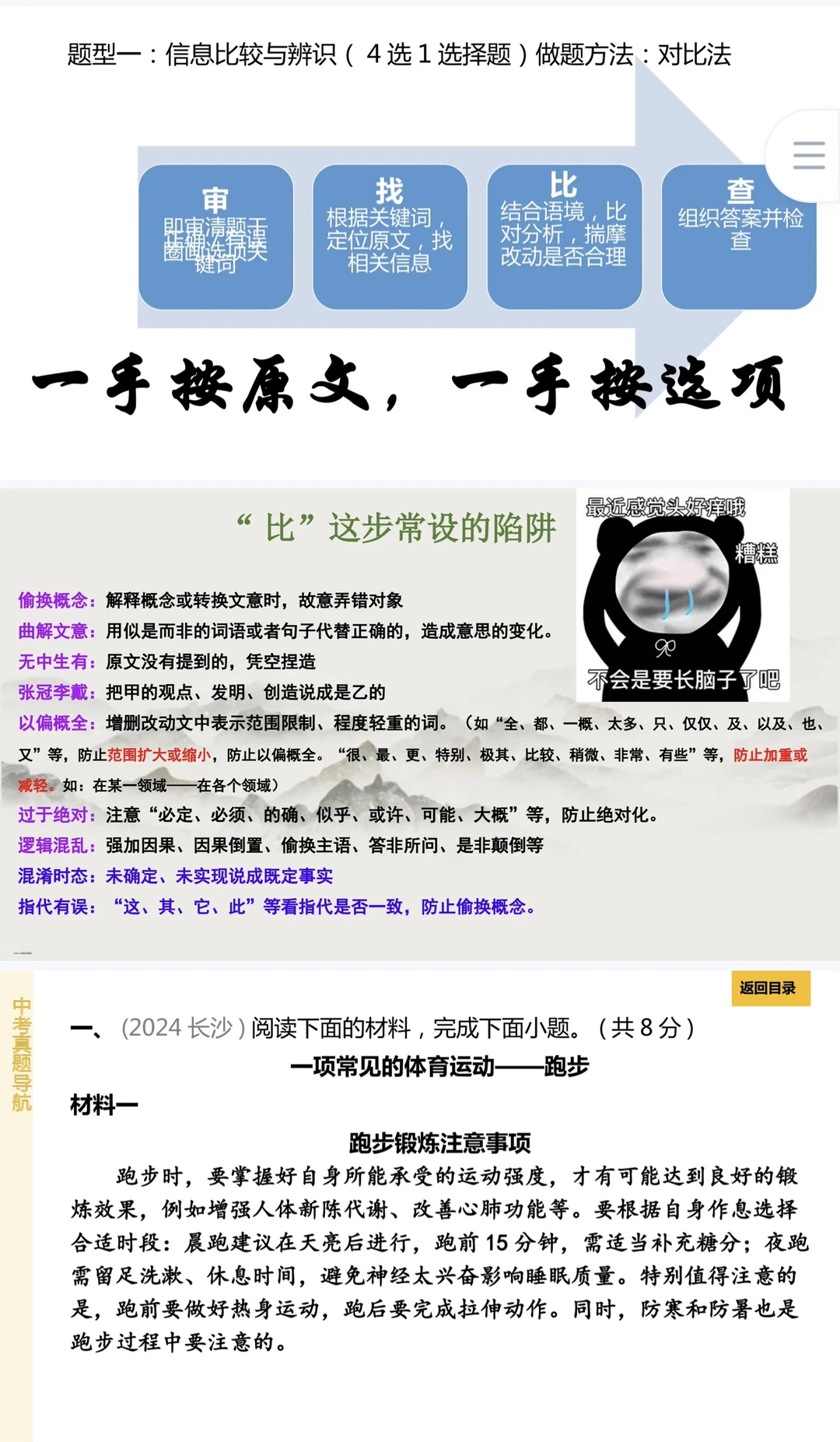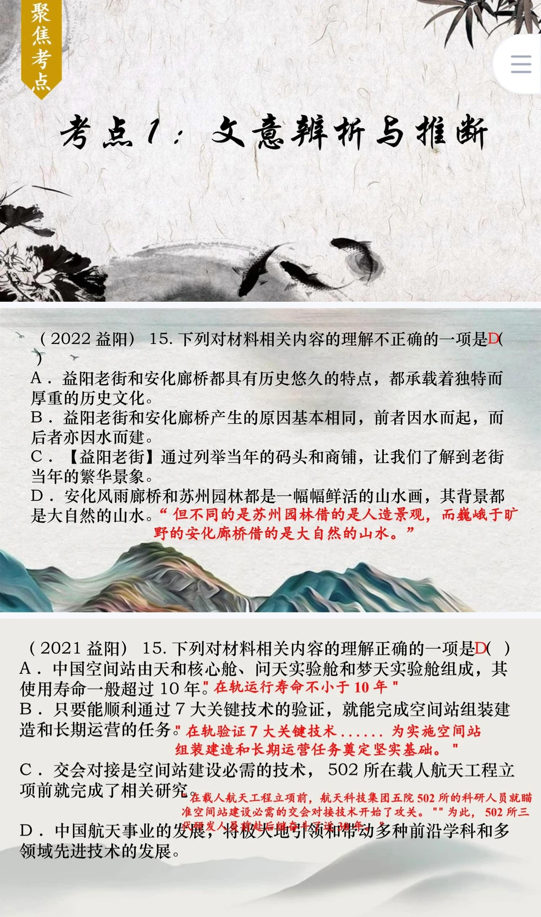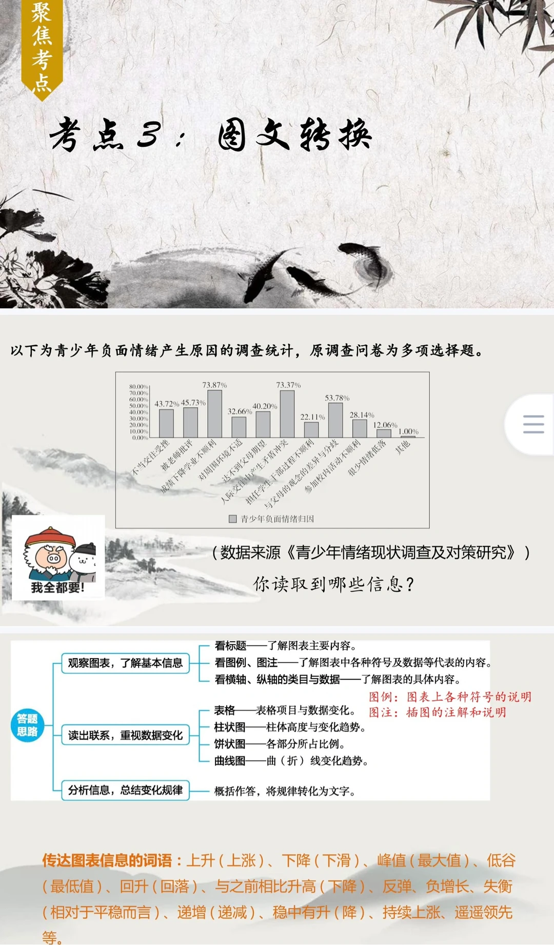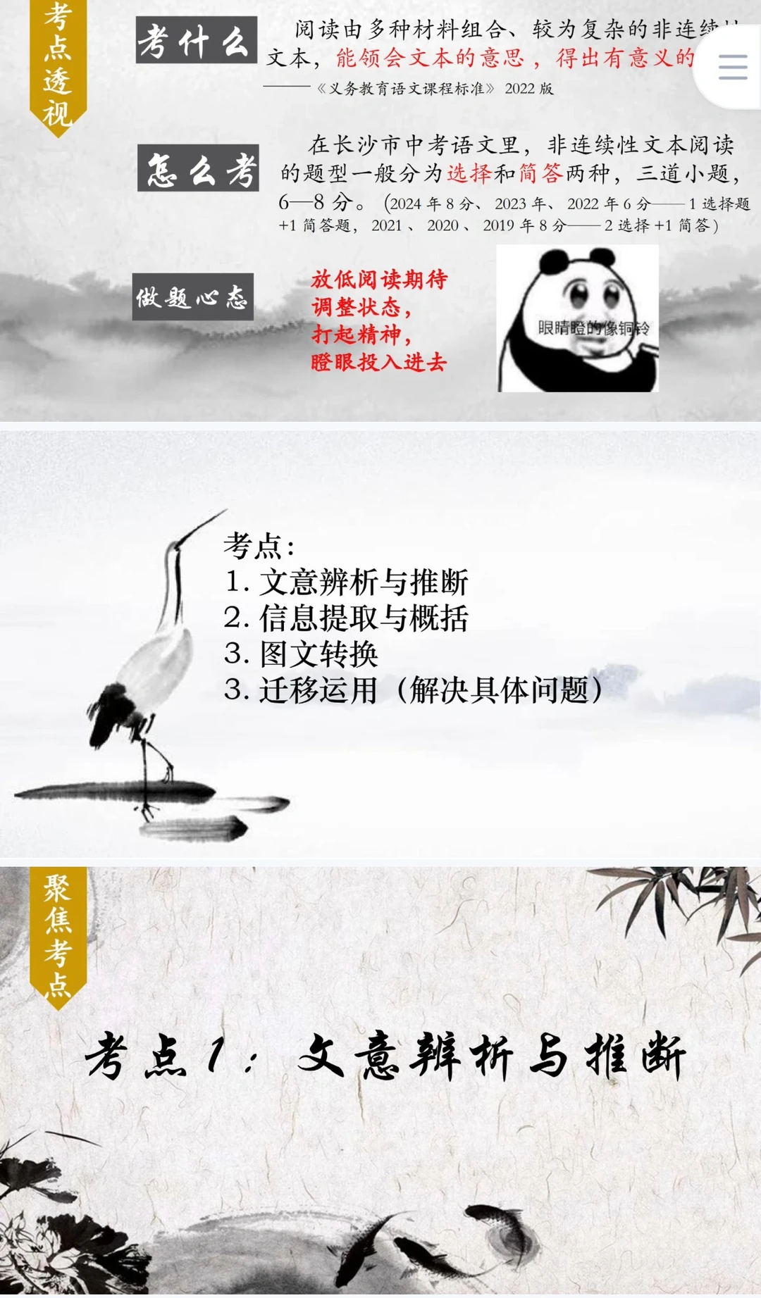 考点一:文意辨析与推断 考点二:信息提取与概括 考点三:图文转换 考点四:迁移运用(解决具体问题) 说文明文体知识梳理 议论文文体知识梳理 新增了图文转换以及更新了中考真题,新增了文体知识梳理,这样学习起来比较全面!