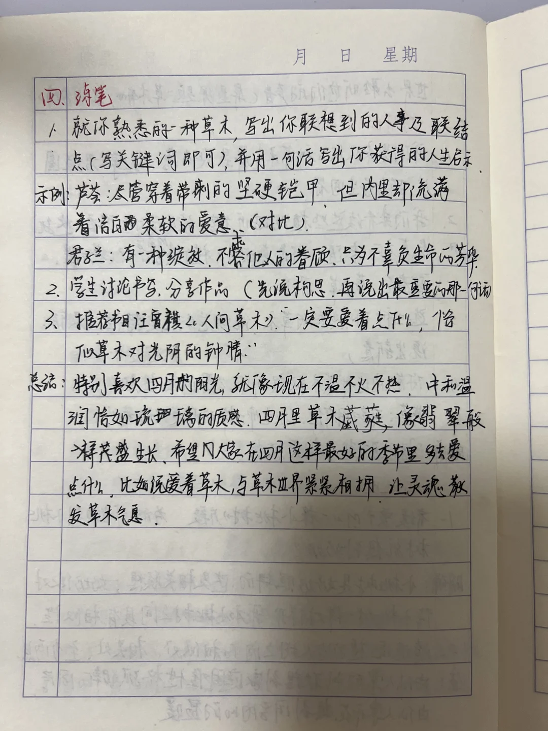 1.就你熟悉的一种草木,写出你联想到的人事及联结点(写关键词即可),并用一句话写出你获得的人生启示。