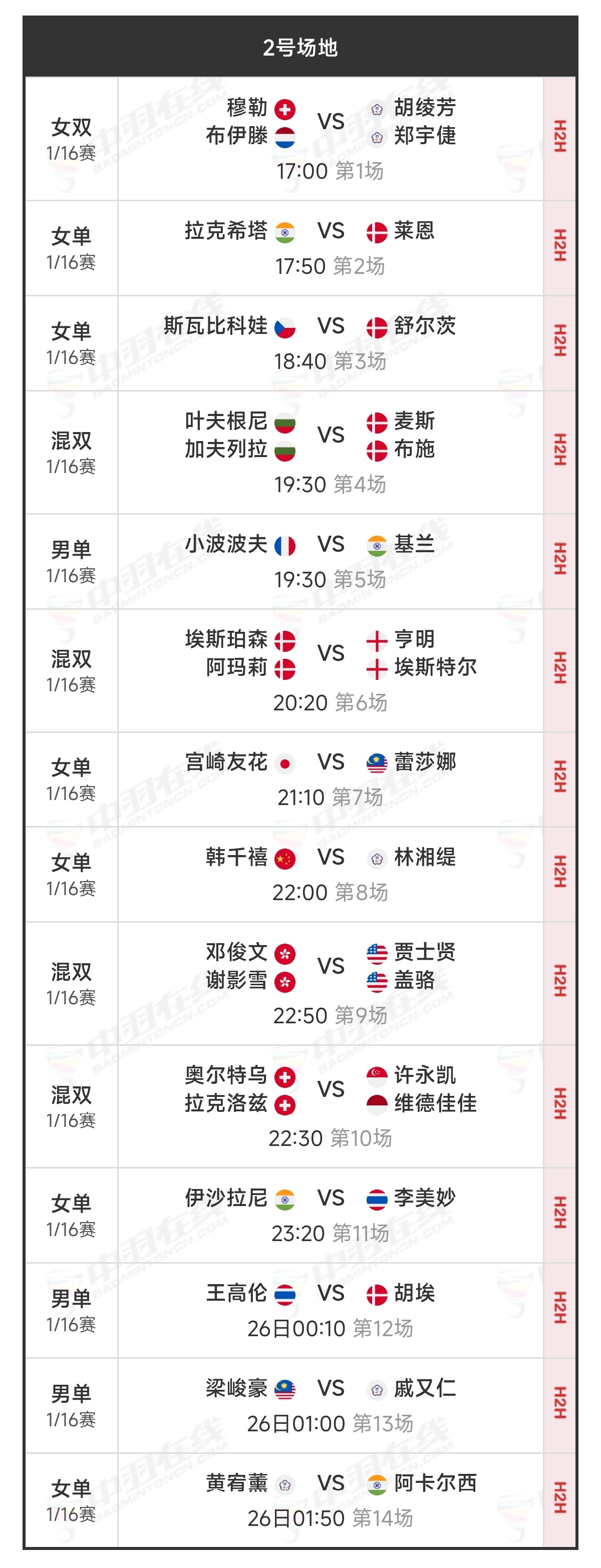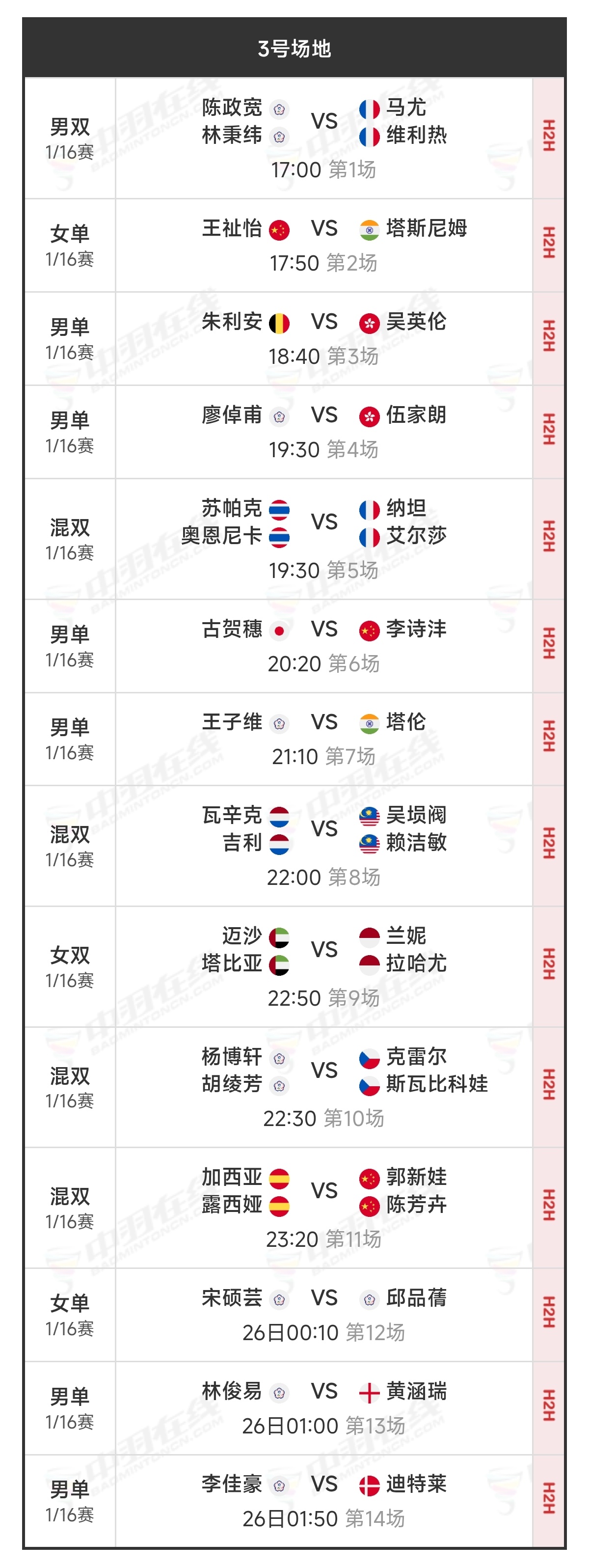 【3号场地】2、王祉怡🇨🇳 vs 🇮🇳塔斯尼姆6、李诗沣🇨🇳 vs 🇯🇵古贺穗11、郭新娃/陈芳卉🇨🇳 vs 🇪🇸加西亚/露西娅