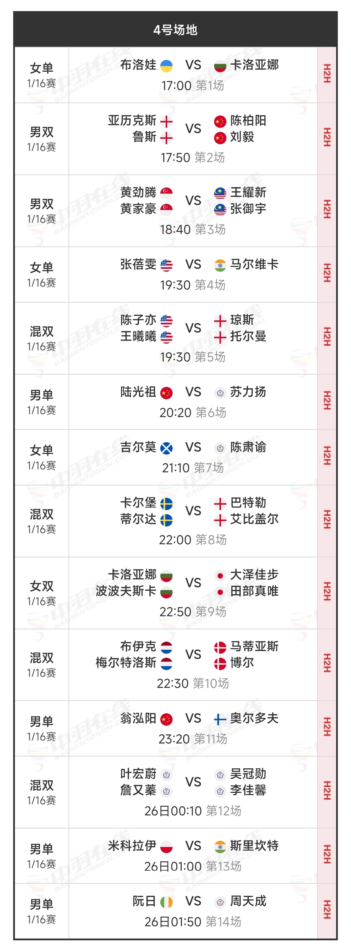 【4号场地】2、陈柏阳/刘毅🇨🇳 vs 🏴亚历克斯/鲁斯6、陆光祖🇨🇳 vs 苏力扬11、翁泓阳🇨🇳 vs 🇫🇮奥尔多夫 中国羽毛球队