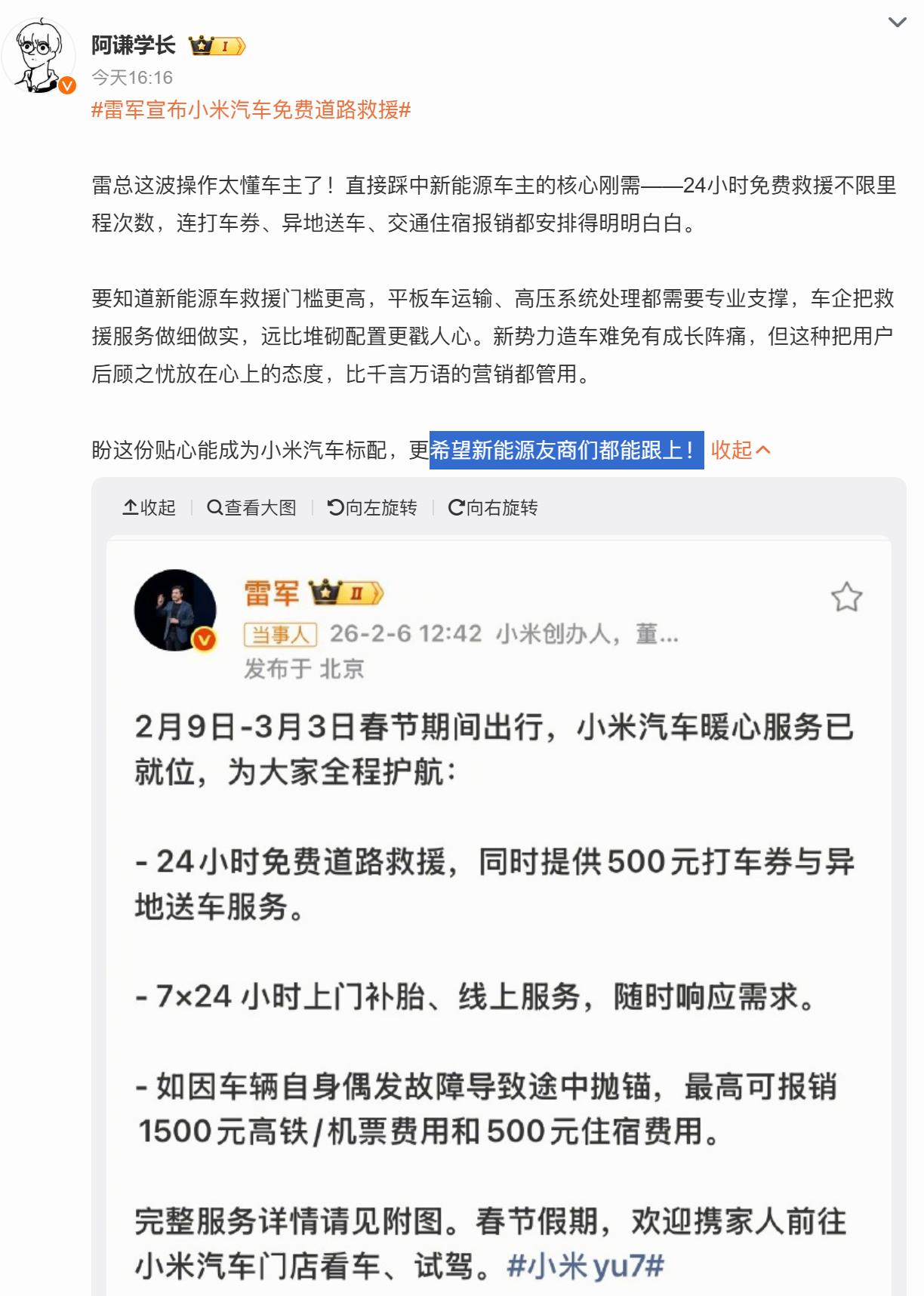 前两天看到有人喷@鸿蒙智行 这个全年全场景道路救援11.6万次,评论区一堆人喷“本来想吹救援服务的,反而暴露了自己事故率高”,还特意算了下平均每天救援317辆。 有没有可能别的品牌也不少,只是没统计或者怕多花钱没找官方救援而已?雷总给小米汽车春节期间暖心服务免费救援,KOL呼吁“希望新能源友商们都能跟上”,这个没毛病,建议所有车企都能像鸿蒙智行一样全年不限次数免费救援。 话说前两天我车门有点问题,直接一个电话,售后就带着工程师上门救援来了,都不用我开车去4s店,还有冬季上门健诊和春季健诊,别的不说,全年不限次数免费救援和售后服务这块鸿蒙智行还是很不错的。
