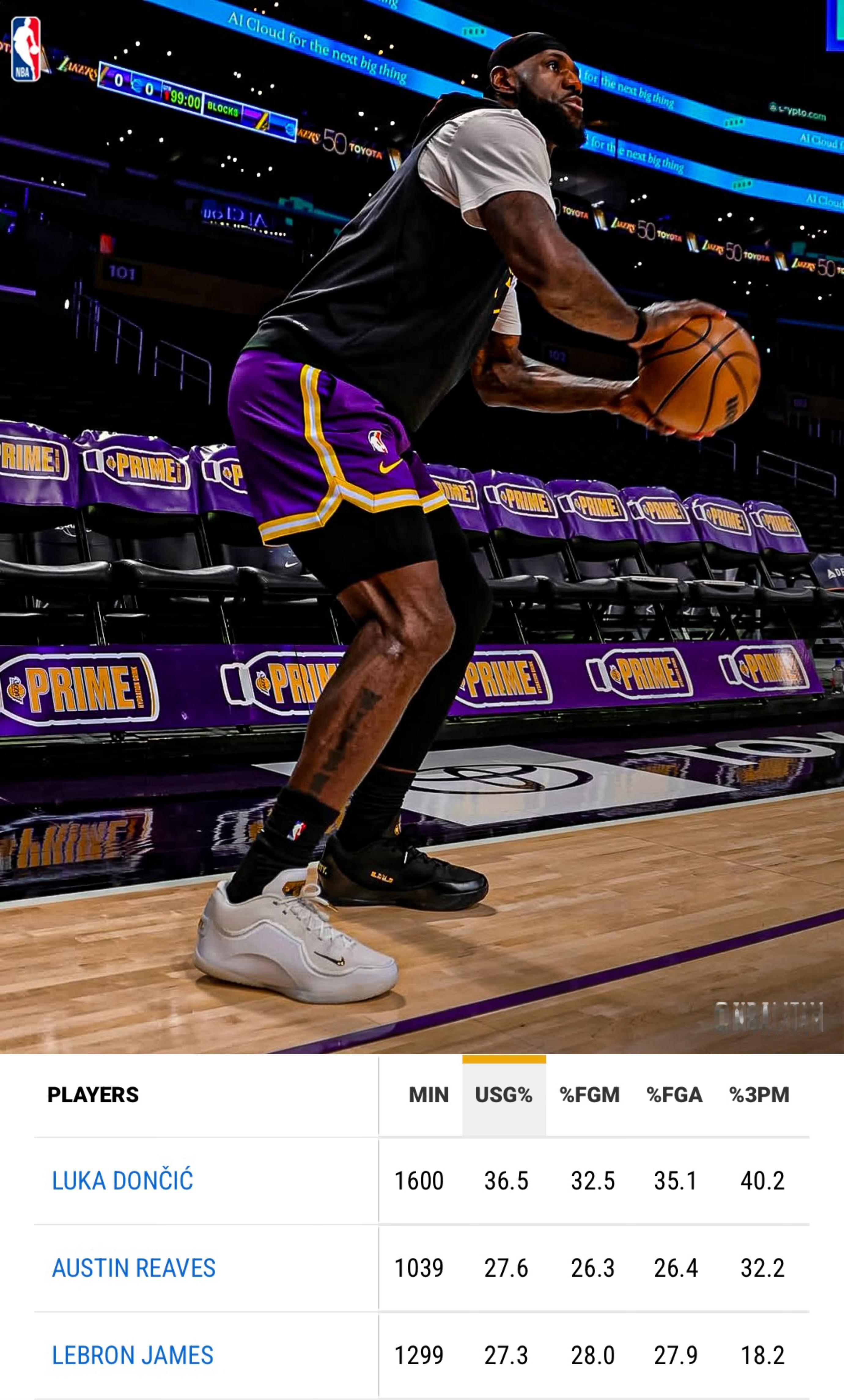 詹姆斯的球权占有率27.3%,排名联盟第32位。东契奇36.5%排名联盟第1位。里夫斯27.6排名联盟第30位。