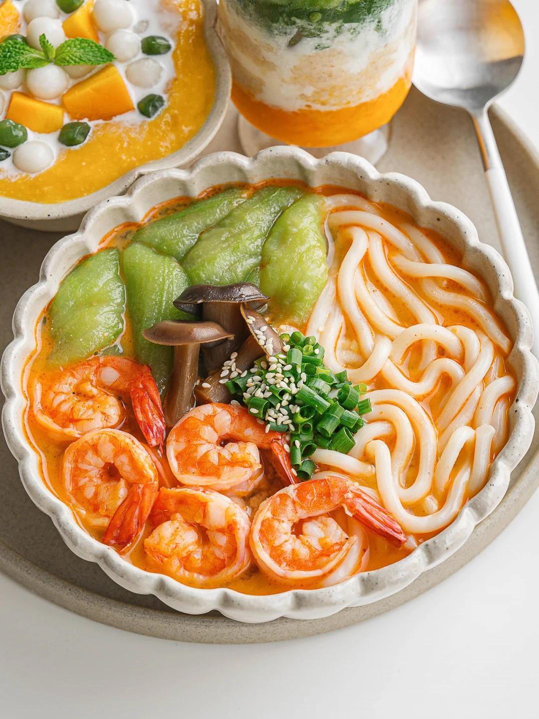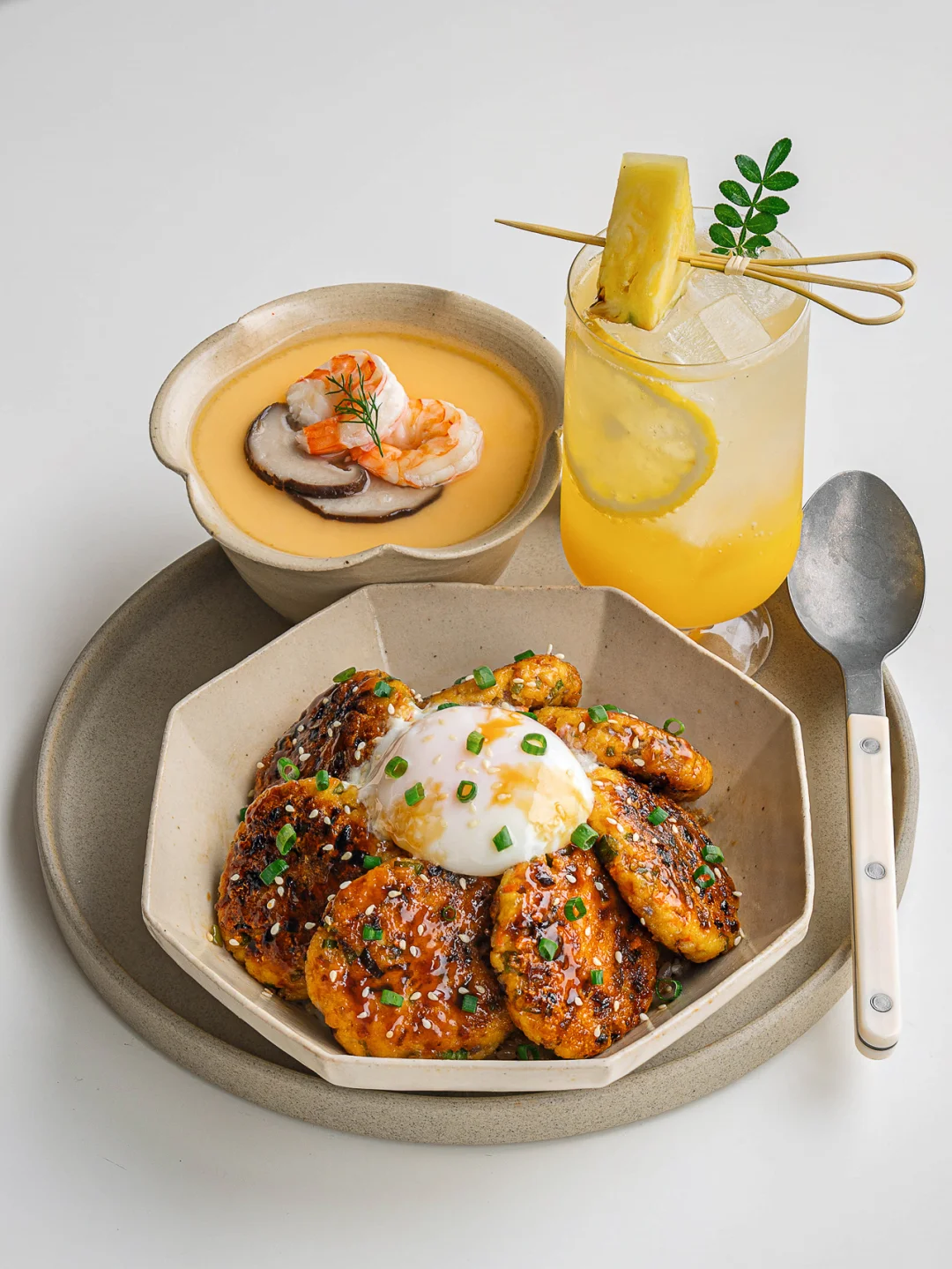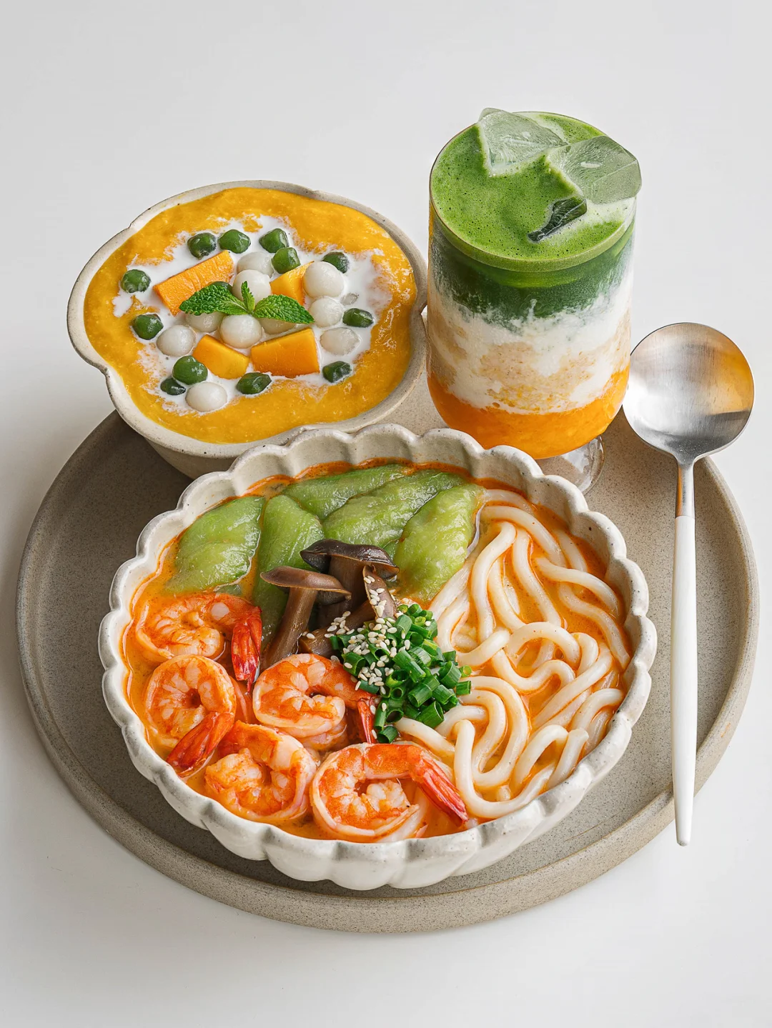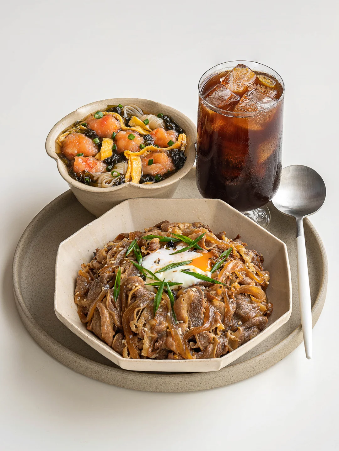 ❶纯素酱烧豆腐排盖饭+茶碗蒸+菠萝柠檬苏打 ❷土豆咖喱牛肉盖饭+黄豆粉红糖汤圆+肉桂热美式 ❸金沙丝瓜大虾乌冬面+多芒糯燕麦小圆子+芒芒抹茶糯燕麦牛乳 ❹日式肥牛藜麦饭+紫菜虾滑魔芋汤+冰美式