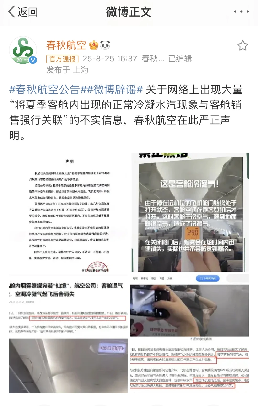 关于网络上出现大量“将夏季客舱内出现的正常冷凝水汽现象与客舱销售强行关联”的不实信息,春秋航空对此严正声明。