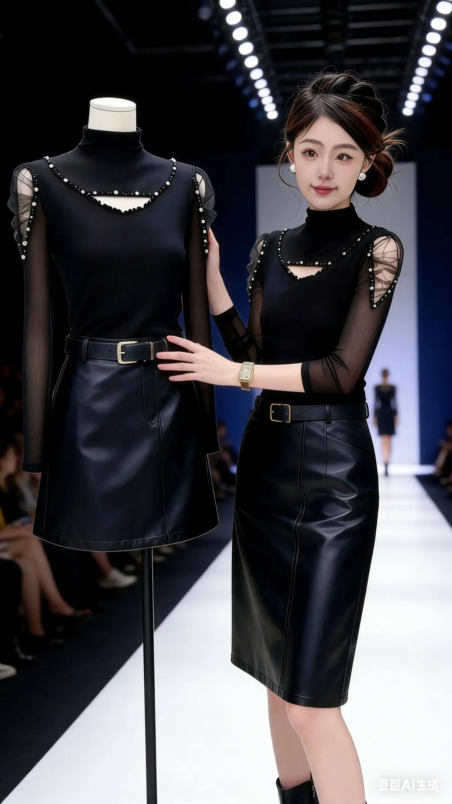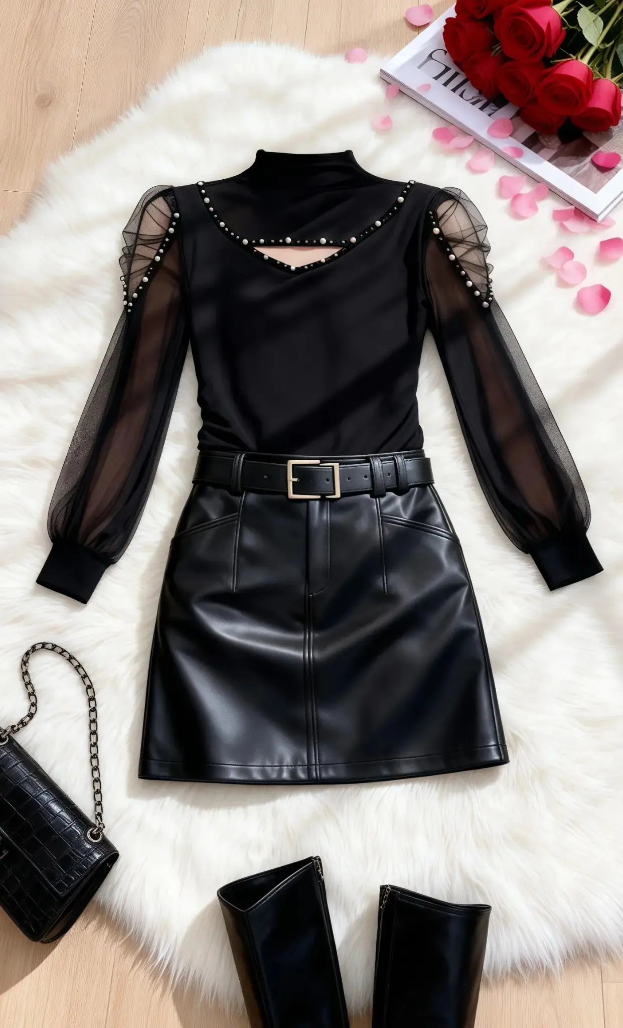 雨天穿搭|黑棕配色甜辣结界,把阴雨天穿出时尚氛围感 冷调雨幕笼罩街头,黑色网纱珍珠上衣搭配焦糖棕皮裙,轻松打造高级又有辨识度的甜辣造型。透视网纱温柔又精致,珍珠饰边点缀肩颈线条,轻奢有质感,胸前设计灵动不显单调。挺括皮裙利落显瘦,勾勒出好看腰线,与柔美元素形成刚柔并济的完美碰撞。 冷调氛围与穿搭质感相互呼应,将甜辣平衡拿捏得恰到好处。阴雨天从不是时尚的阻碍,一身精致穿搭出场,自带气场又显气质,让每一个雨天瞬间,都成为氛围感拉满的风格高光时刻。