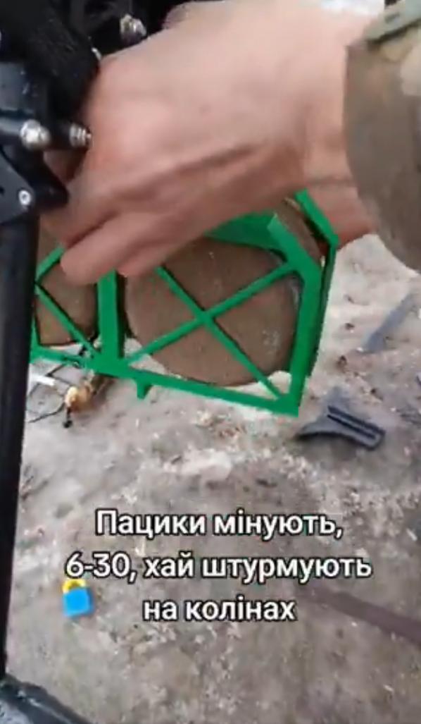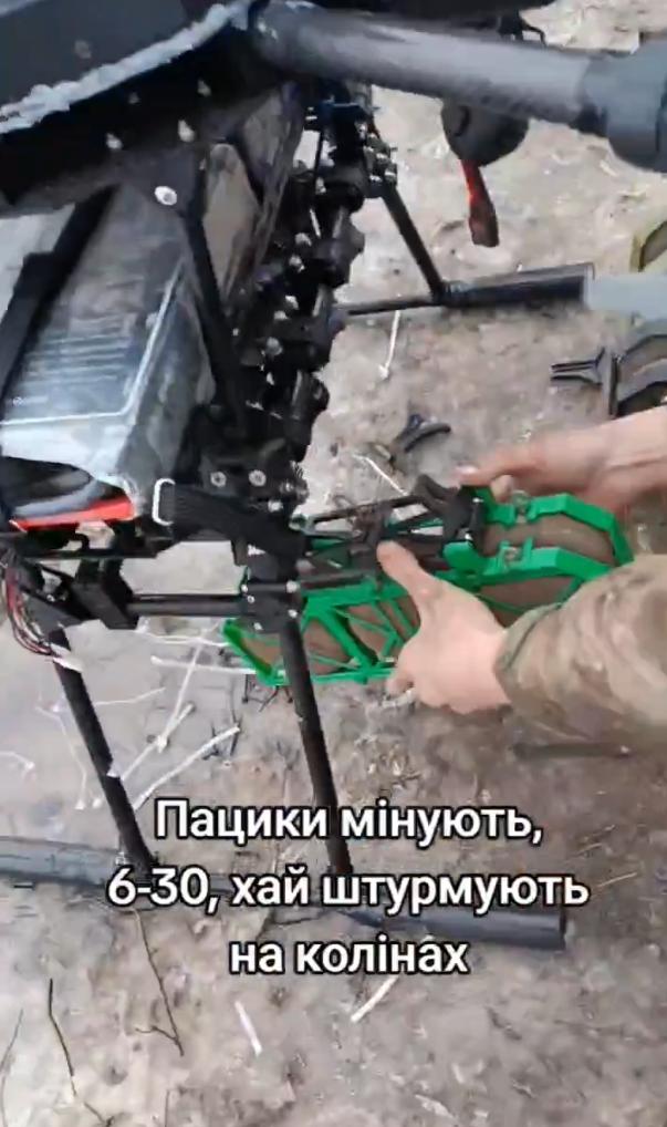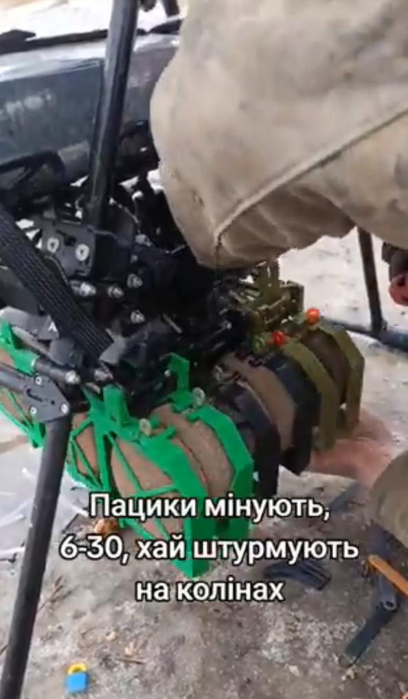 装有六枚乌克兰3D打印地雷(名为“椒盐卷饼”)的盒式装置被固定在一架名为“吸血鬼”的重型无人机下方。这四个盒式装置将被远程打开,散布这些压力激活装置,形成雷区。