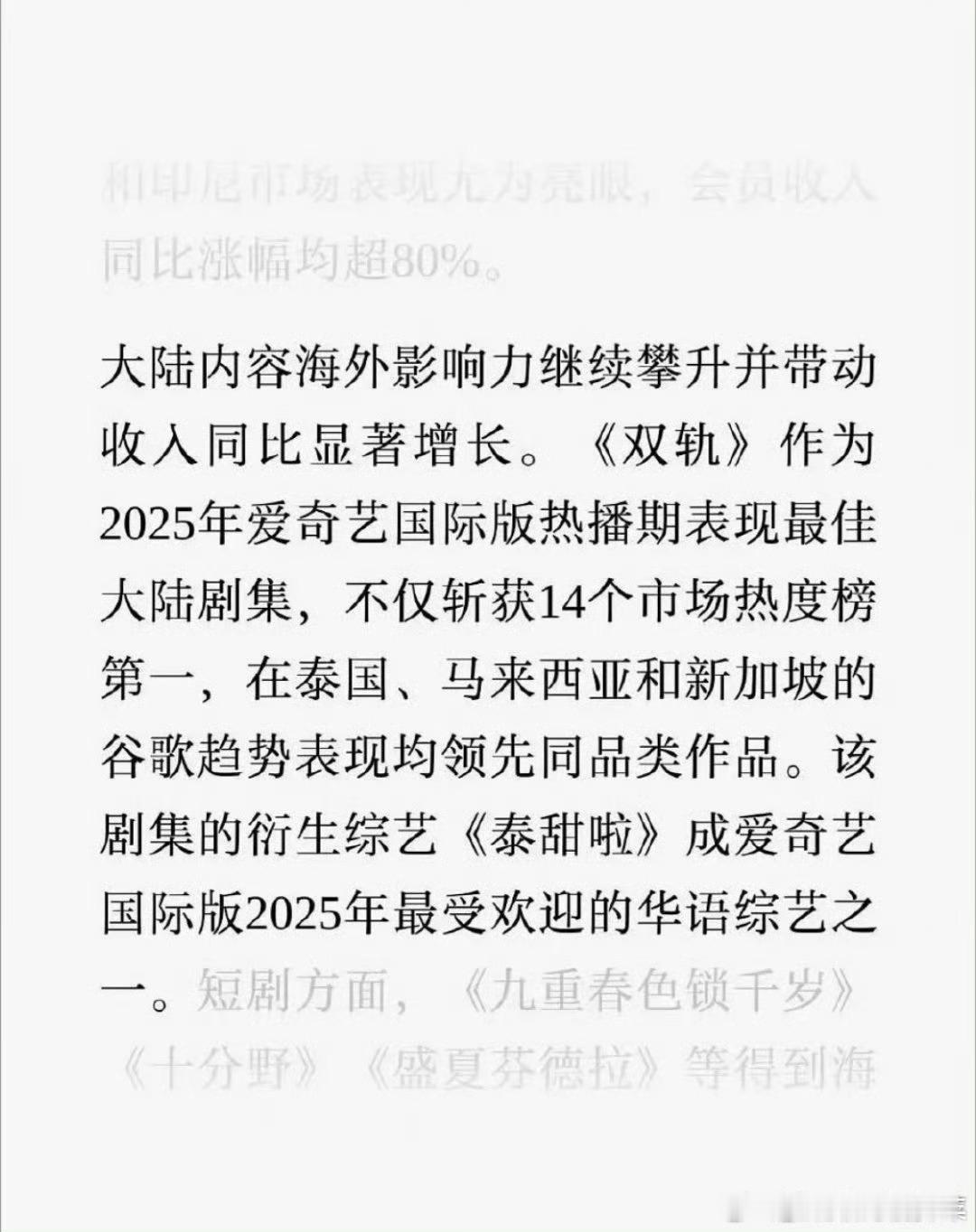 何与粉丝发文拒绝与虞书欣二搭,《双轨 》播的蛮好的啊,《双轨》还登上25年爱奇艺财报,是2025年爱奇艺国际版热播期表现最佳大陆剧集,衍生综艺《泰甜啦》也成为爱奇艺国际版2025年最受欢迎的华语综艺之一!海外影响力持续攀升