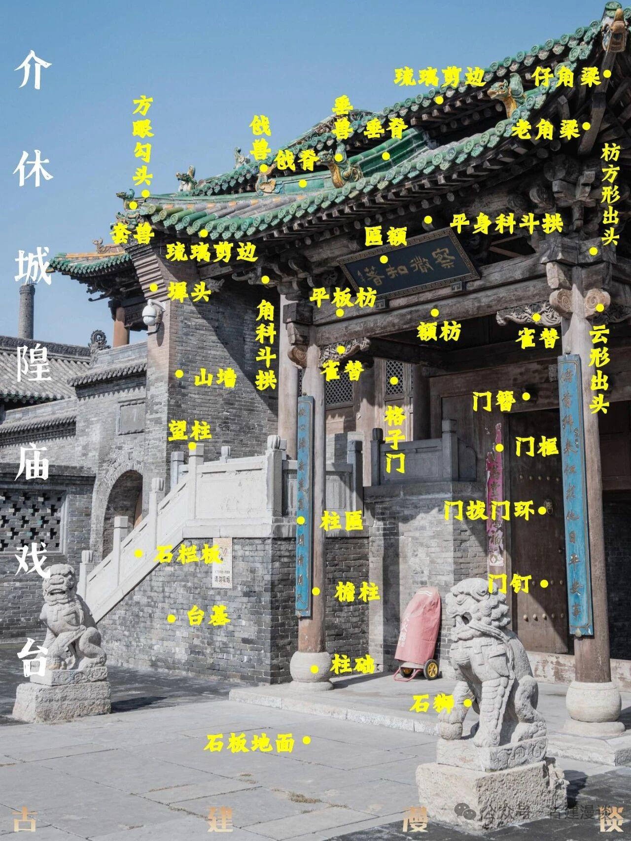 古建筑图解 | 山西介休城隍庙戏台 山西介休城隍庙戏台是该庙建筑群中的重要组成部分,为清代遗构,其建筑结构特征鲜明且工艺精湛。 戏台建于高1.35米的砖砌台基之上,台基正中设通道,形成一座过路式戏台,整体分为前台与后台两部分。前台面阔三间,进深四椽,采用单檐歇山顶,檐下斗拱为三踩单昂,正中悬挂“明白处”行书木匾,寓意戏台如人生明镜,演绎世间百态。后台面阔五间,进深四椽,屋顶为单檐卷棚硬山顶,其明间向前突出,建造了一间卷棚歇山顶的抱厦,使立面层次更为丰富。 戏台的屋顶装饰极为华丽,大量使用了黄、绿、蓝三色琉璃构件,包括脊刹、吻兽以及琉璃瓦方心,色彩鲜艳,历经数百年仍熠熠生辉,展现了晋地高超的琉璃工艺。在细部木作上,额枋之下施有精美的木雕花卉雀替,雕刻细腻生动,宛如木上生花,为建筑增添了独特的艺术魅力。 戏台两侧与仪门及清代所建的钟鼓楼并列,与轴线北端的正殿遥相呼应,共同构成了城隍庙一进院的核心景观。这座戏台不仅结构稳固,布局巧妙,融合了歇山、卷棚、硬山等多种屋顶形式,而且装饰集琉璃、木雕、彩绘于一体,是研究清代山西地方戏台建筑形制与装饰艺术的重要实物例证。 本篇就以图解的方式,和大家分享介休城隍庙戏台外观方面的一些细节构造。